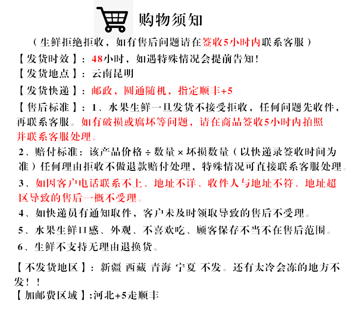 1、水果生鲜一旦发货不接受拒收,任何问题先收件,再联系客服。如有破损或腐坏等问题,请在商品签收24小时内拍照并联系客服处理。
