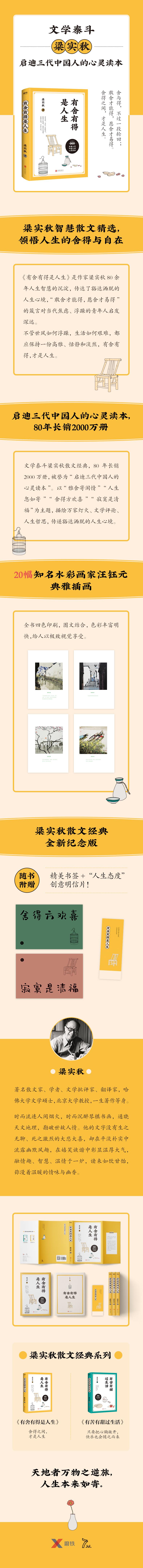 ★启迪三代中国人的心灵读本,80年长销2000万册 文学泰斗梁实秋经典散文精选集,80年长销2000万册,被誉为“启迪三代中国人的心灵读本”。 ★华语文学经典,根植于中国的文化底蕴,有广泛的影响力 全书统分四大章节,“雅舍寄闲情”“人生忽如寄”“舍得方欢喜”“寂寞是清福”,全面展现文学泰斗梁实秋的创作才情和成就。 ★书中传达的人生态度发人深省,启迪人心 《有舍有得是人生》是作家梁实秋80余年人生智慧的沉淀,传达了豁达洒脱的人生心境,“敢舍才能得,愿舍才易得”的箴言对当代焦虑、浮躁的青年人启发深远。 ★全书四色印刷,色彩丰富明快 配以20幅知名水彩画家汪钰元先生典雅插画,给人以很好视觉享受。 ★梁实秋散文经典全新纪念版:随书附赠精美书签+“人生态度”创意明信片!