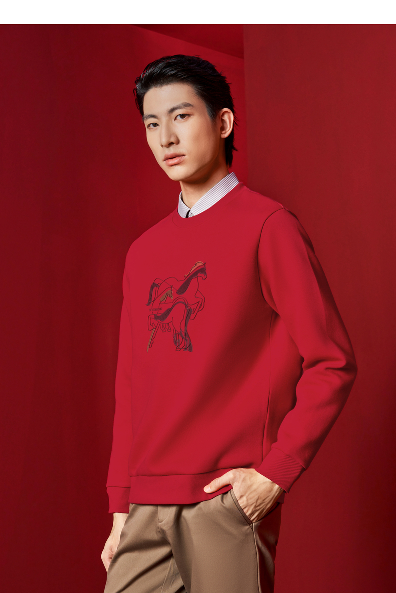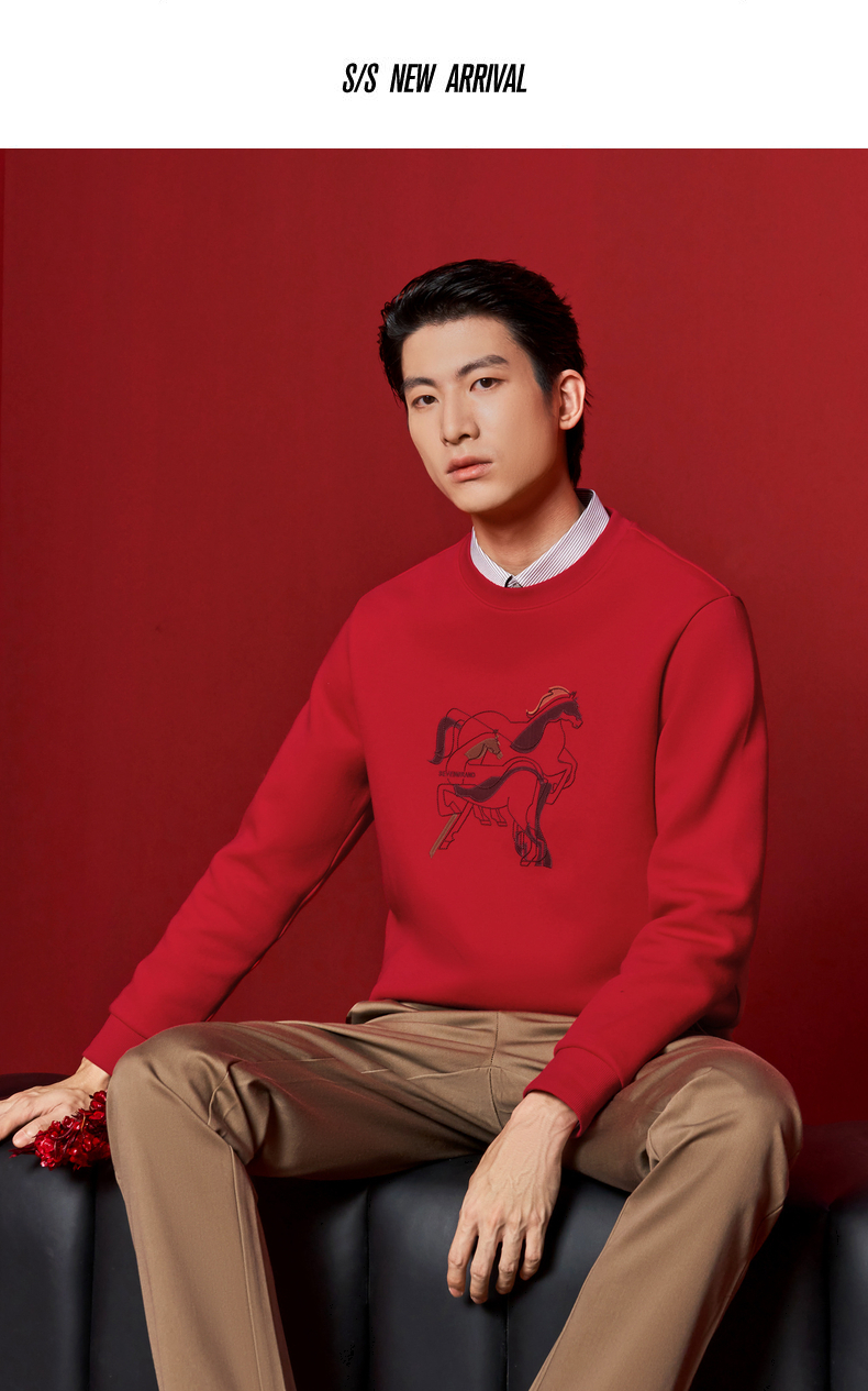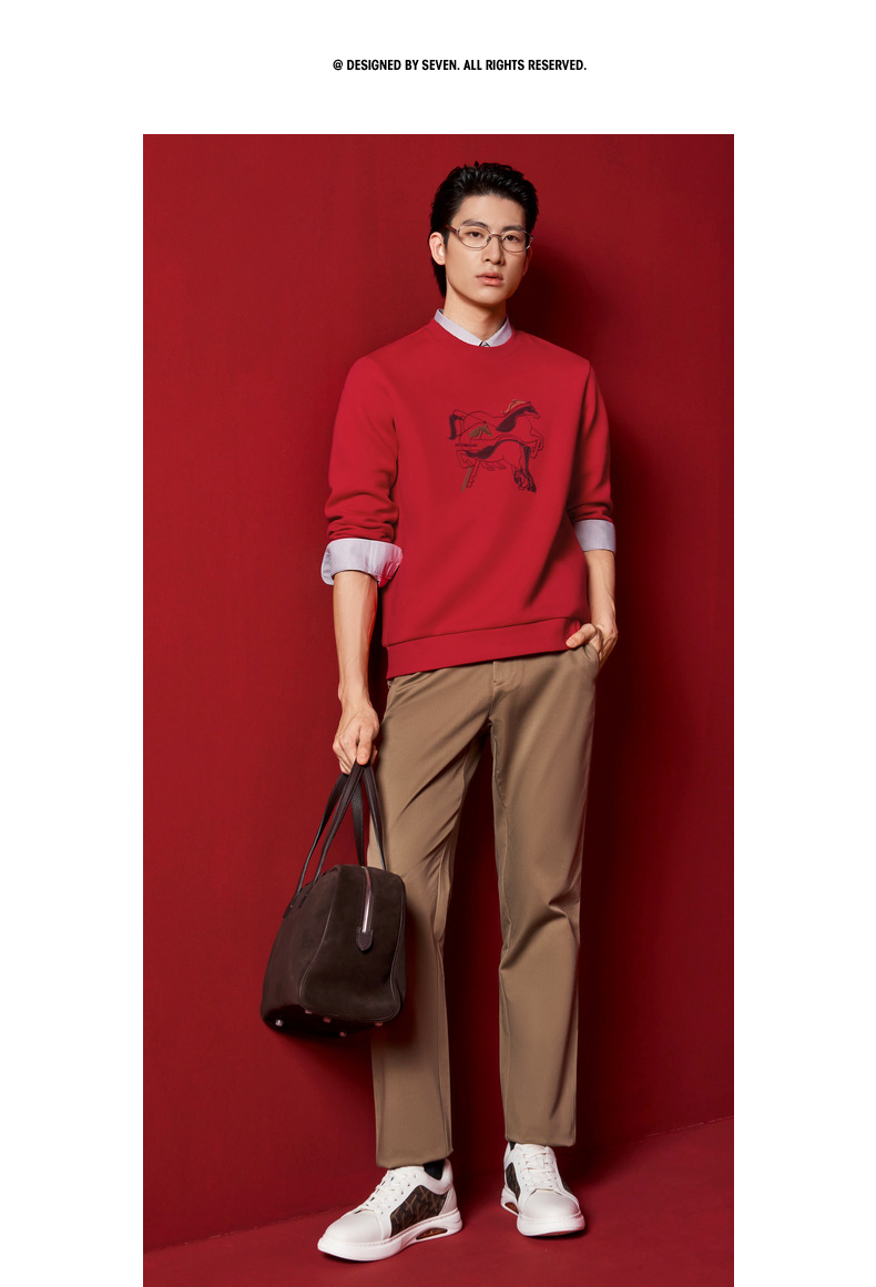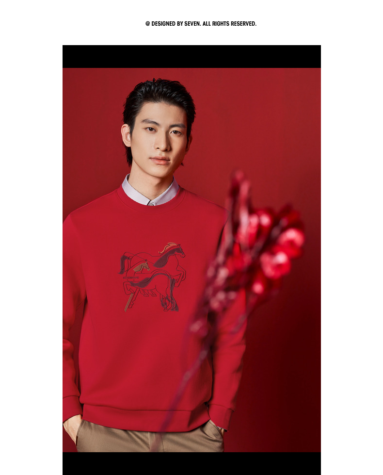 【新年系列】柒牌男装2026圆领弹力马年新疆棉长袖套头中青年卫衣