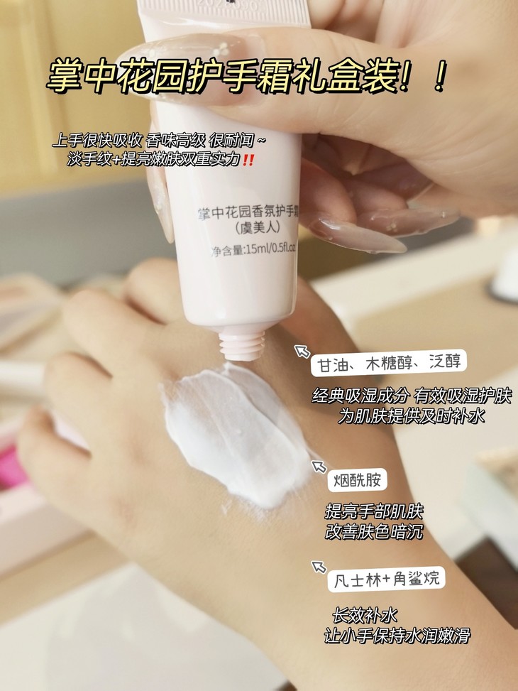 救命!这护手霜是偷了香水厂的配方了吧🥳🥳 🔺甘油、木糖醇、泛醇 经典保湿成分,能有效吸收空气中的水分 为肌肤提供即时补水 🔺矿脂(凡士林)、角鲨烷 在皮肤表面形成保护膜,防止水分流失,长效锁水 尤其适合干燥季节 🔺牛油果树果脂、白池花籽油 然植物油脂,富含脂肪酸,滋润而不油腻,提升肌肤柔软度 🔺烟酰胺预防老化、修复肌肤和减少手部暗沉越涂越白嫩!! 强强联手帮皮肤锁住水分 就算是干性肤质或角质受损的手‼️也能被养的滋润 成分温和安全,适配各种肤质✅ 送给朋友也不心疼,秋冬护手霜必不可少👏👏