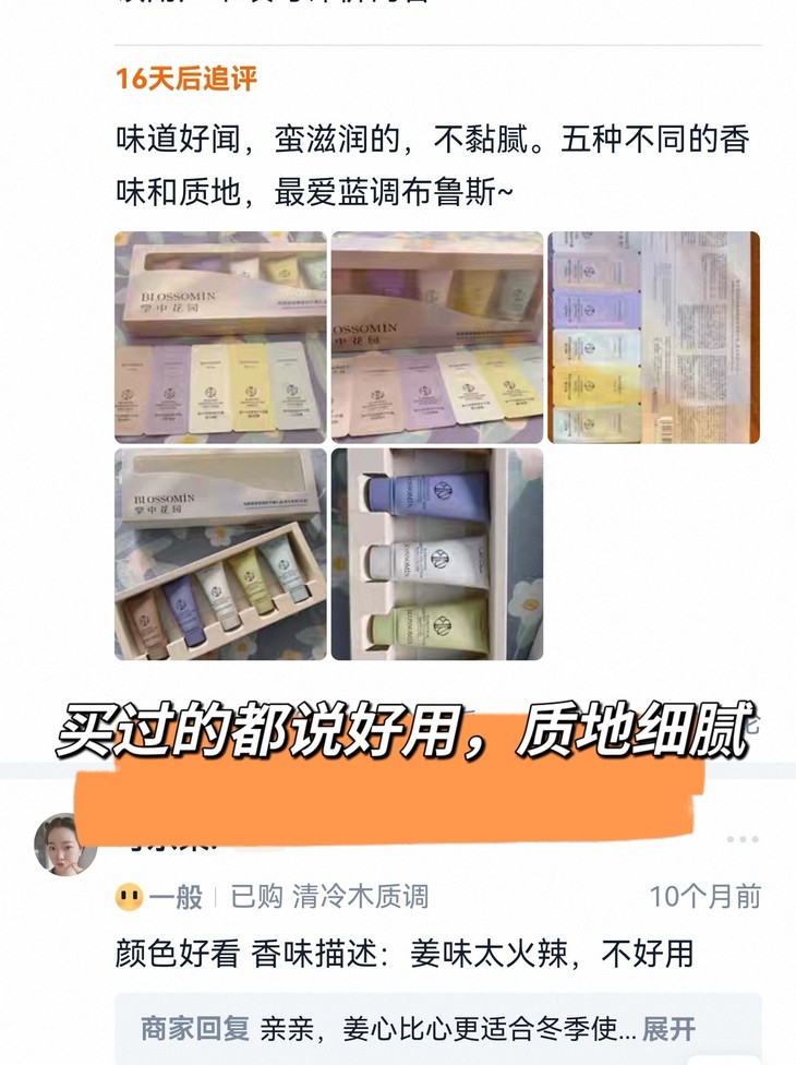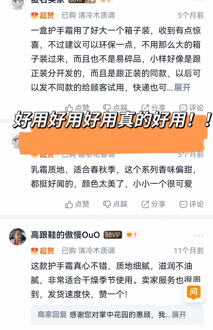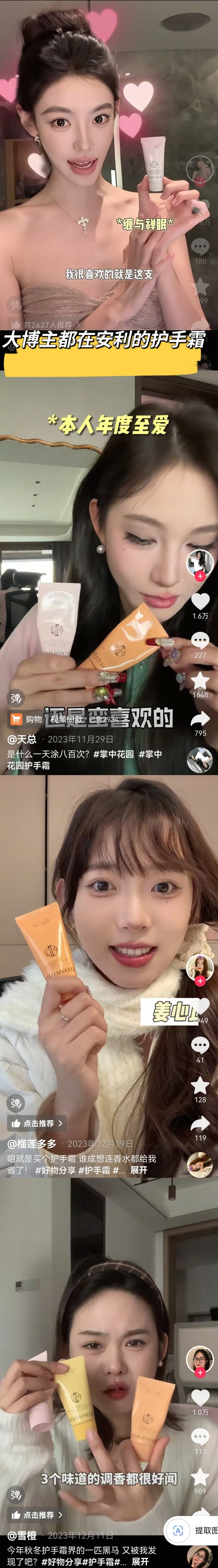 掌中花园护手霜×顶流博主联名合作 ▸ 联名10位百万粉生活/家居博主 ▸ 自带「博主同款」话题度,视频播放量均破500w+ 天猫各平台的购买评价都很好 也是我非常喜爱的品牌