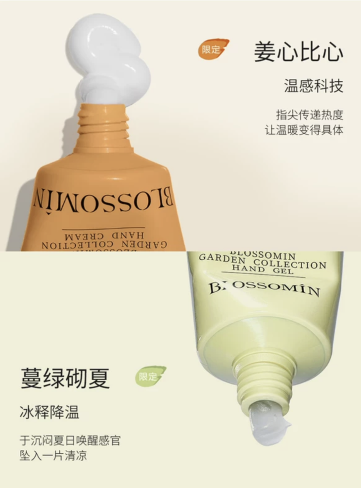 💯四季手护 国内首款「有温度」的护手霜 触肤温感技术——姜心比心 特别应用触肤温感技术,涂抹时会传递温热感 让温暖触手可及,冬天再也不怕护手霜太凉~ 触肤凉感技术——蔓绿砌夏🧊 晶露质地,夏天再也不怕护手霜太油~融合了冰释降温因子 涂抹处会传递清凉感,降温却不刺激。带你逃离炎炎夏日,坠入清凉秘境。