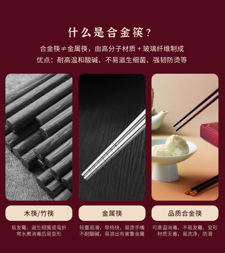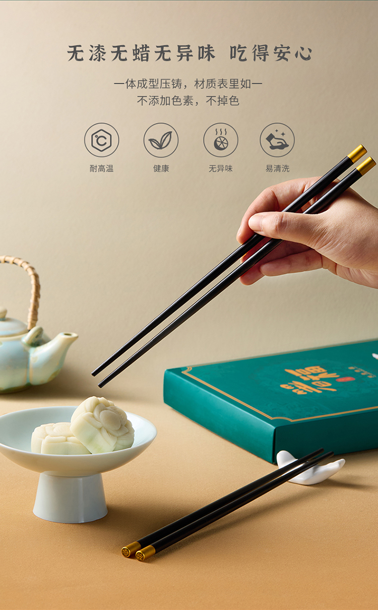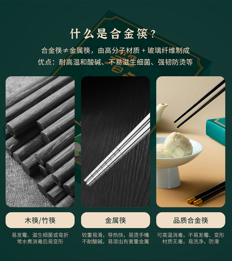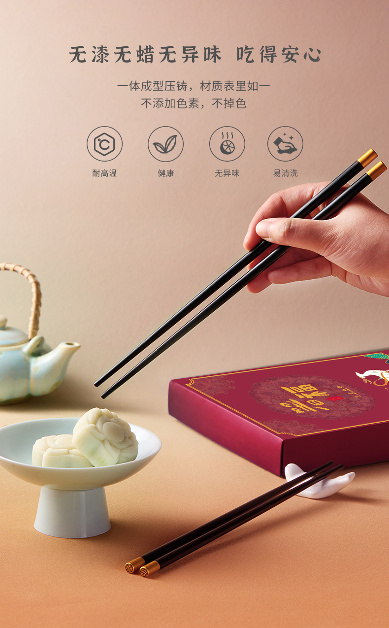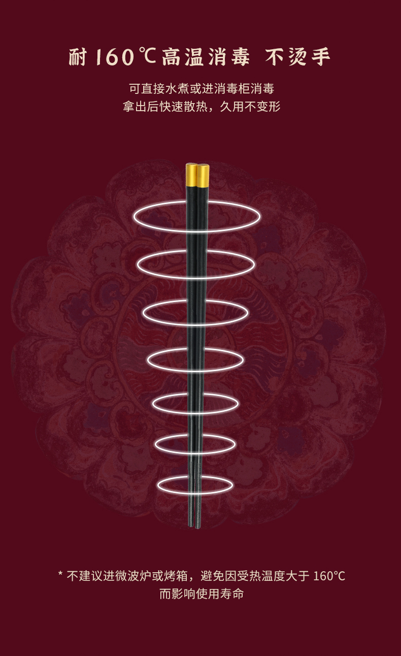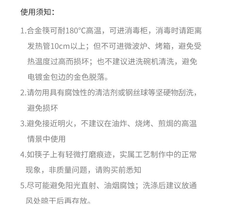 【使用须知】1.合金筷可耐180°C高温,可进消毒柜,消毒时请距离