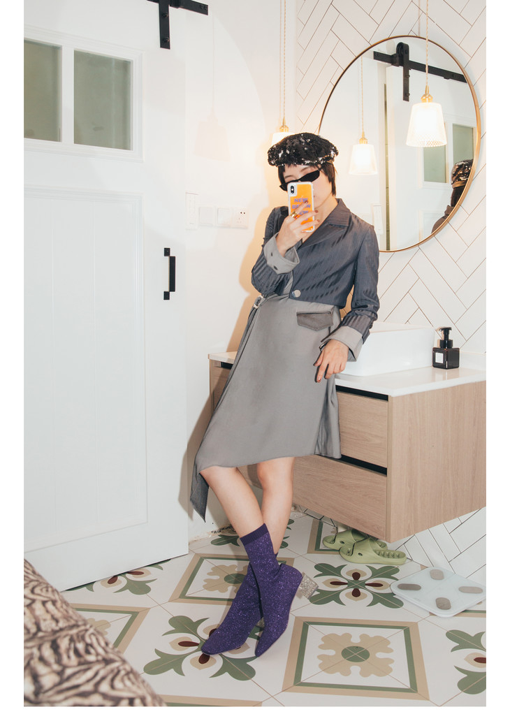lost in echo2019秋季新款深紫色银箔短袜靴女 高弹飞织水晶跟方跟女鞋