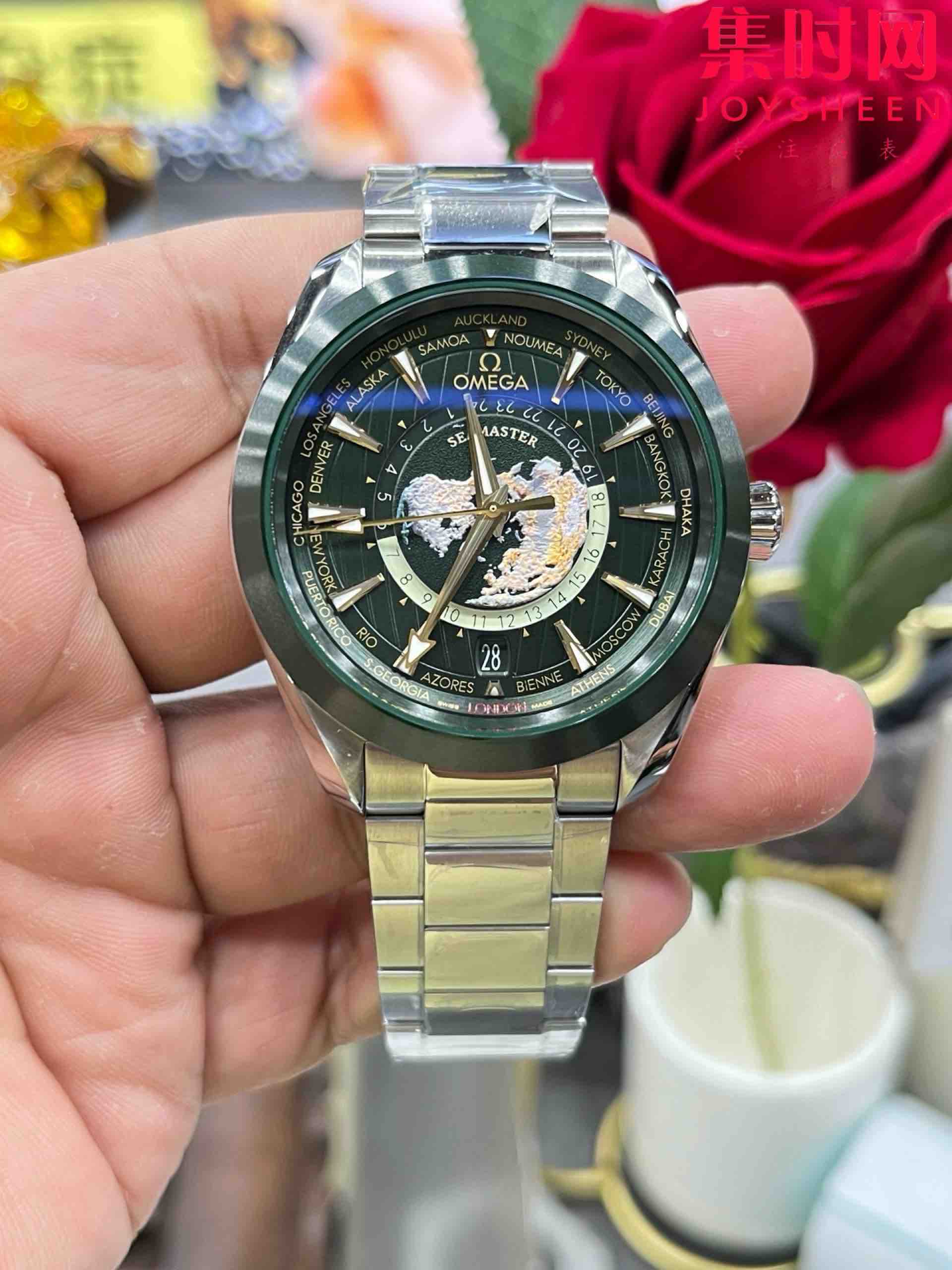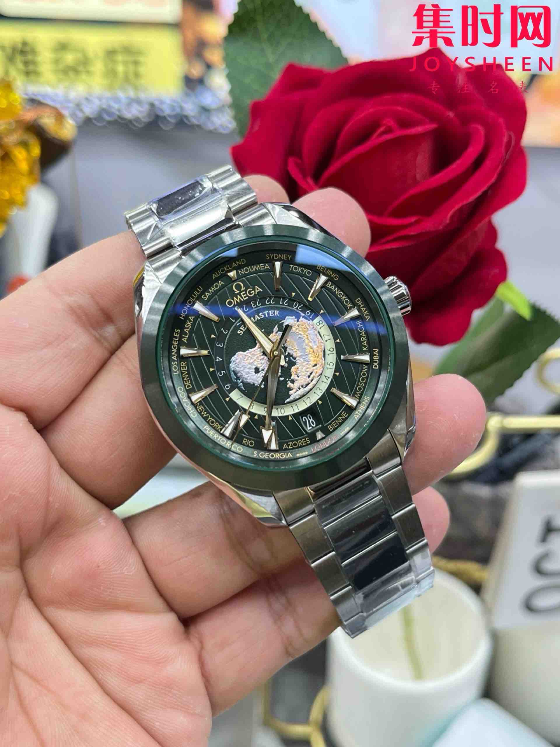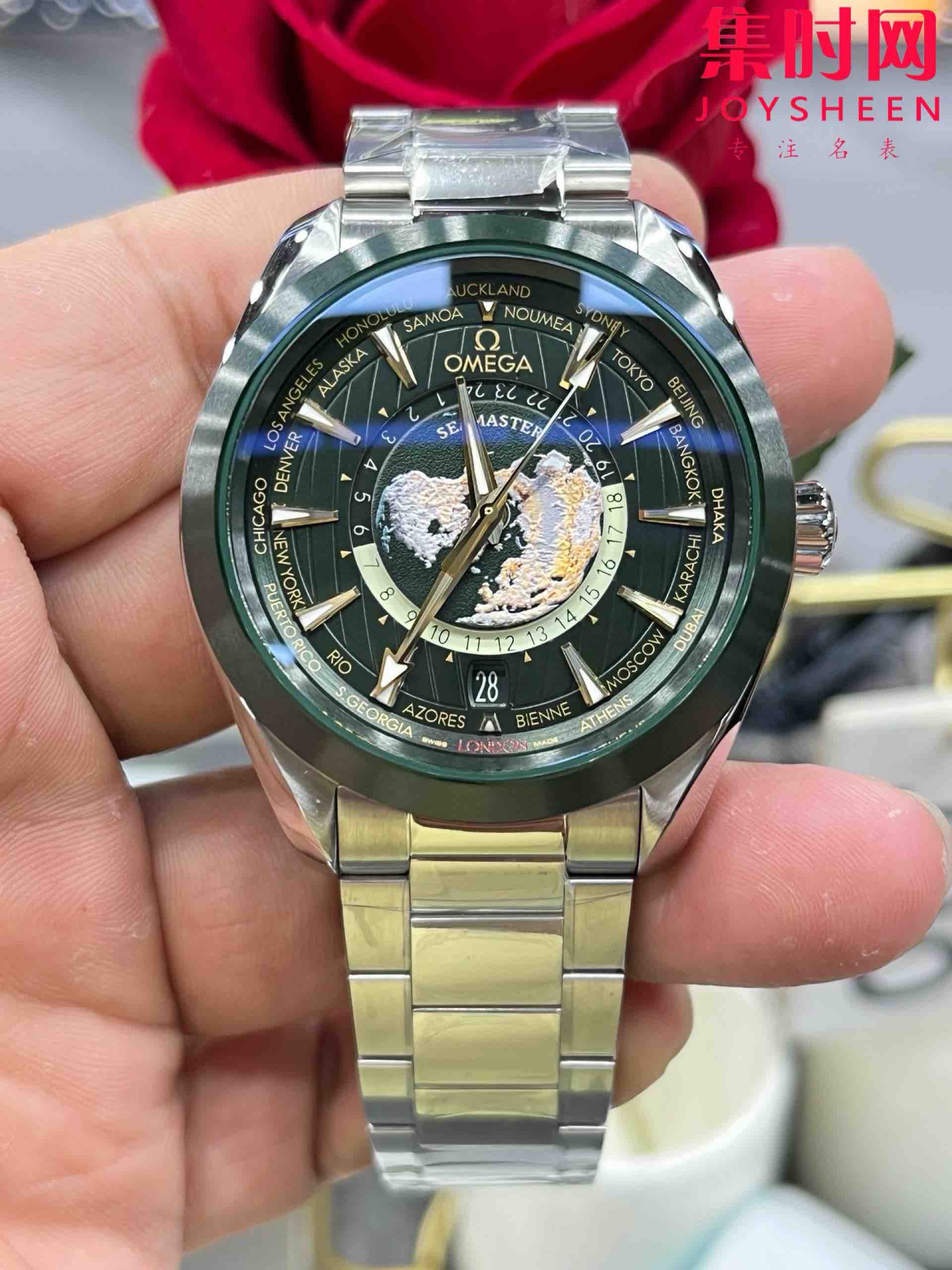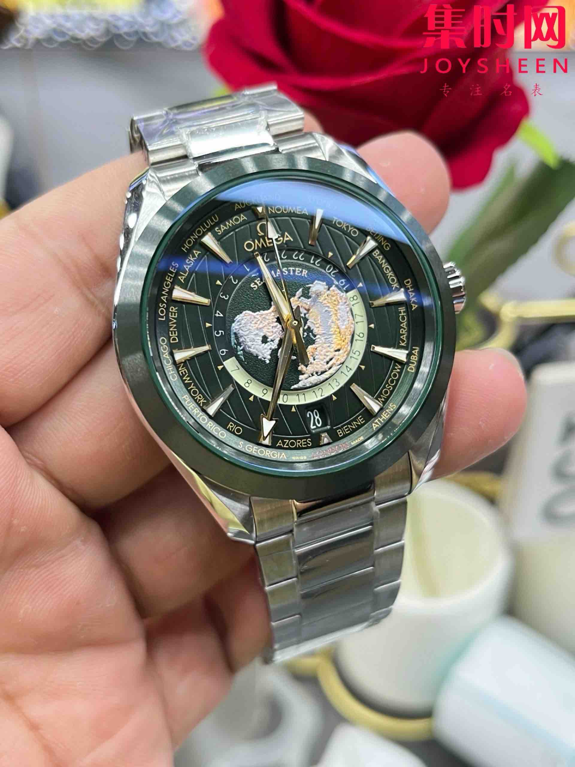 VS欧米茄新款海马世界时系列 VS海马世界时墨绿 绿海马 海马世界时绿色款 男士腕表 表径43mm Aqua Terra 世界时腕表。一款可以戴着环游世界的世界时腕表,激光烧蚀蓝色海洋,陆地浮雕勾勒,24小时hesalite水晶环。辽阔世界尽在掌握,于方寸之间伴您开启环球之旅!搭载VS定制Cal.8938多功能全自动机械机芯,蓝宝石水晶镜面,316L精钢表壳,陶瓷圈口,316L精钢表带,原装折叠扣,功能同步原装真实可用!表径43mm