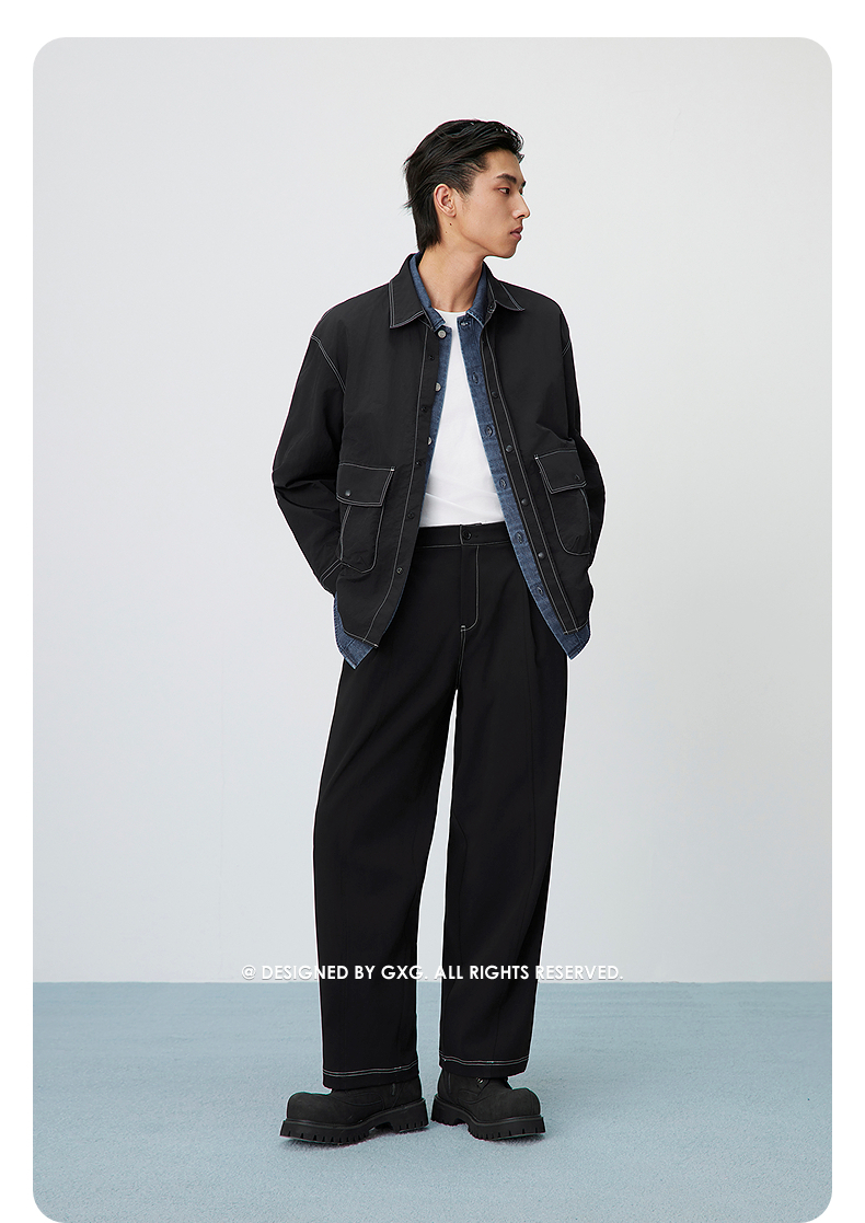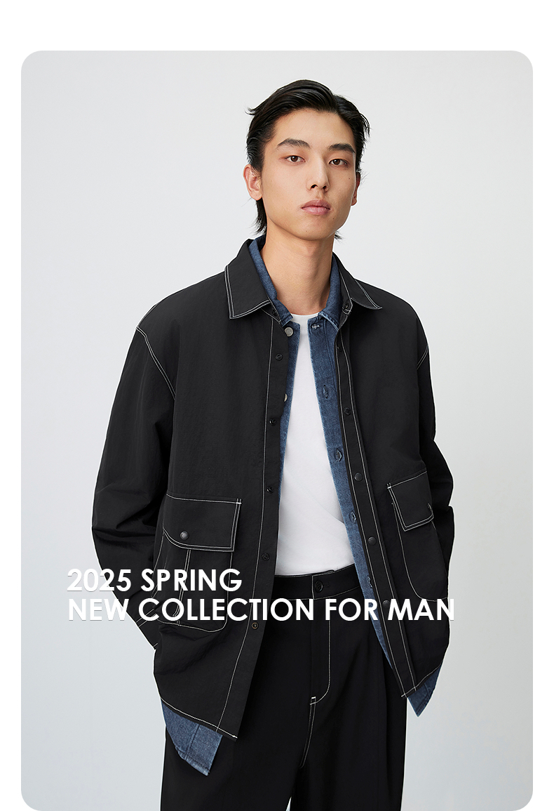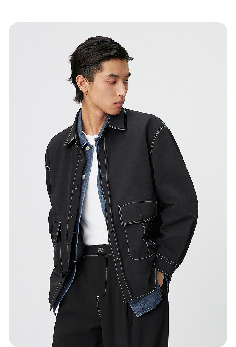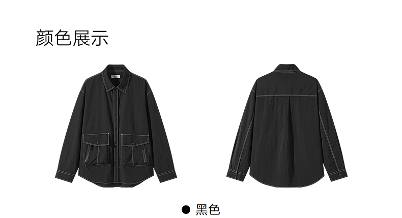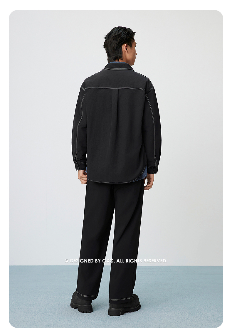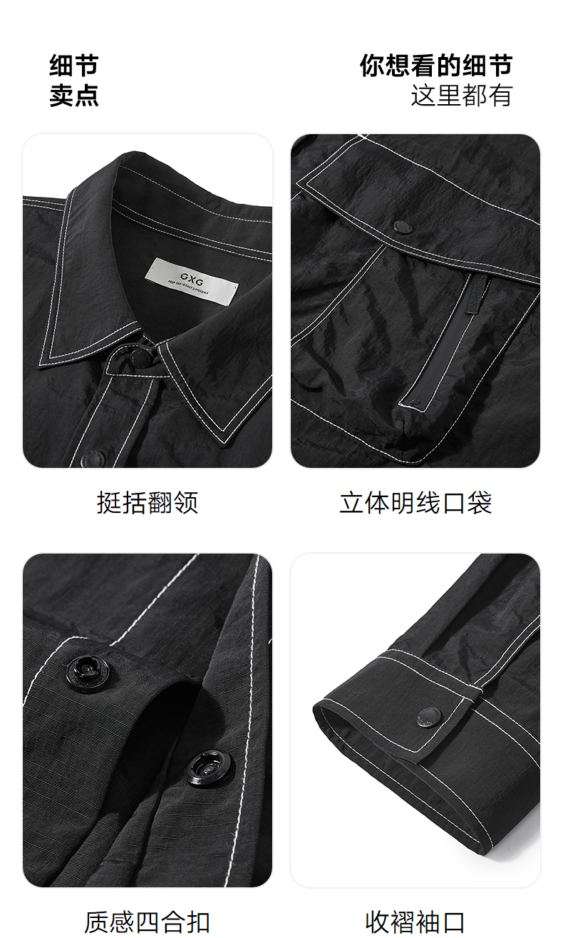 GXG男装 黑色明线设计休闲通勤翻领长袖衬衫外套 25年春热卖