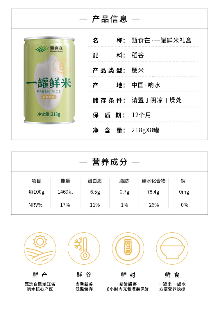 甄食在 8小时内充氮保鲜 一罐鲜米 218g*8罐