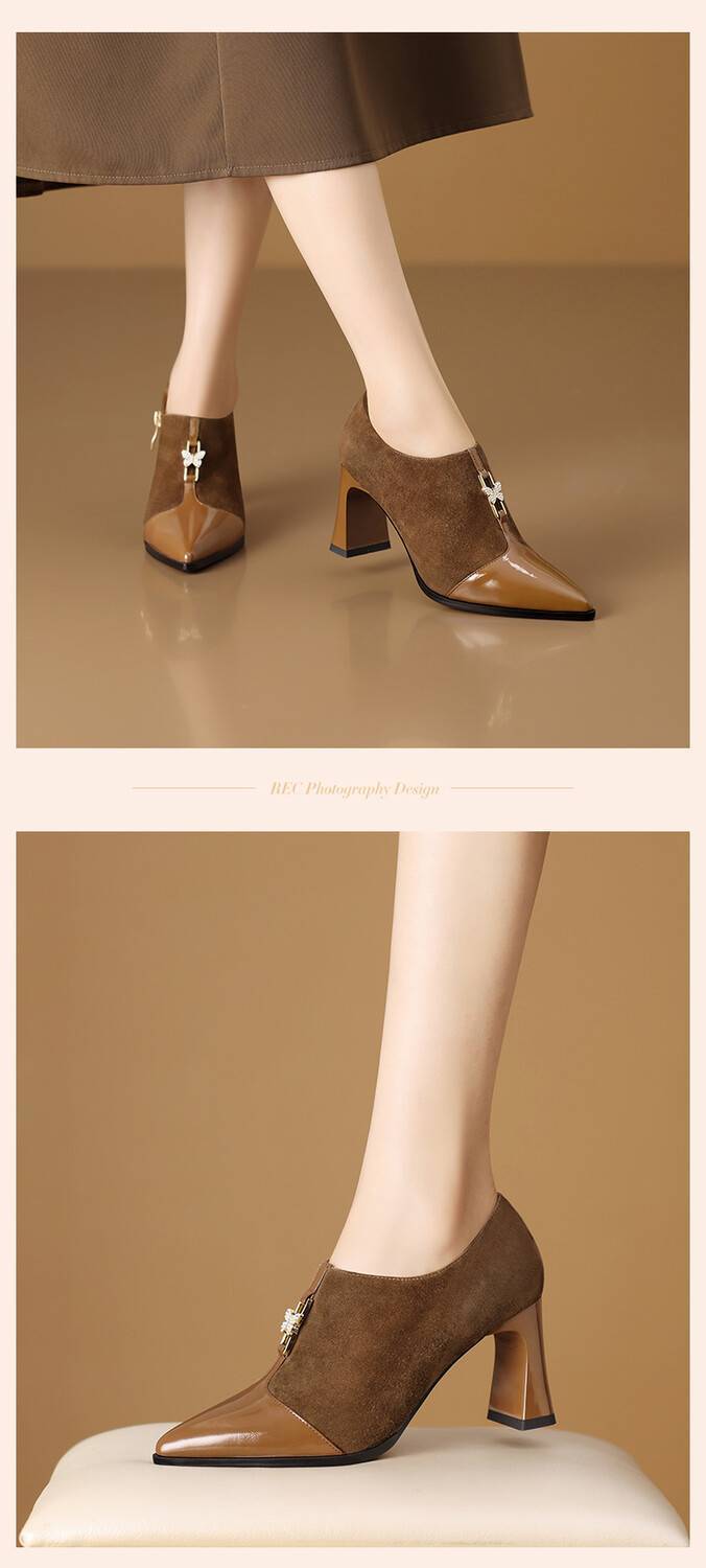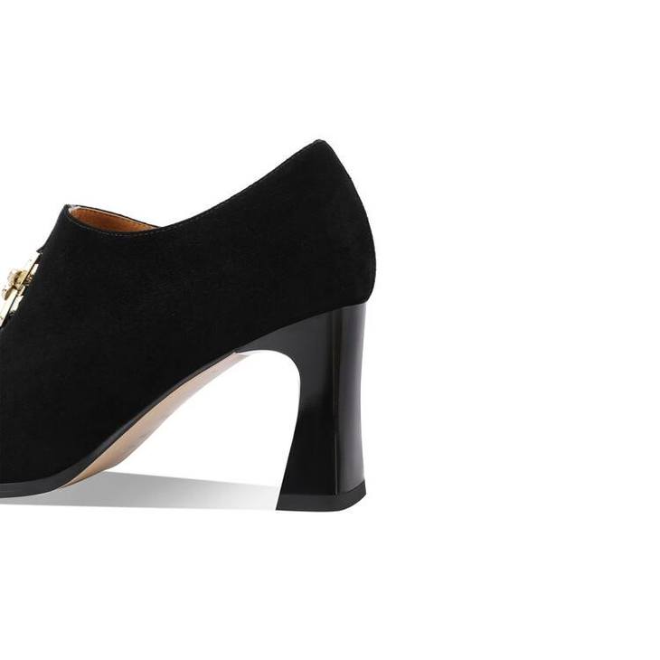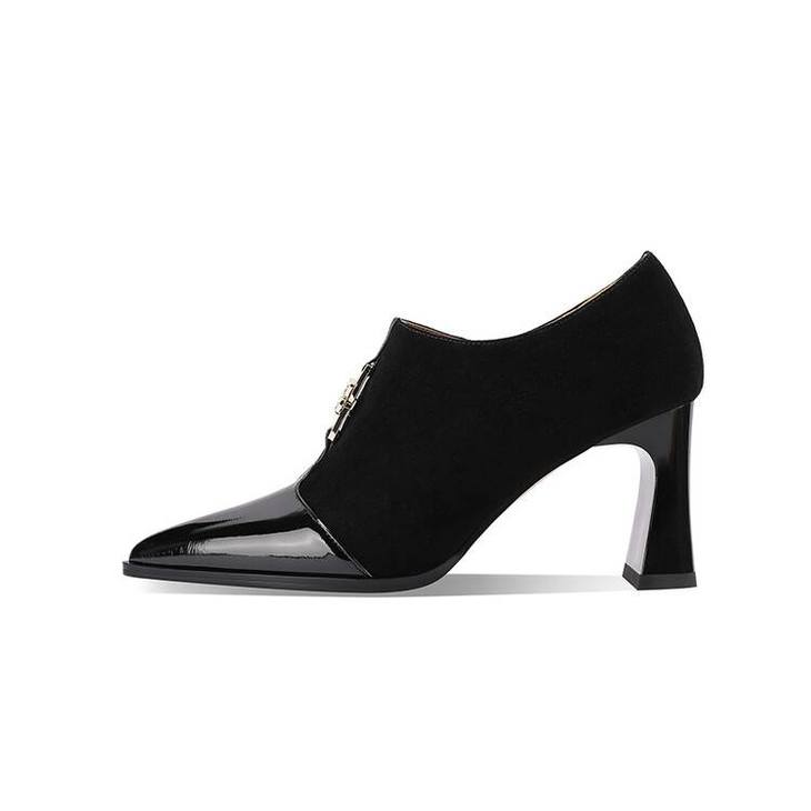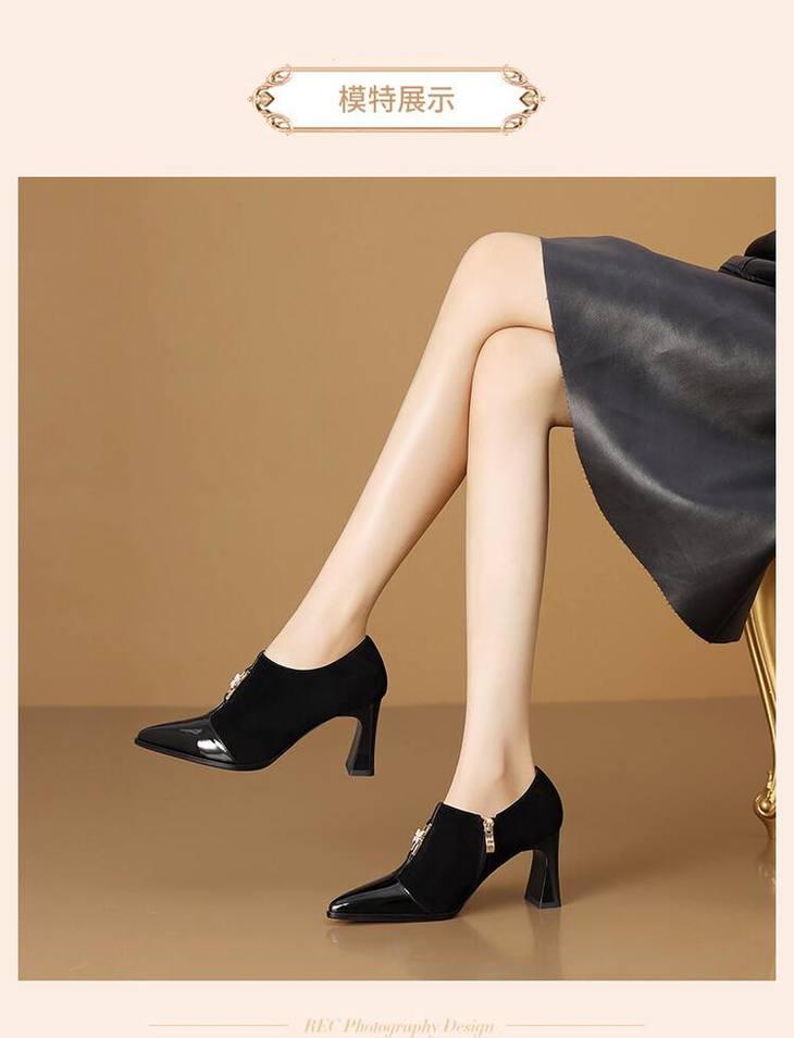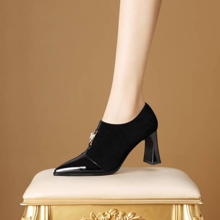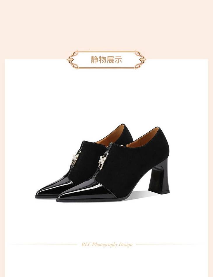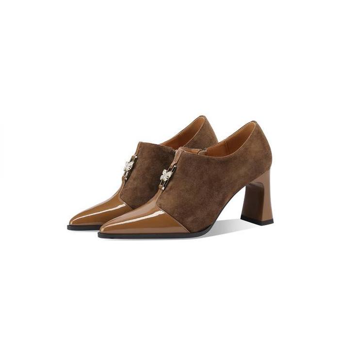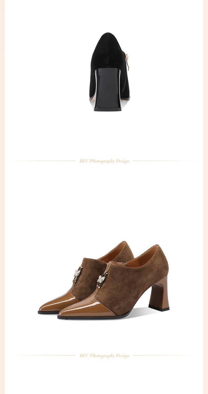 【预售5天】真皮单鞋羊翻皮复古尖头粗跟短靴女秋春季新款深口中跟及踝靴HY&H3501