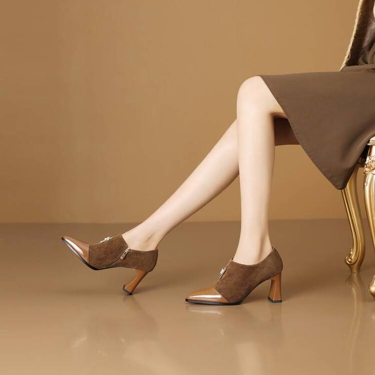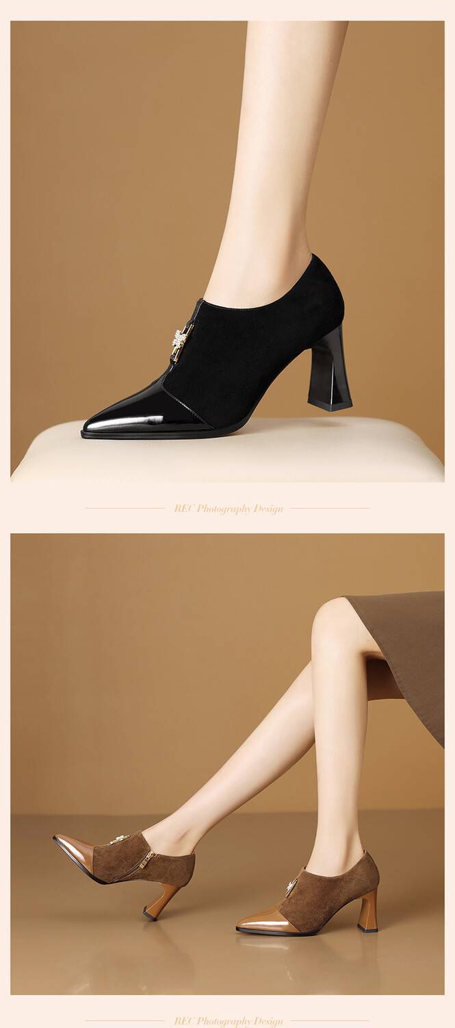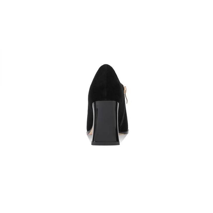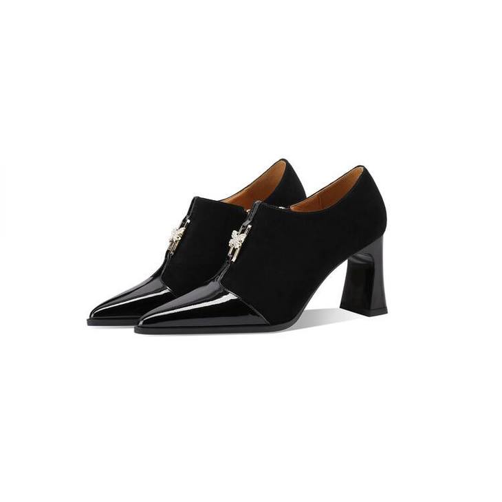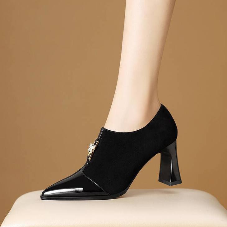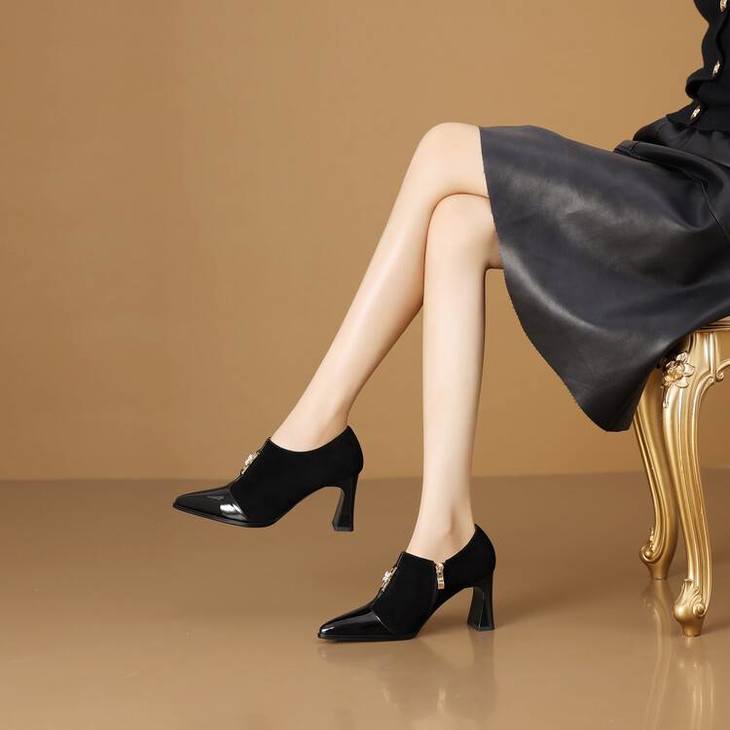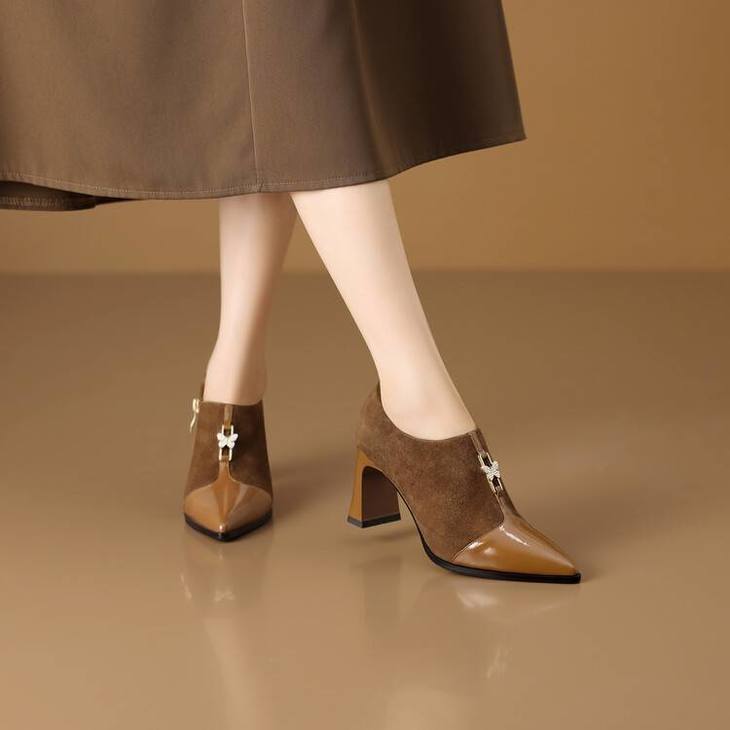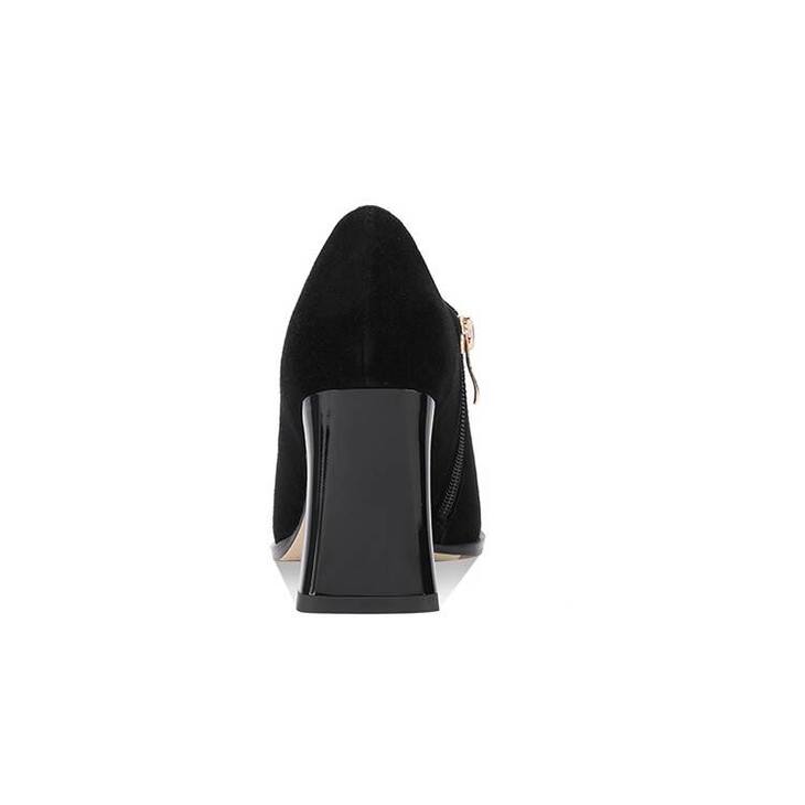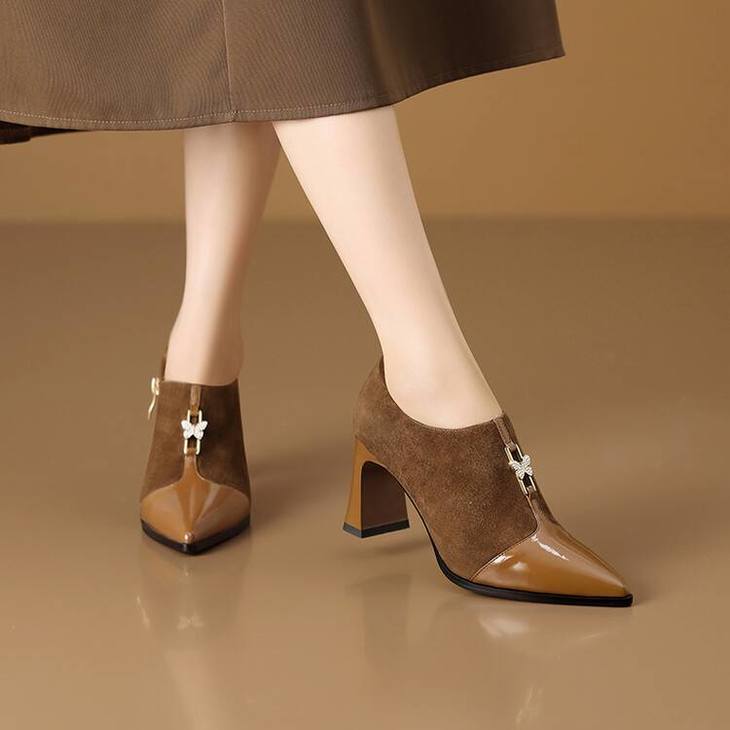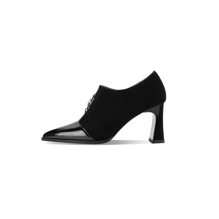 【预售5天】真皮单鞋羊翻皮复古尖头粗跟短靴女秋春季新款深口中跟及踝靴HY&H3501