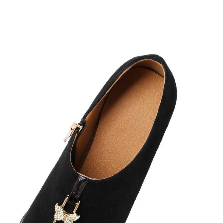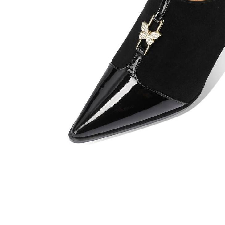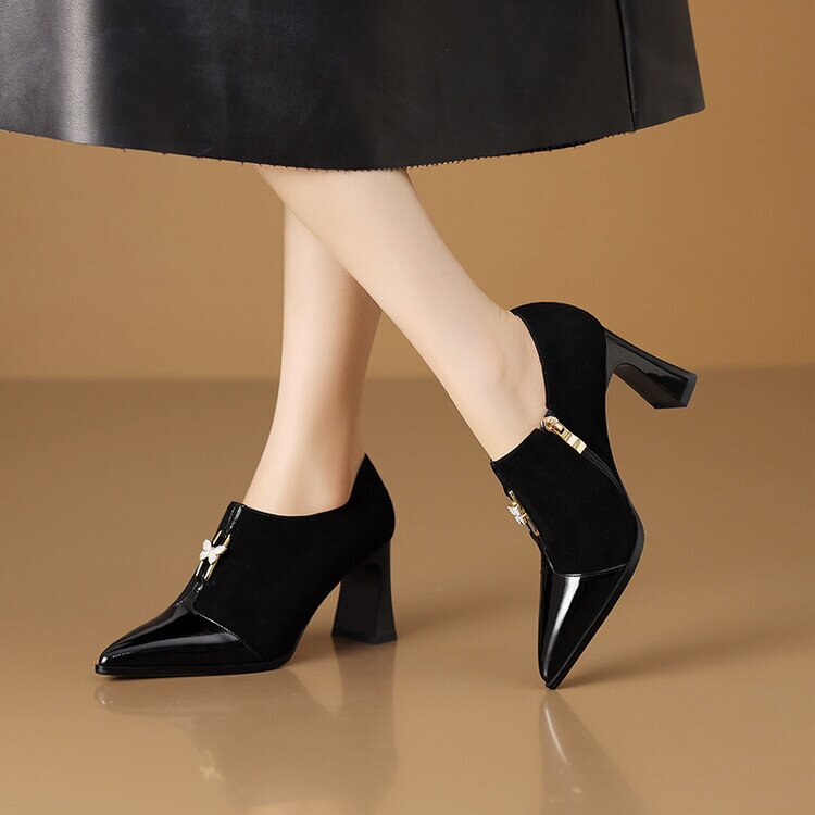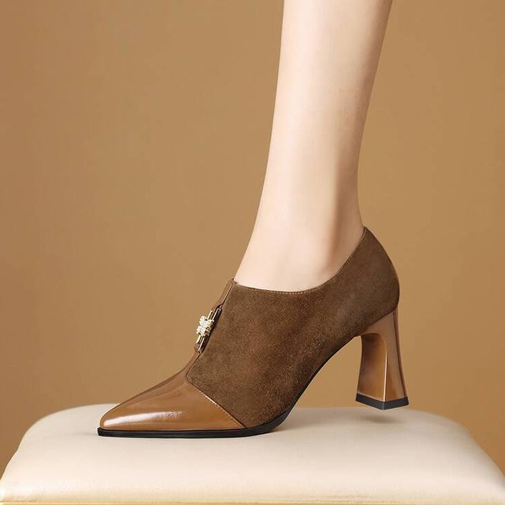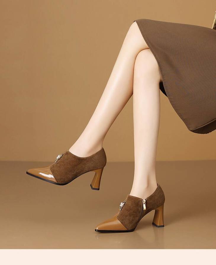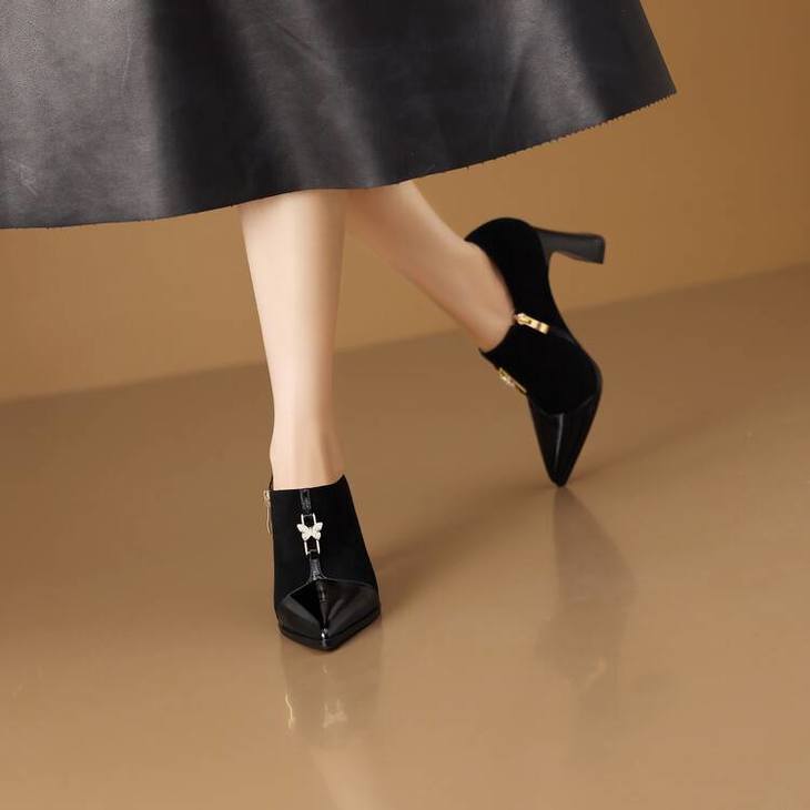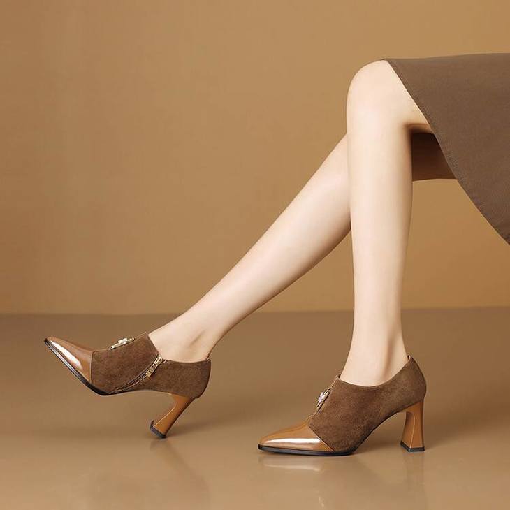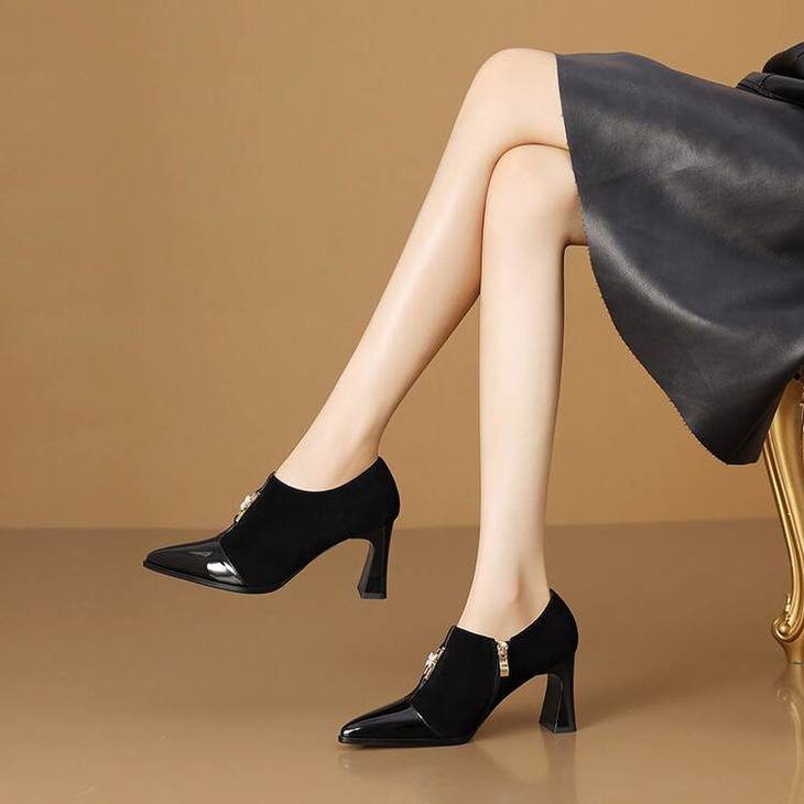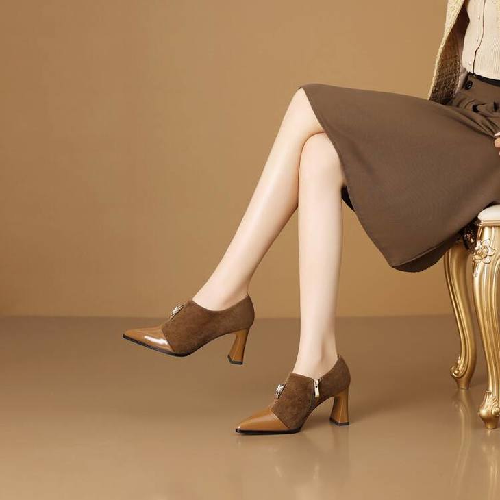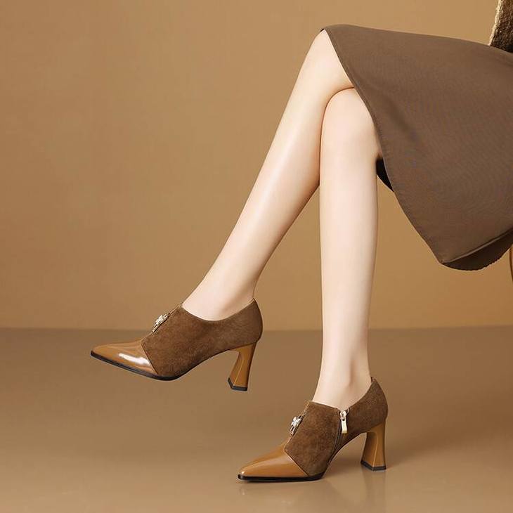【预售5天】真皮单鞋羊翻皮复古尖头粗跟短靴女秋春季新款深口中跟及踝靴HY&H3501
