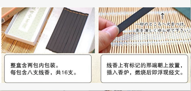 ❷ 该款线香为扁长形状,请确保短横面完全点燃,不可只点燃一角,否则会在中途熄灭;