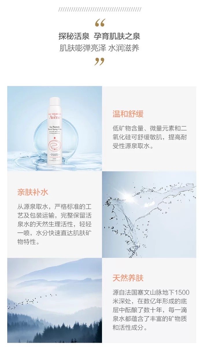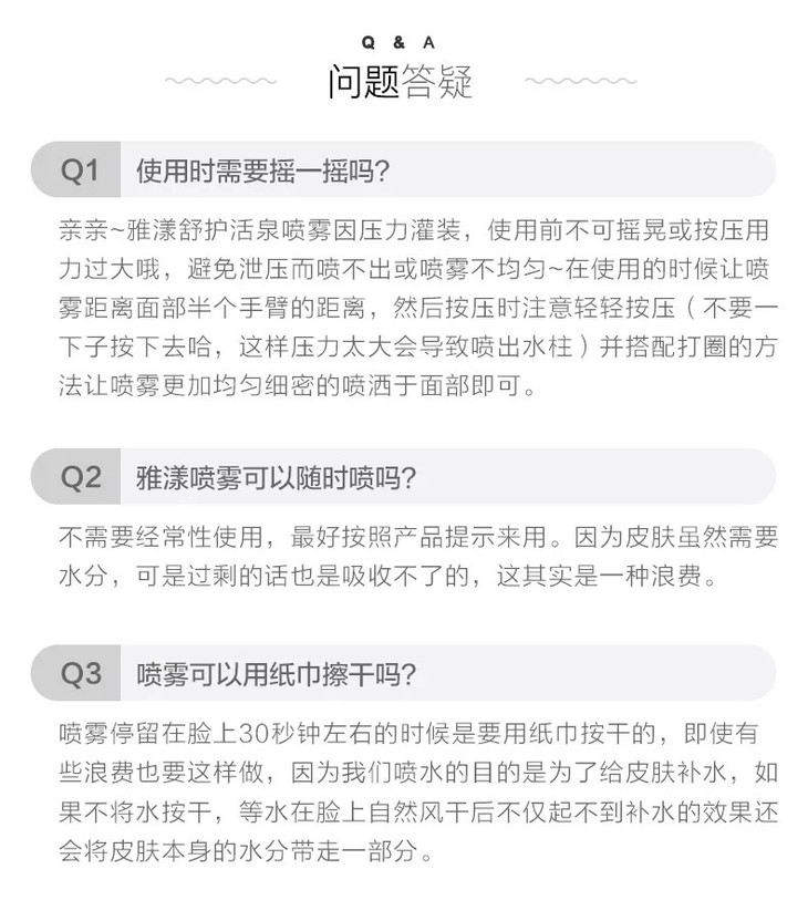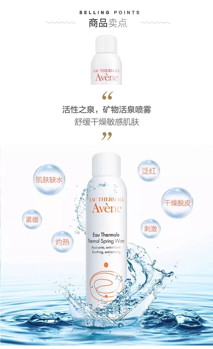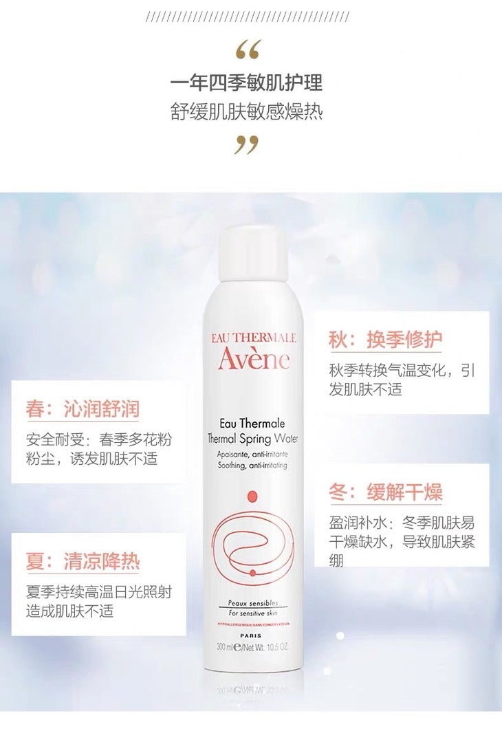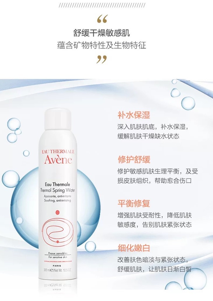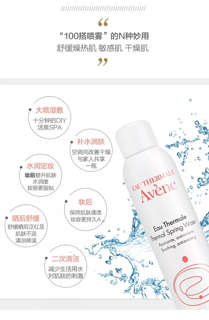 3、功效:雅漾喷雾300毫升,用途1: 爽肤水;用途2: 定妆;用途3: 舒缓皮肤;用途4: 做水面膜敷脸。功效: 补充水分,清洁,防辐射,抗敏,镇静,舒缓,红血丝。