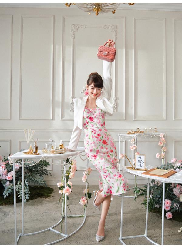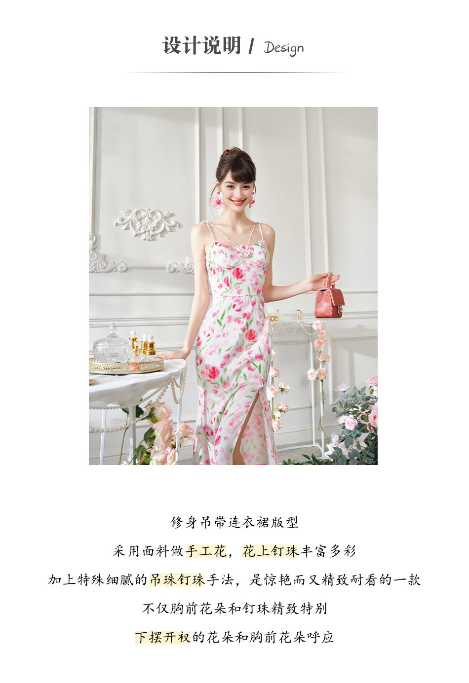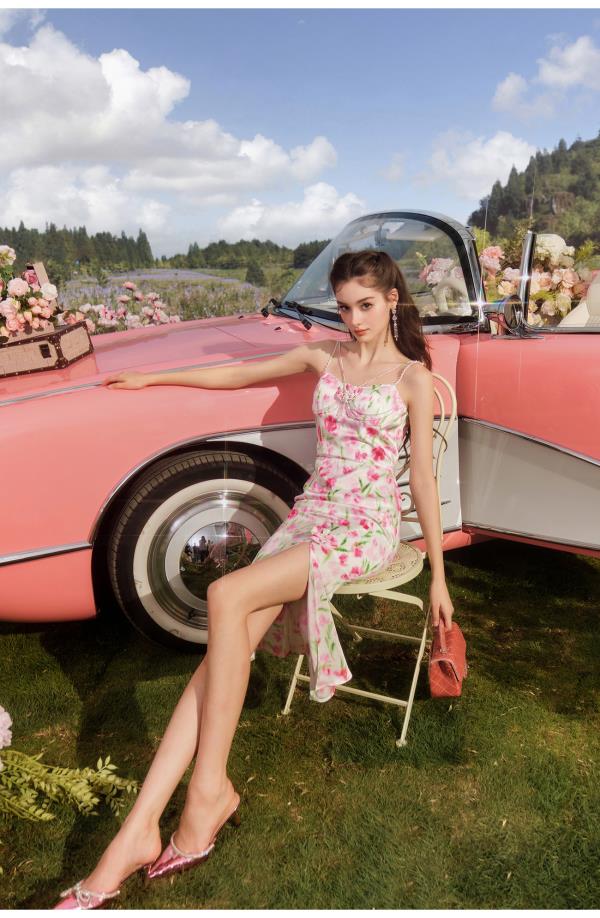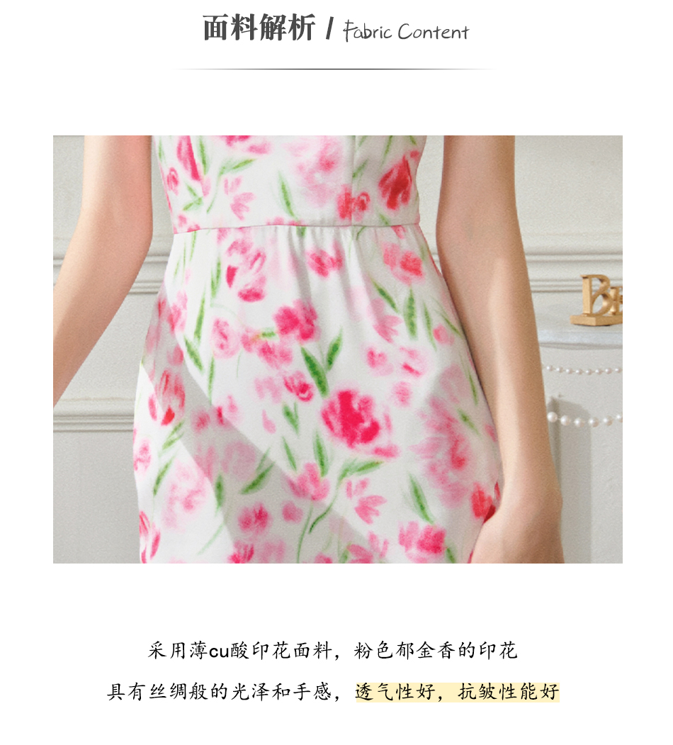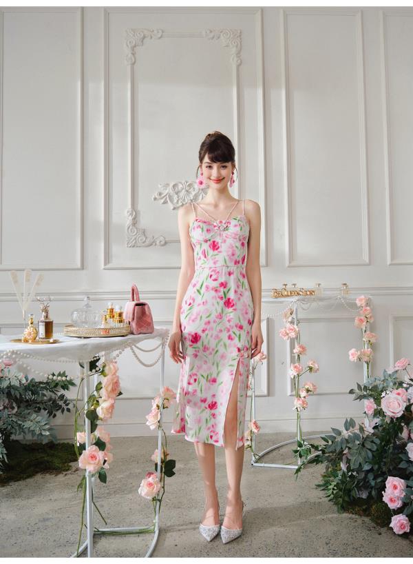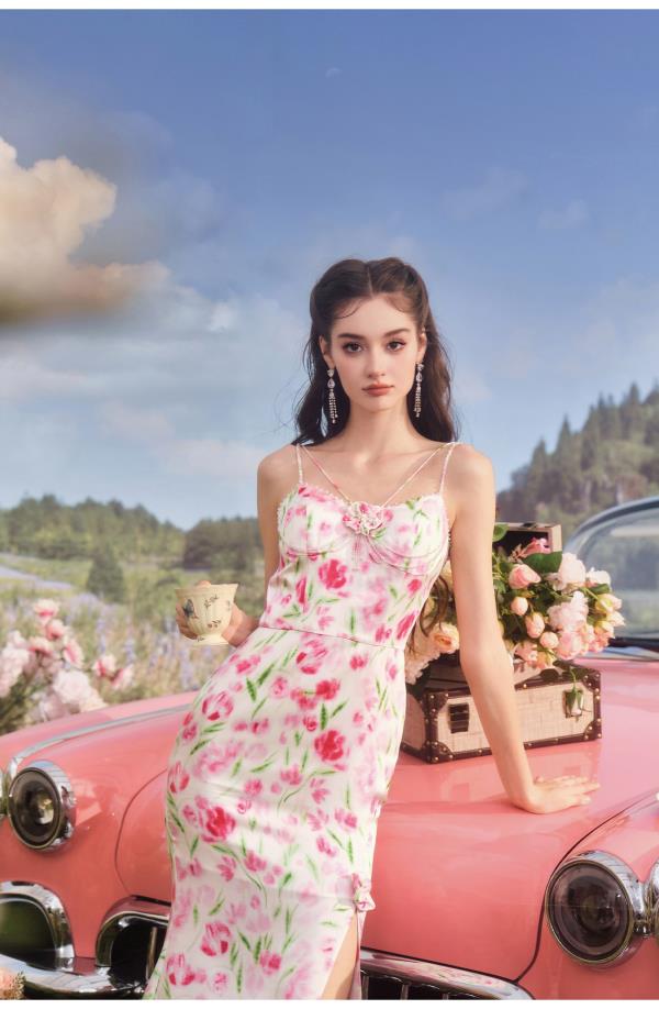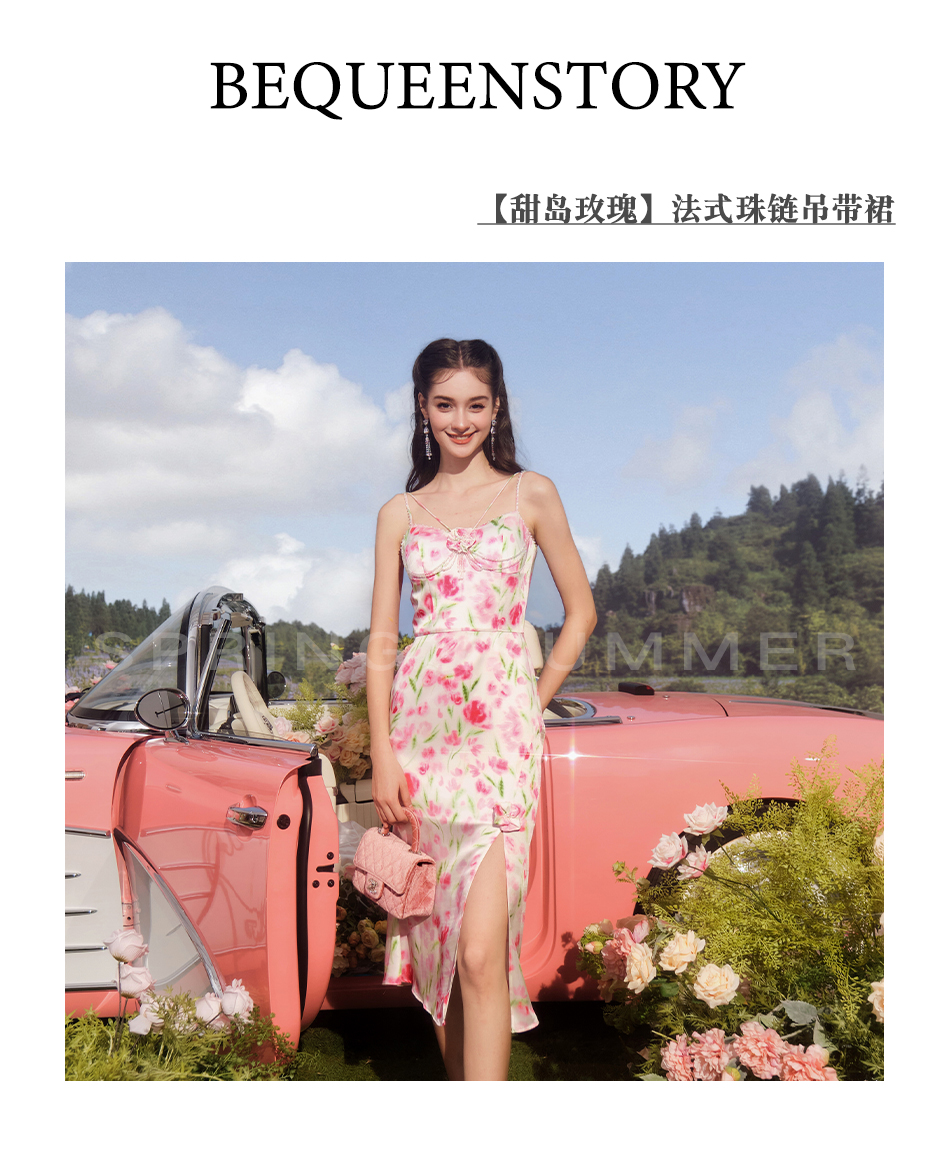BeQueenStory【甜岛玫瑰】法式印花显瘦精致珠链吊带连衣裙2023新款