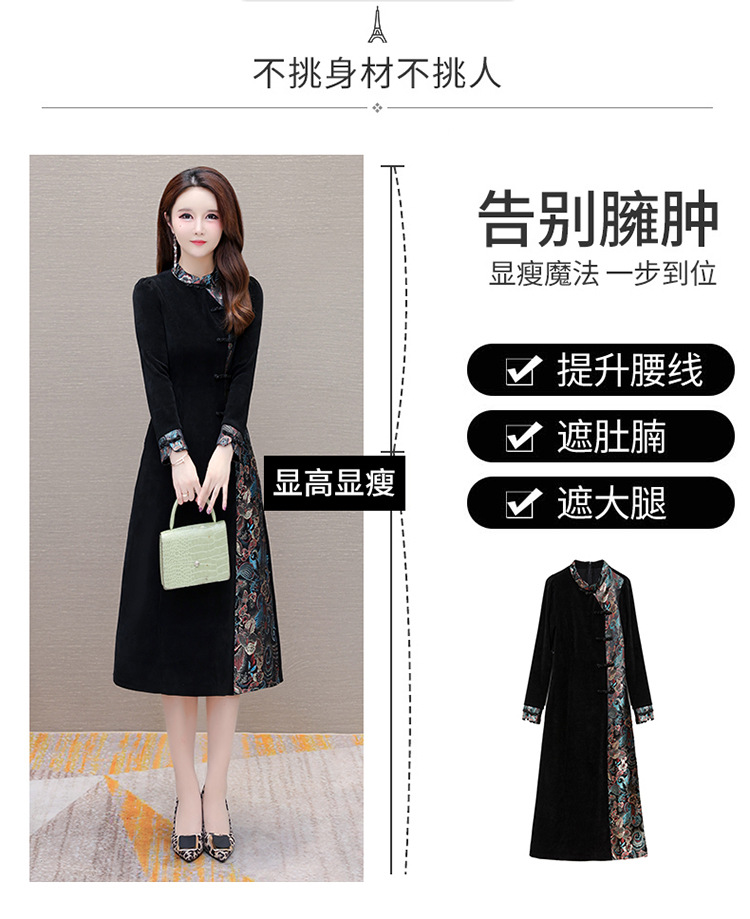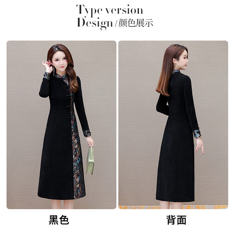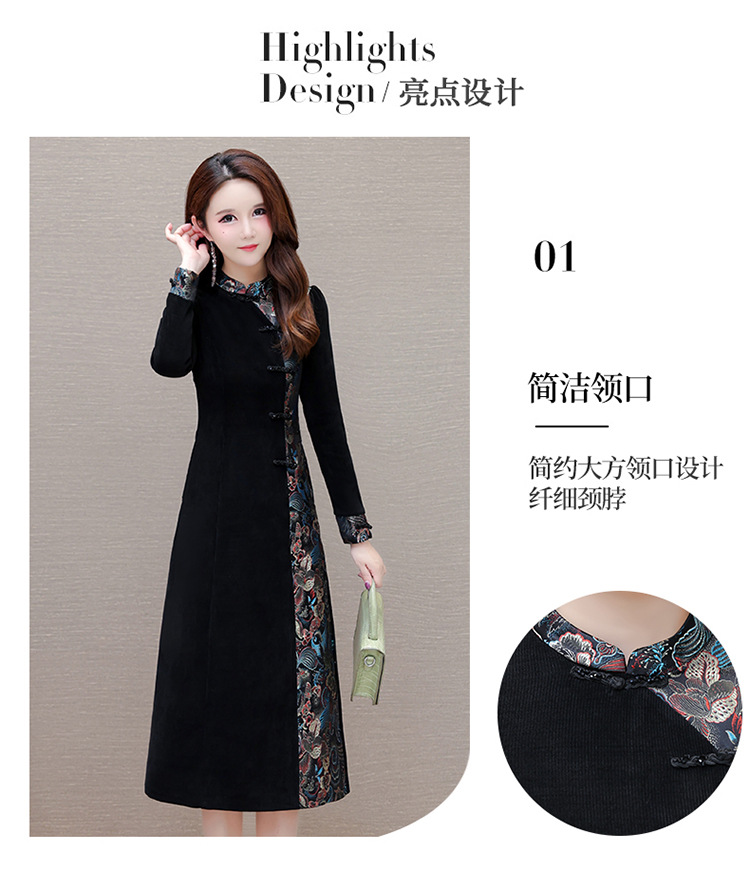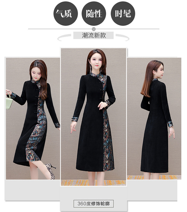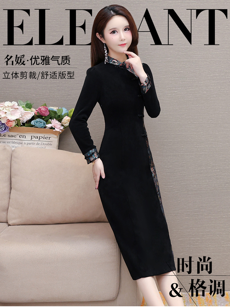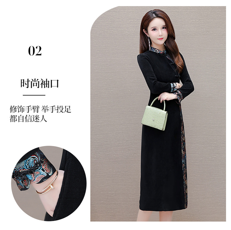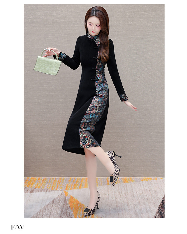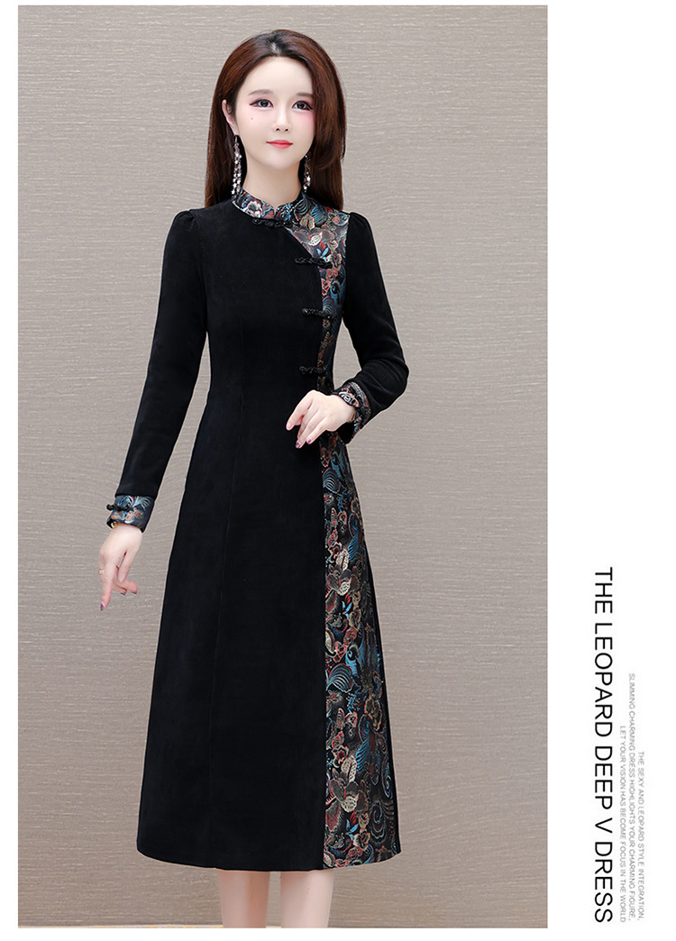 春款中式印花连衣裙圆领长袖洋气改良旗袍裙QYM-XQD-5C2341-L