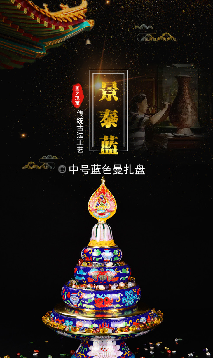 景泰蓝曼茶罗紫铜胎供品法器佛堂摆件中号蓝色曼扎盘带托盘