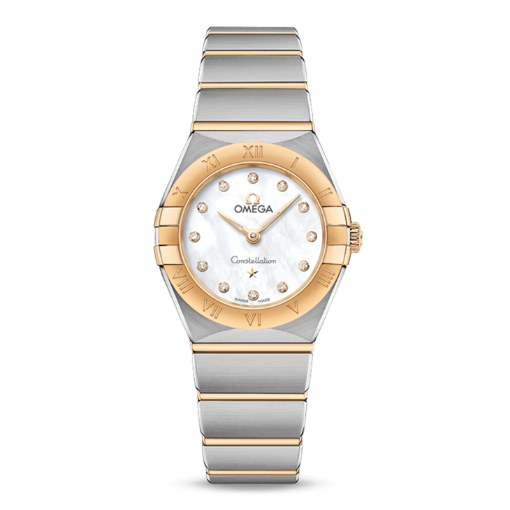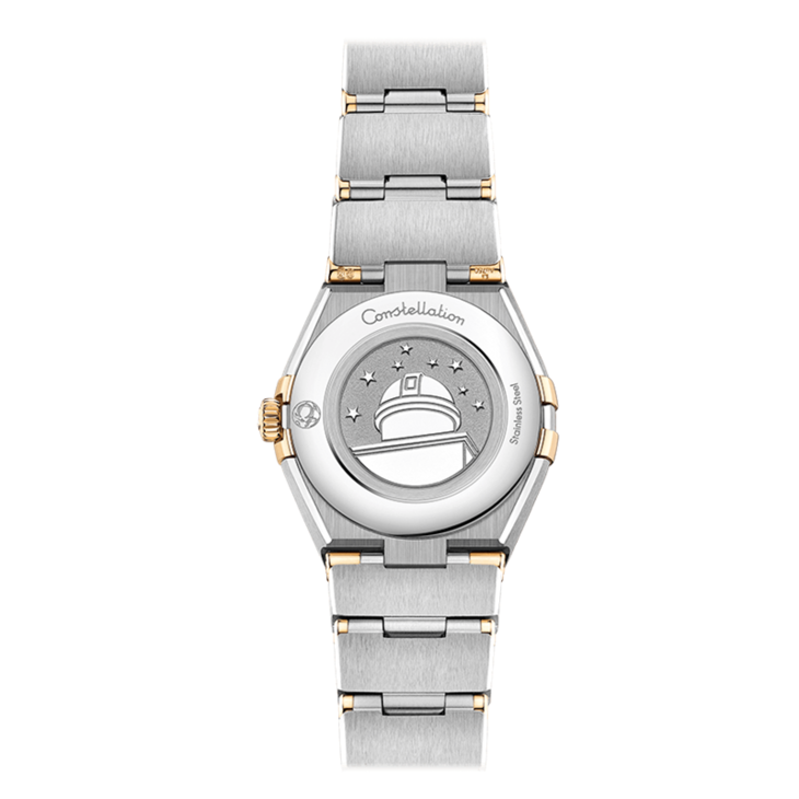镜面材质 | 蓝宝石水晶玻璃 | 表盘 | 经典的半月形切面、“托爪”以及mono-rang表链。 黄色18K金与精钢打造,表圈镌刻罗马数字刻度,白色珍珠母贝表盘,饰有钻石小时刻度,覆以耐磨损蓝宝石玻璃表镜。指针、欧米茄品牌标识、星座徽标以及钻石托槽亦以黄色18K金打造而成。 密底,表背印有星座天文台徽章。 |
