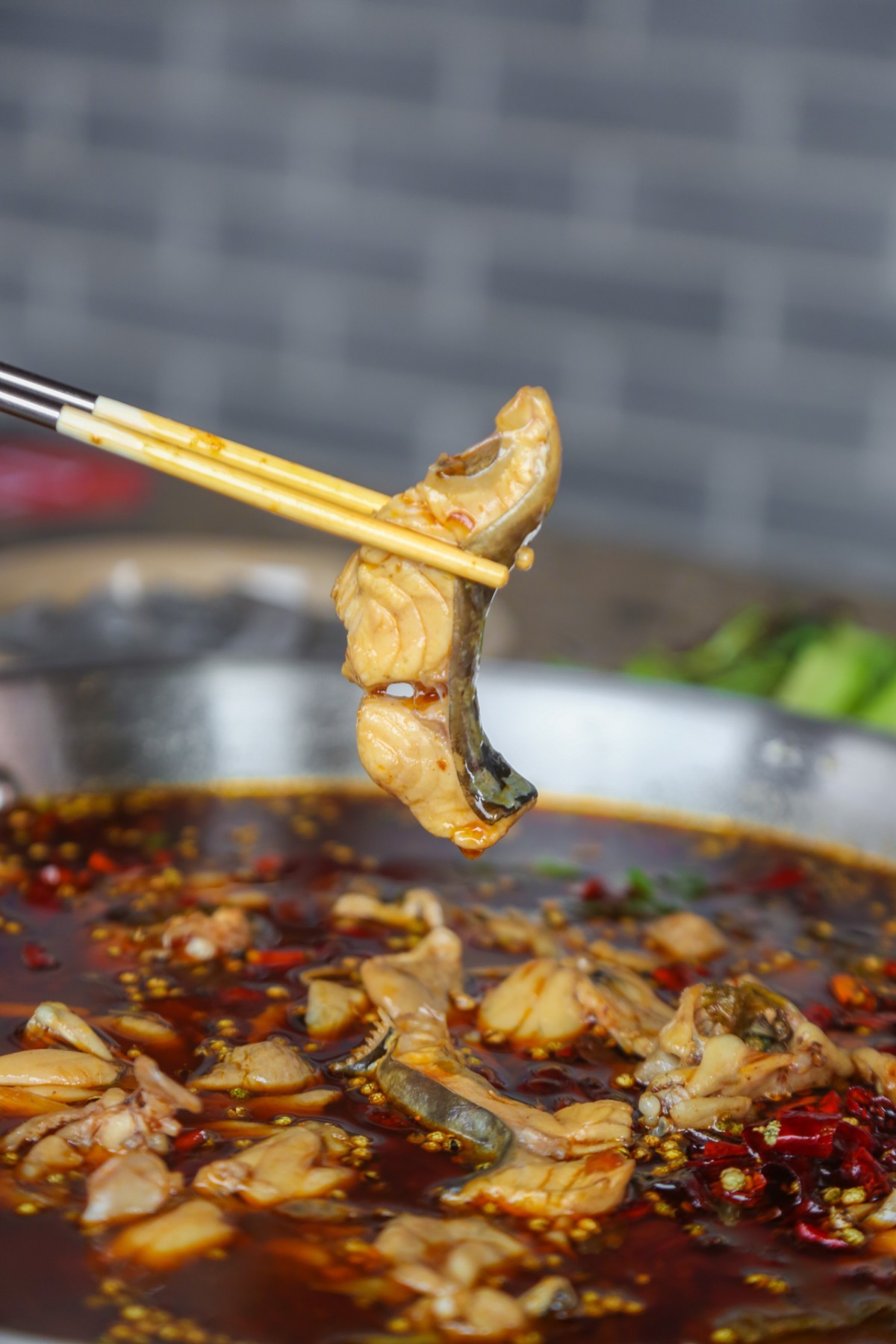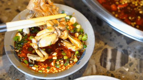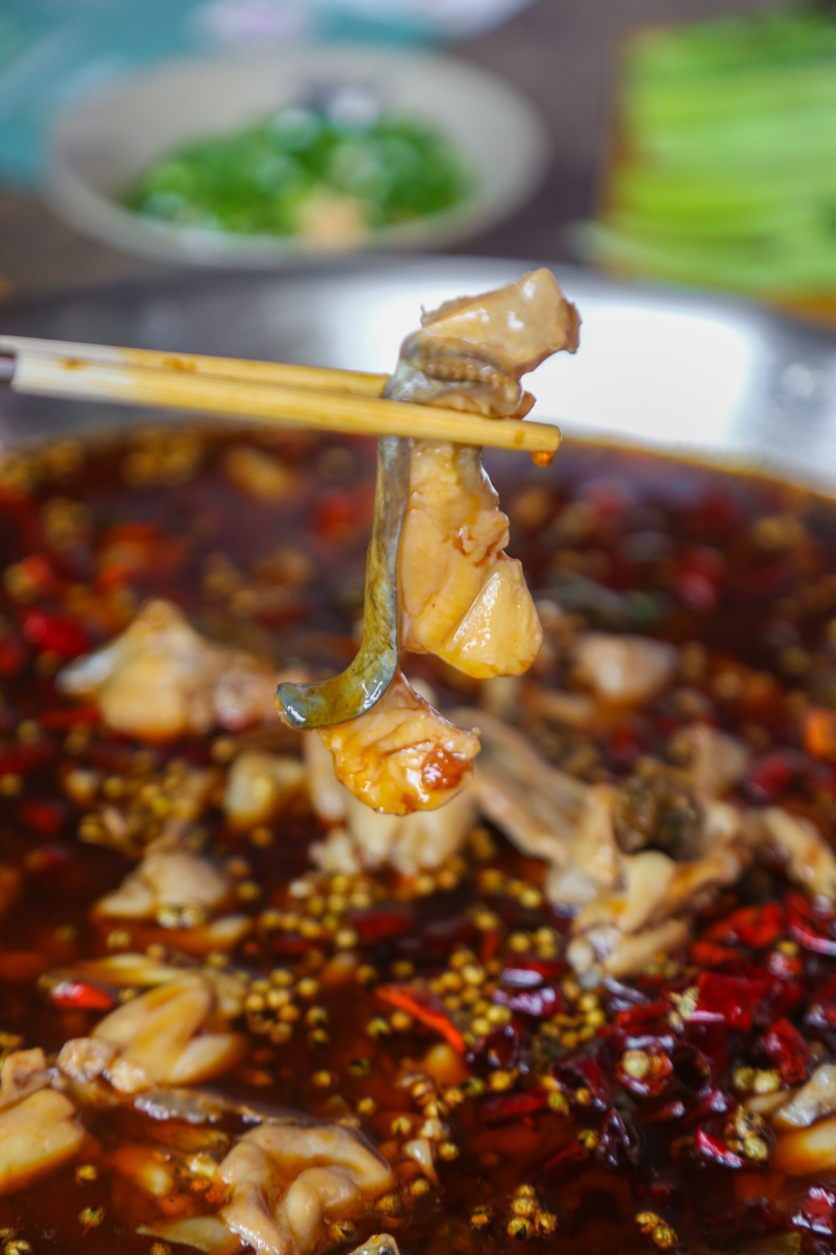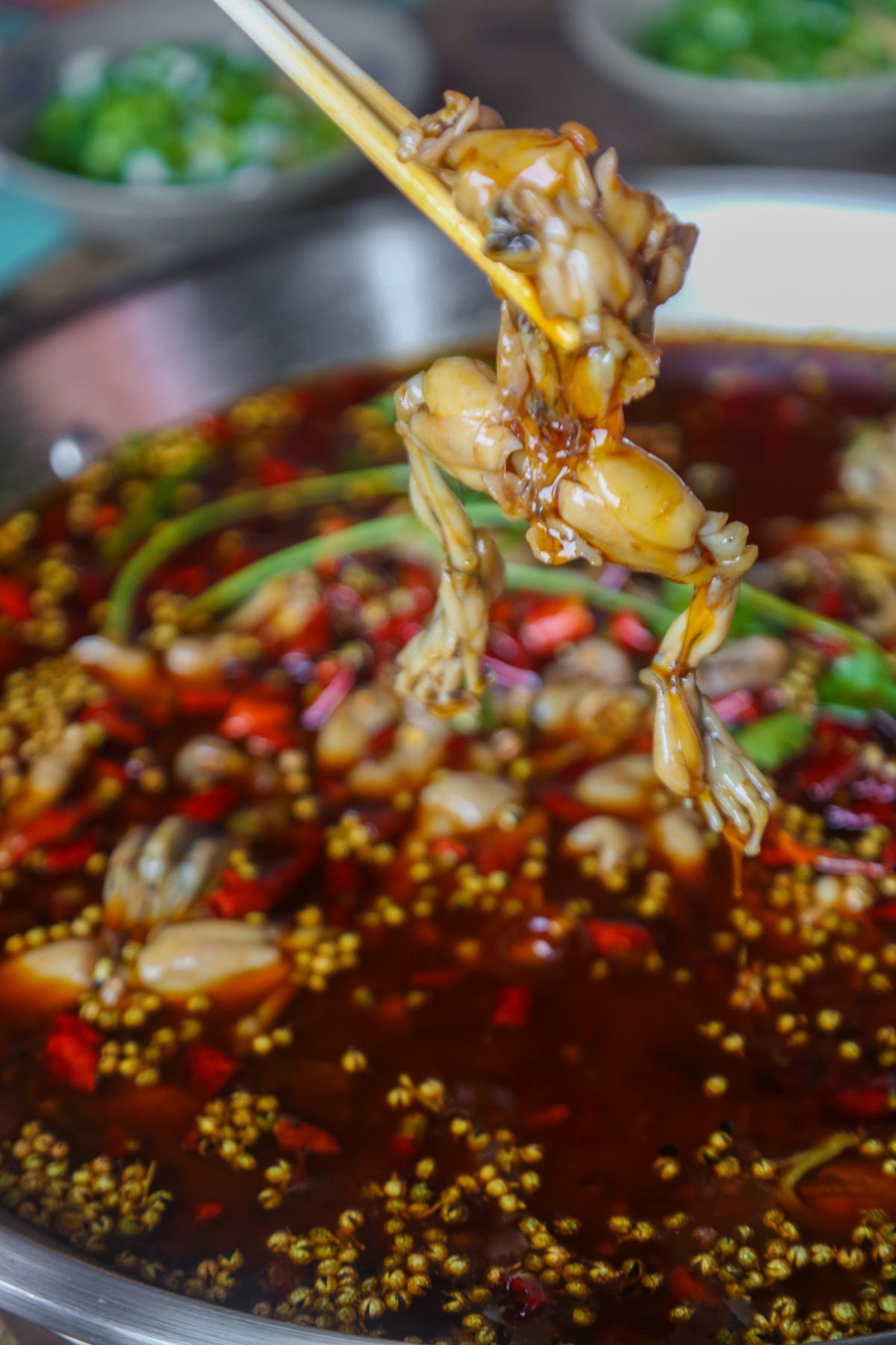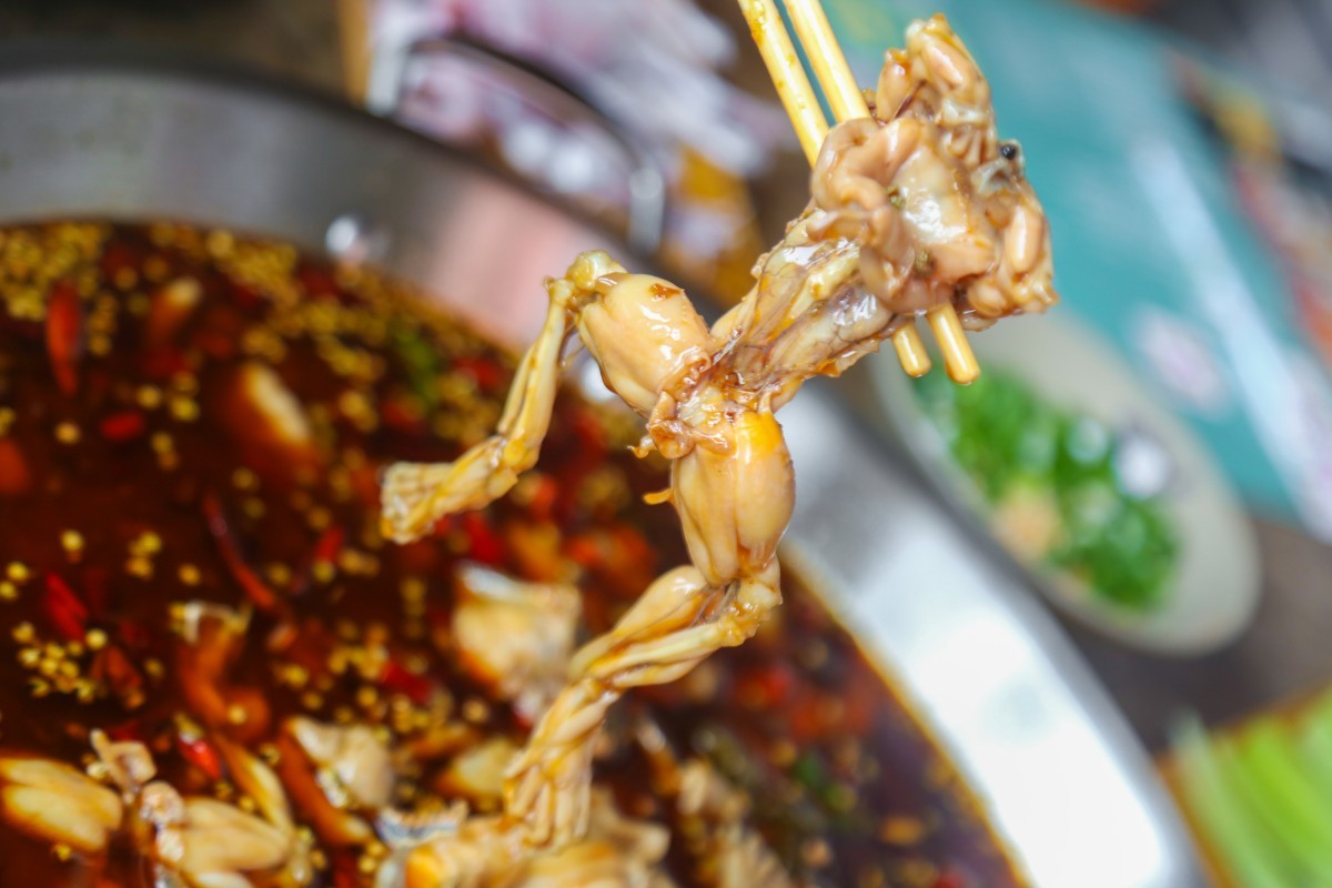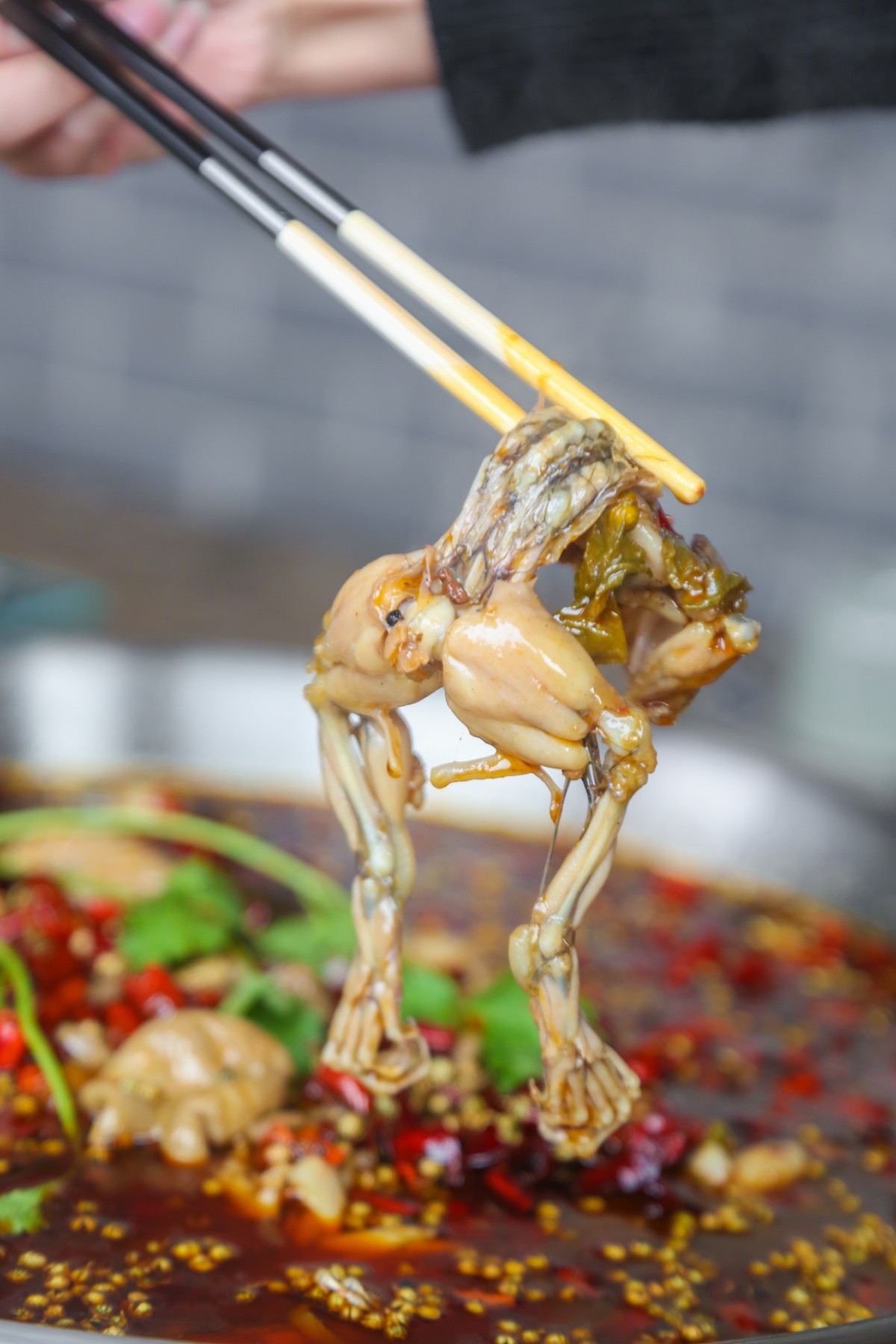 一整只蛙从红汤捞出,每寸肌理都挂满汤汁