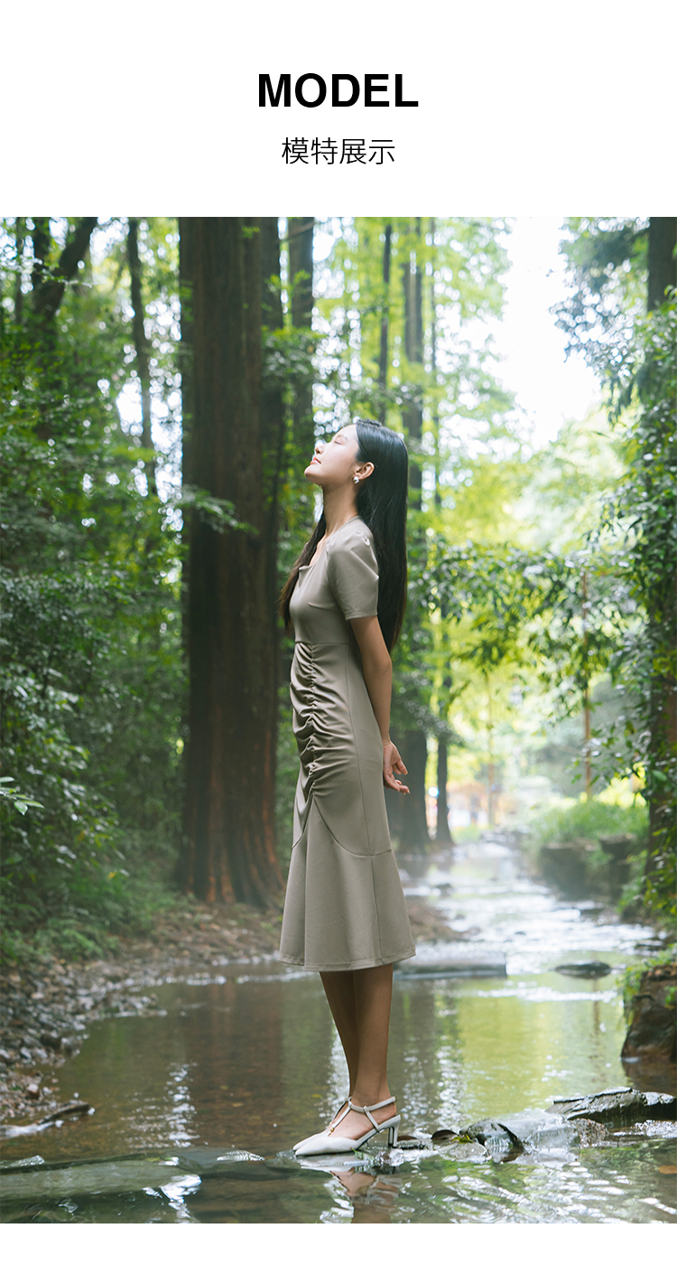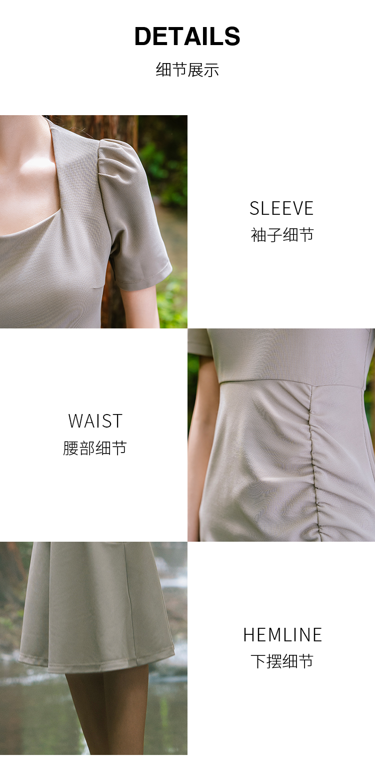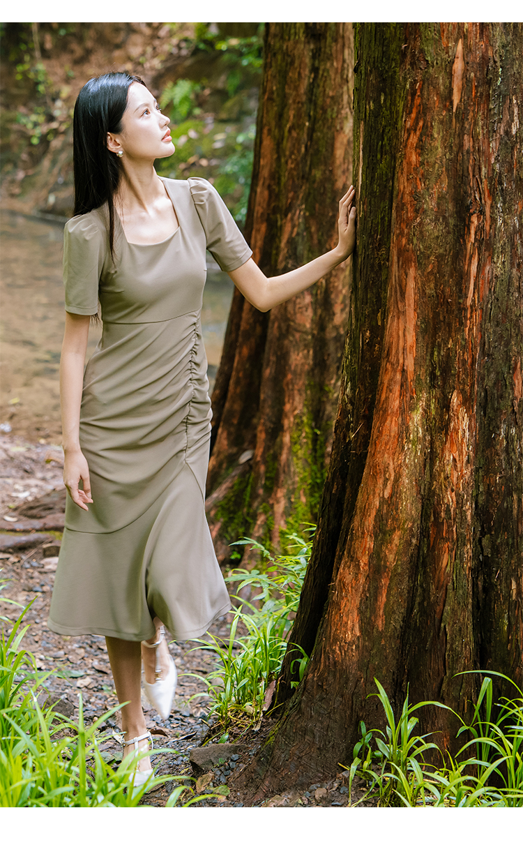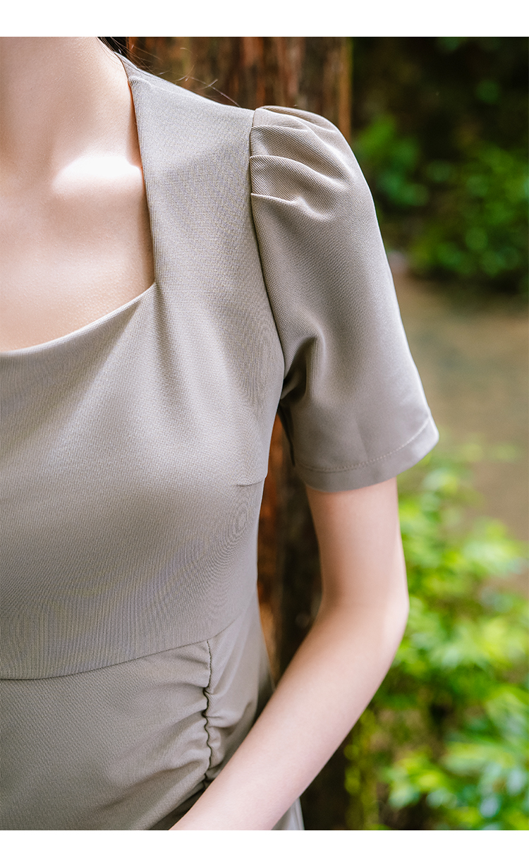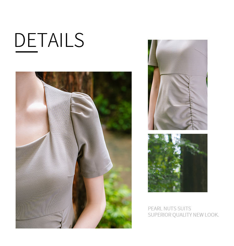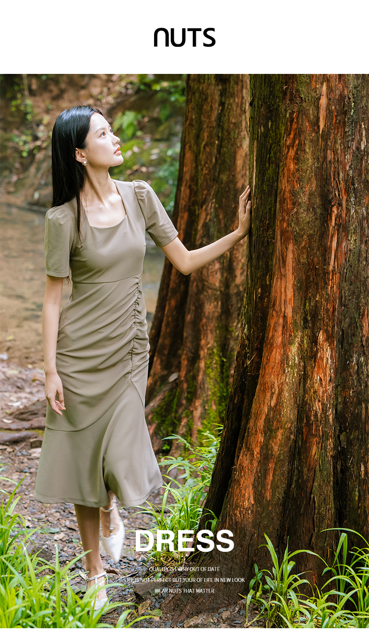 NUTS商场同款夏季纯色设计感褶皱方领修身短袖连衣裙女4311010A1