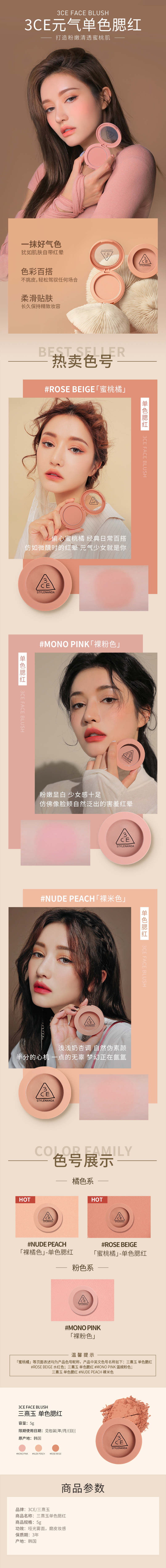 3CE单色腮红蜜桃橘裸粉哑光自然腮红修容哑光