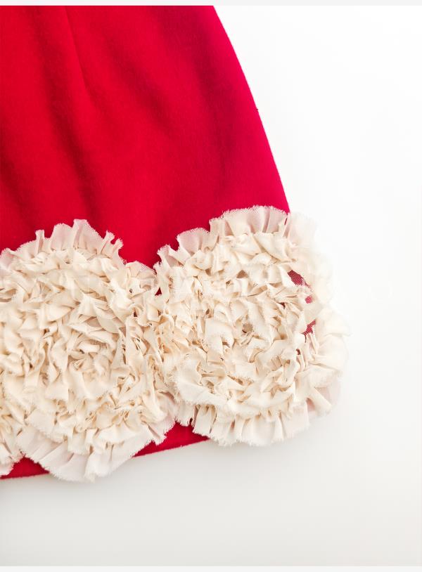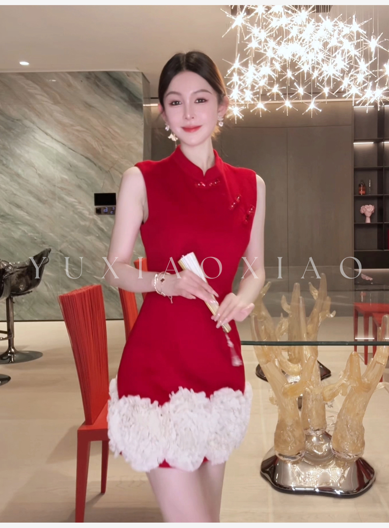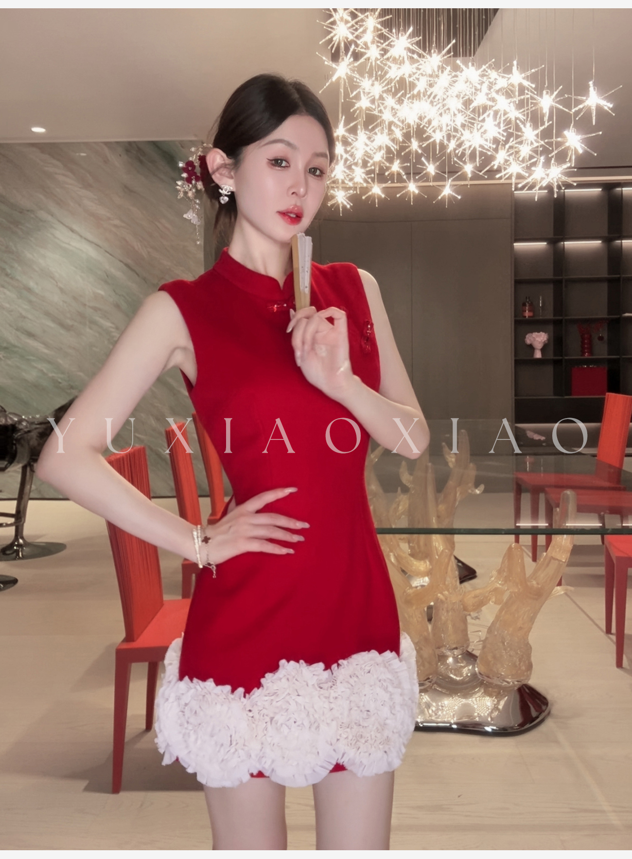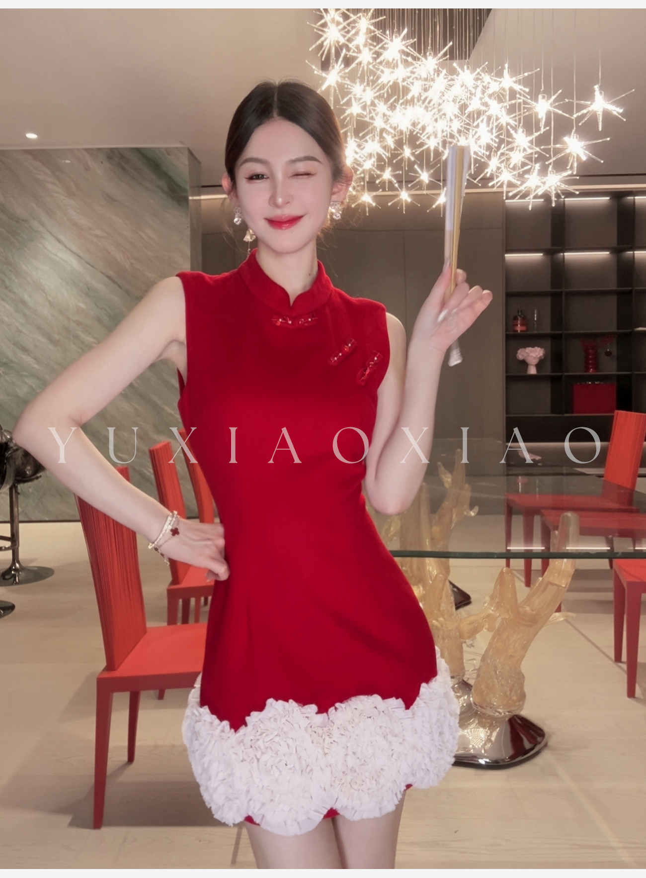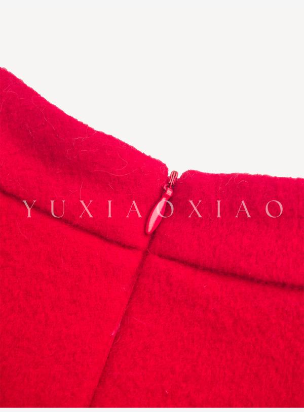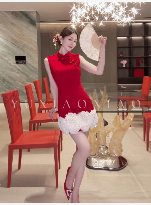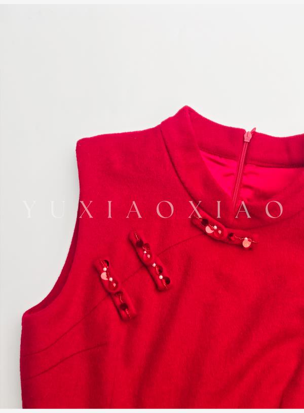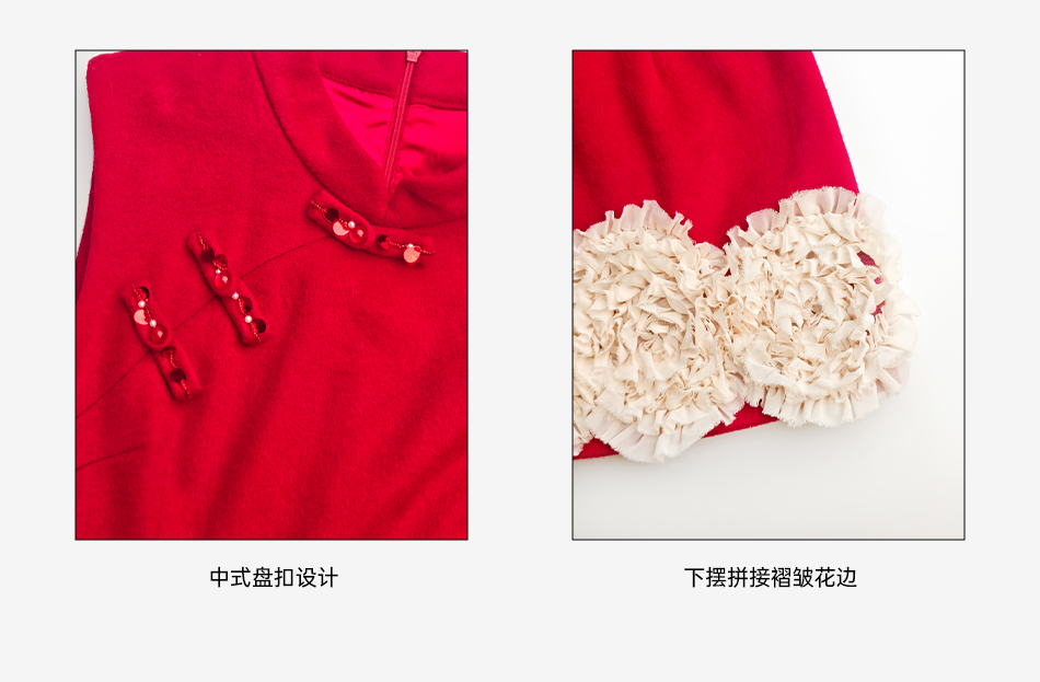 余潇潇【延禧风华】绵羊毛混纺中式立领拼接褶皱花边短款旗袍连衣裙