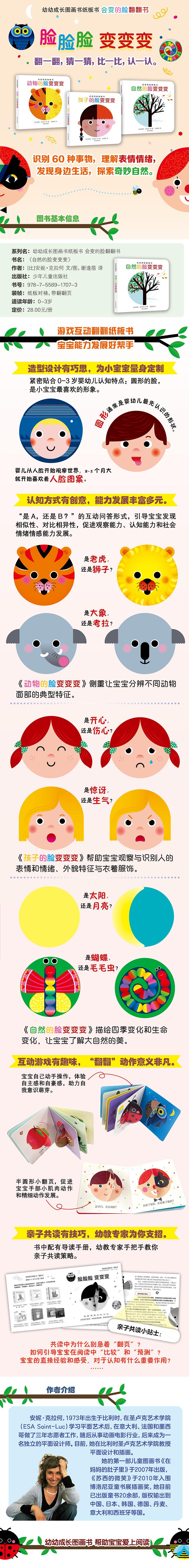 婴儿对世界的观察首先从周围的人脸开始,2-3个月大就开始喜欢看人脸图案。本系列以婴幼儿最为喜爱的脸和圆形为形象基础,通过小翻页的来回翻动,呈现各种各样的脸的变化。翻过来是这样,翻过去是那样,让宝宝在简单而轻松的互动与对比中,以趣味游戏的方式获得对动物、人和自然的认知,并发现事物之间的相似性、对比相异性,促进观察力的发展和社会情绪情感能力的发展。半圆形的小翻页设计,能够使宝宝在来回翻动探索的过程中,锻炼小手肌肉和精细动作的发展。
