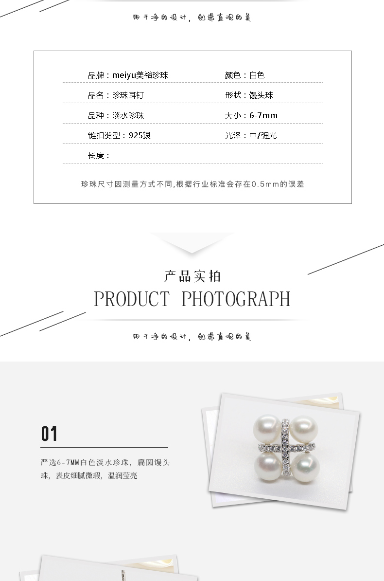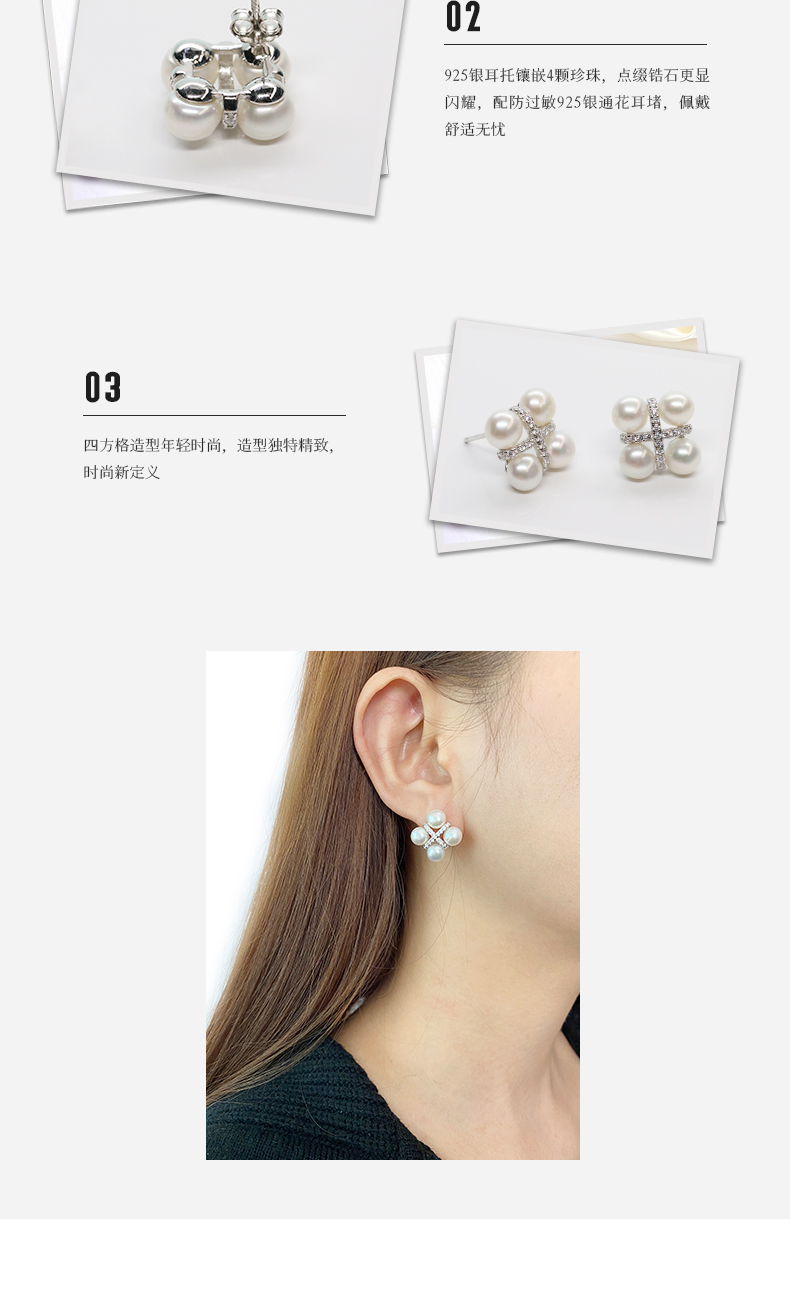 美裕 【四方格】银925淡水珍珠耳钉6-7mm白104193