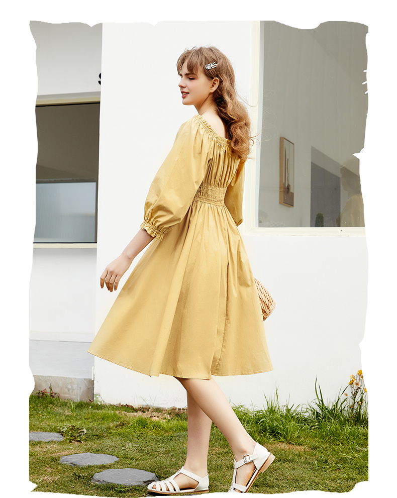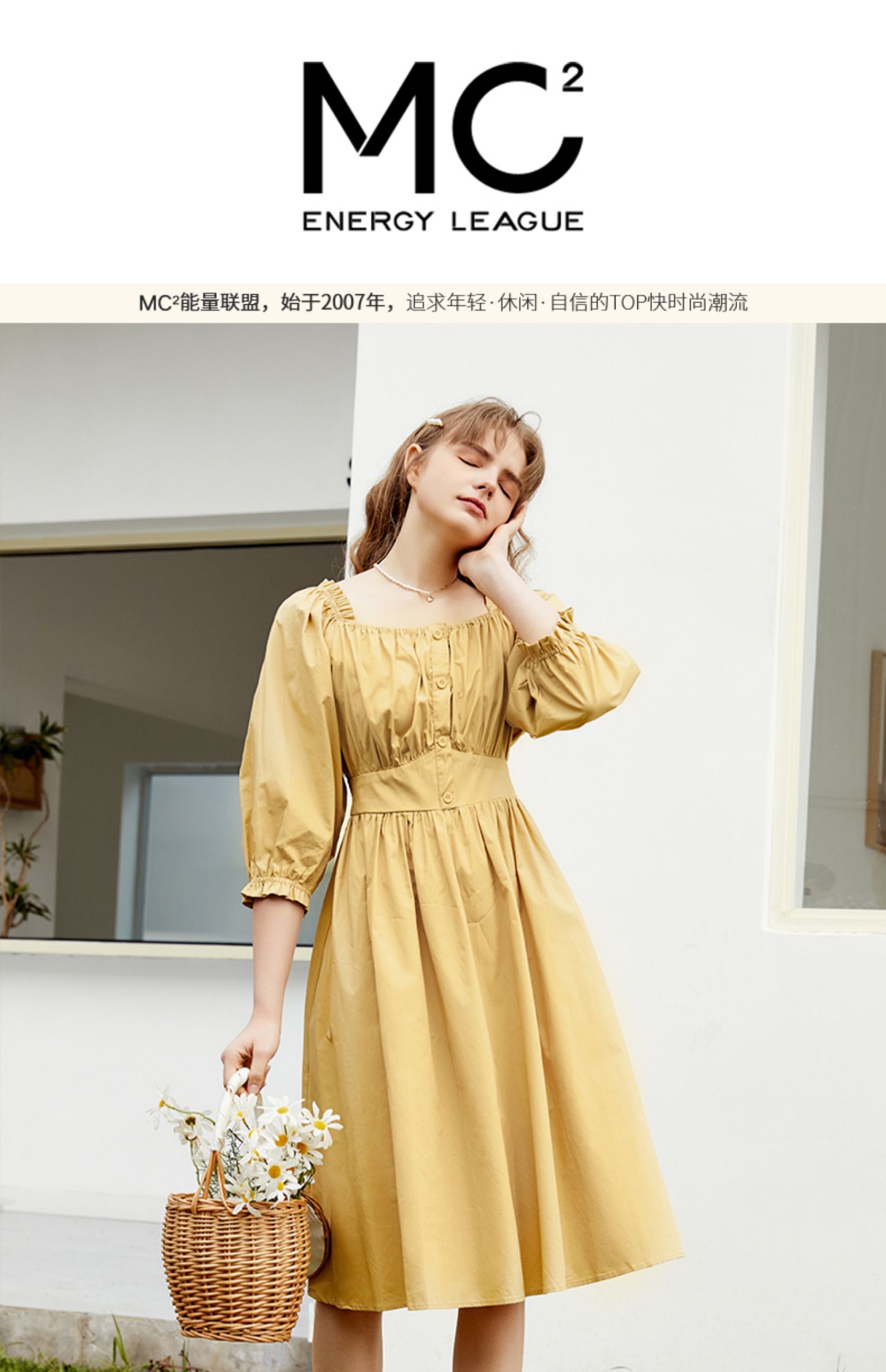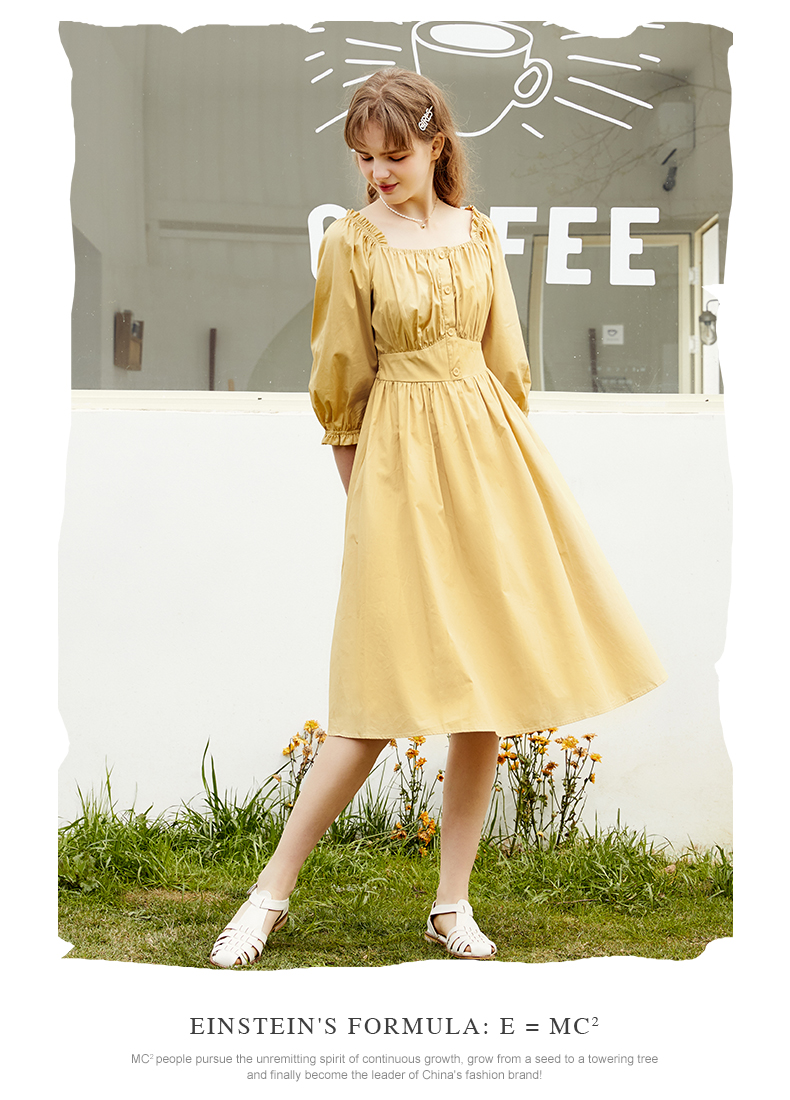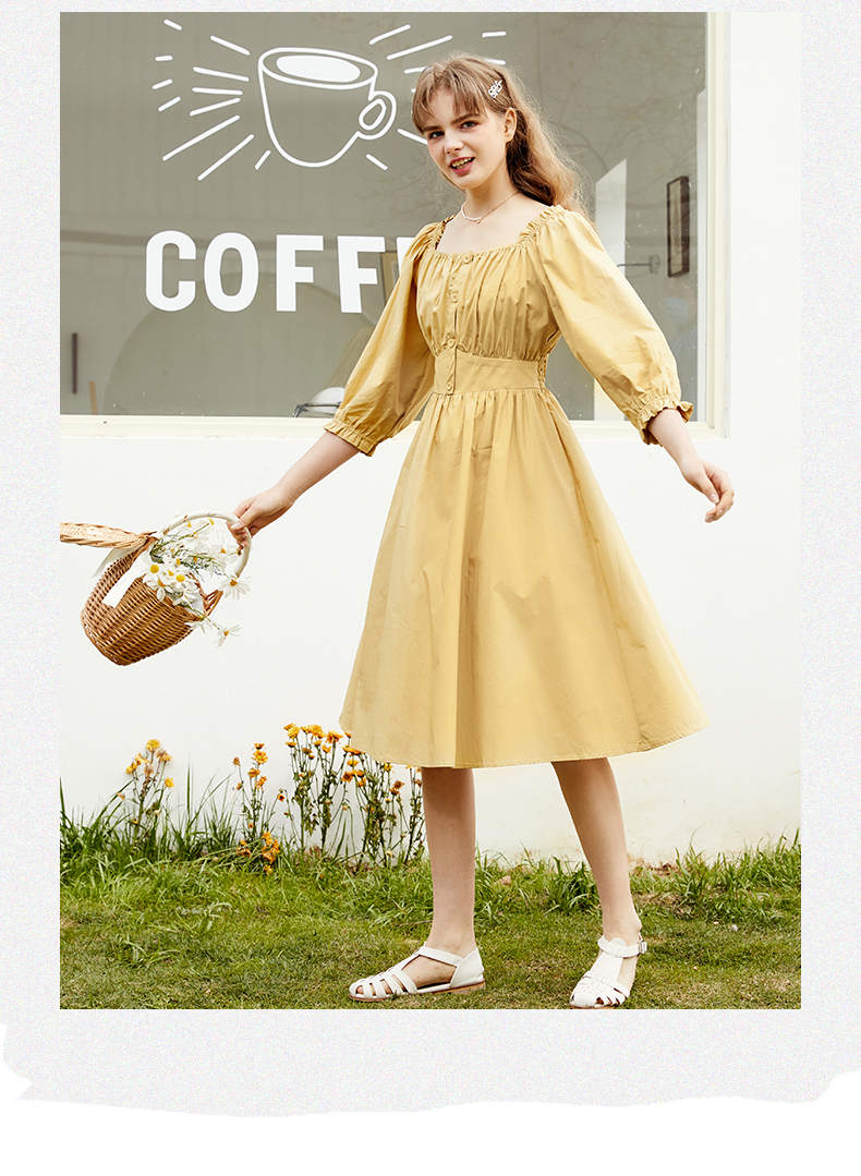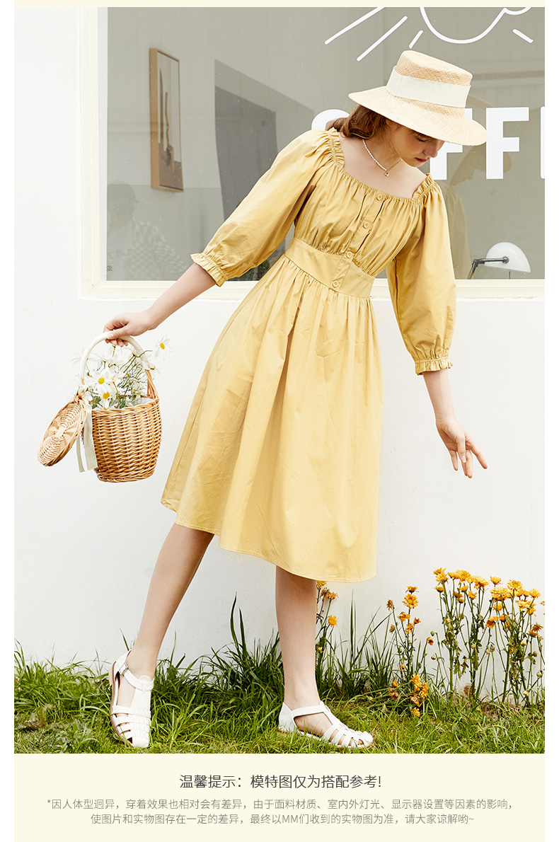 【新品】2021年夏季新款法式气质方领泡泡袖连衣裙中长款超仙气温柔风长裙