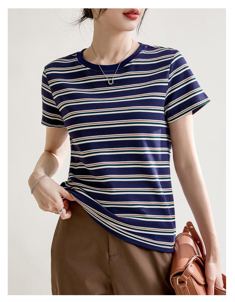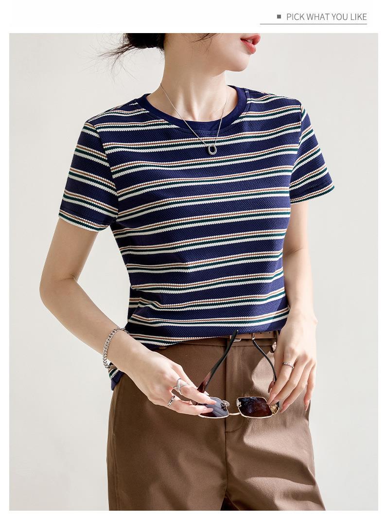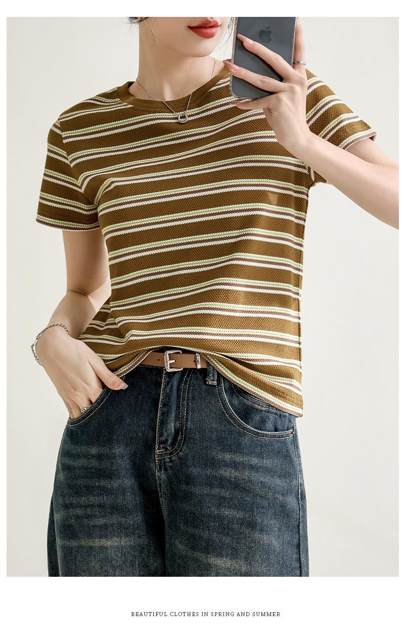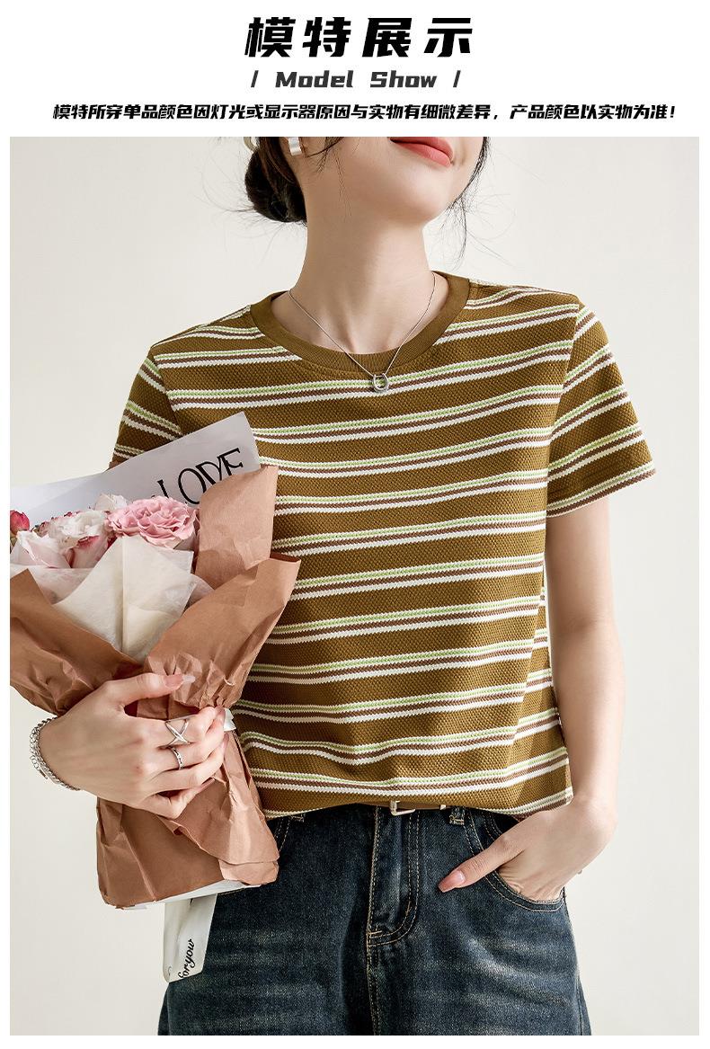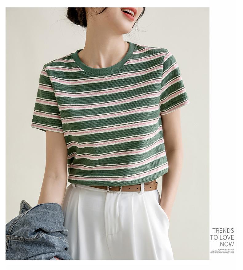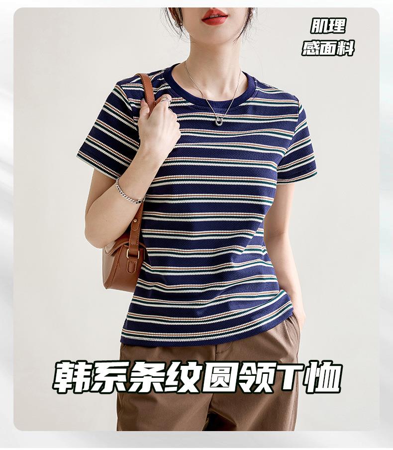 韩系小众圆领肌理感短袖T恤女2024春夏新款正肩修身条纹套头上衣