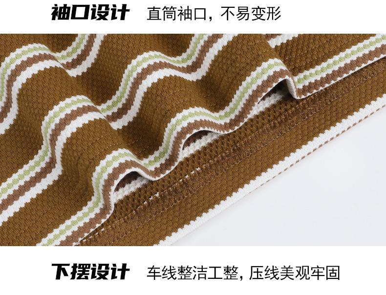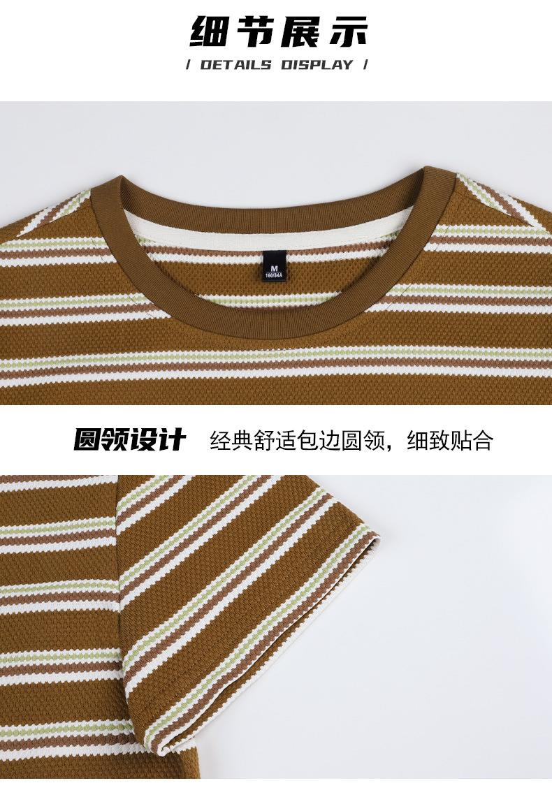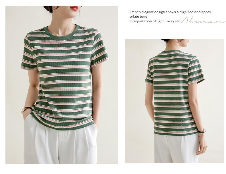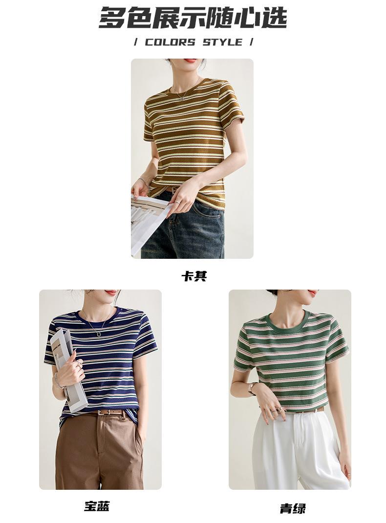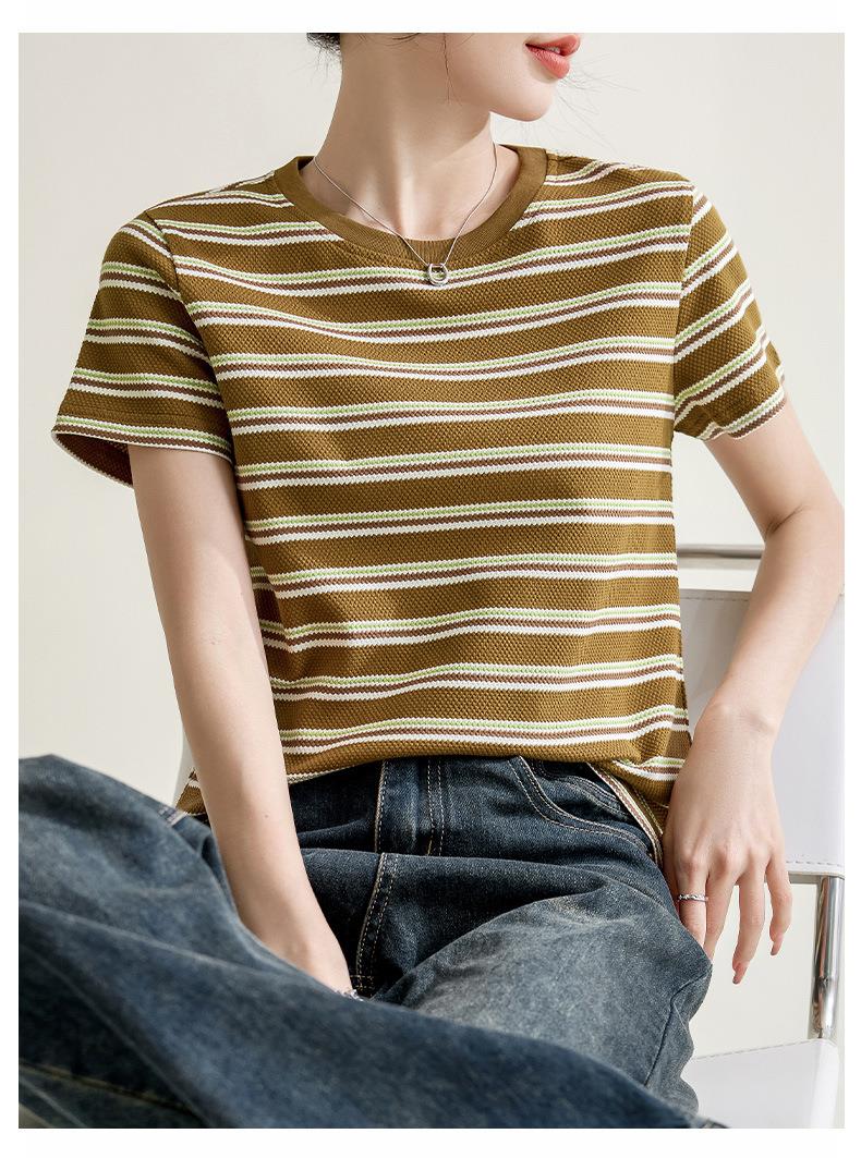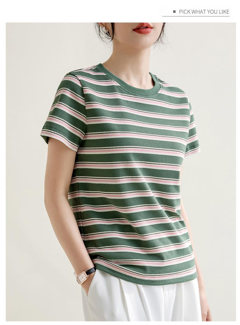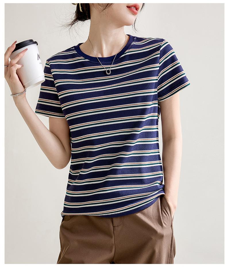 韩系小众圆领肌理感短袖T恤女2024春夏新款正肩修身条纹套头上衣