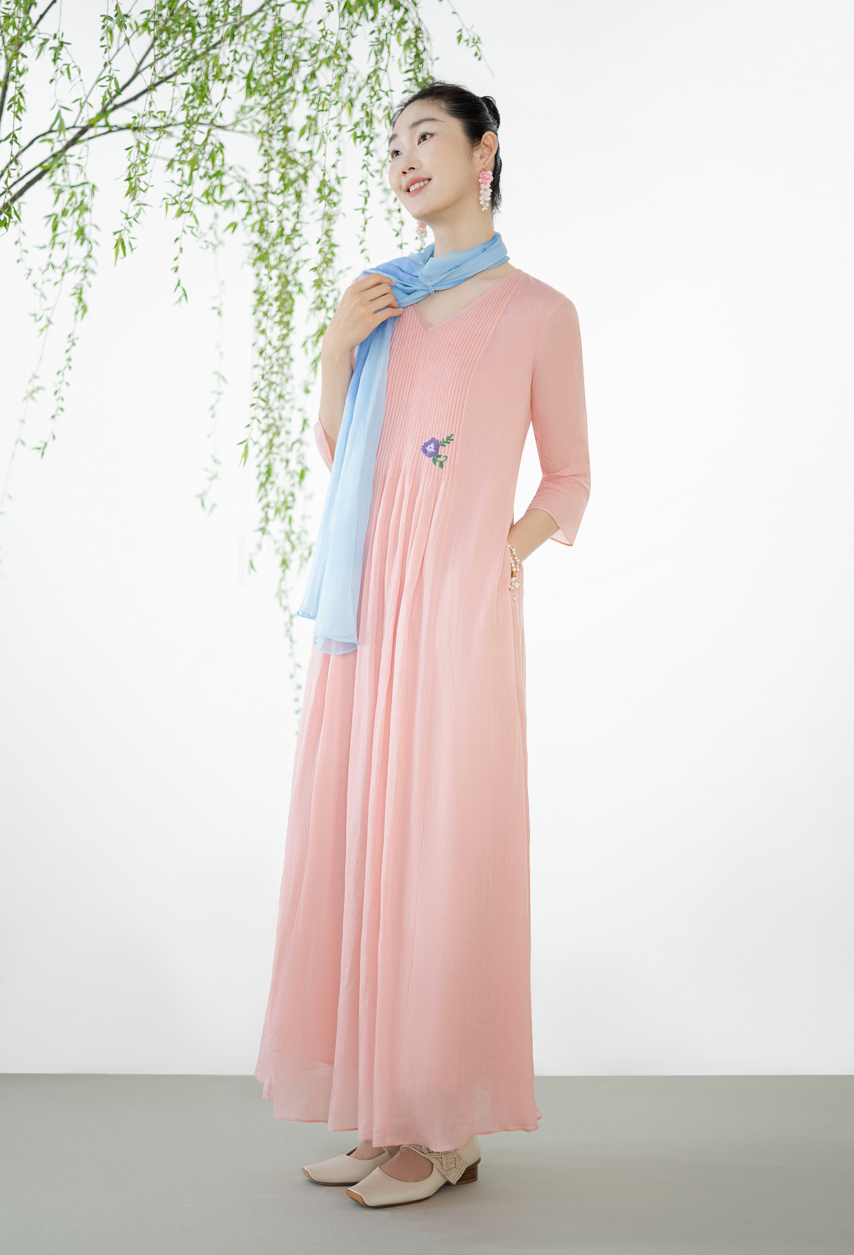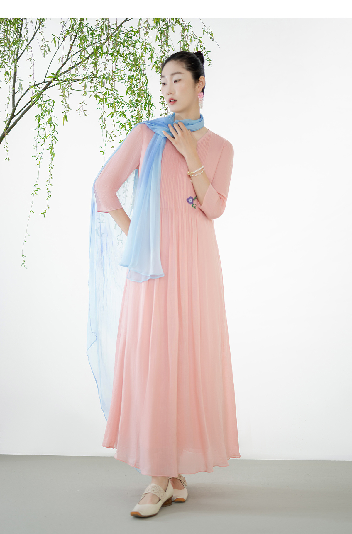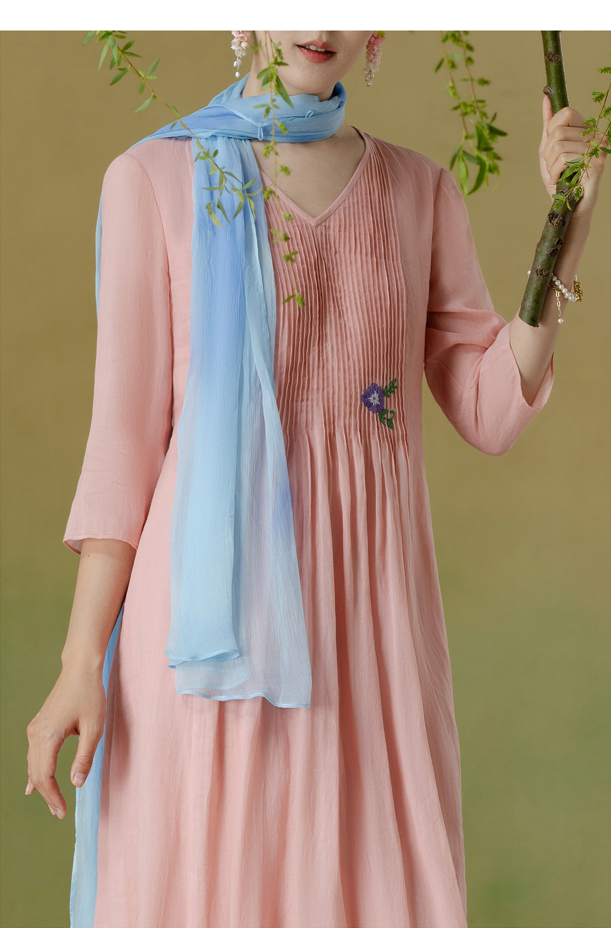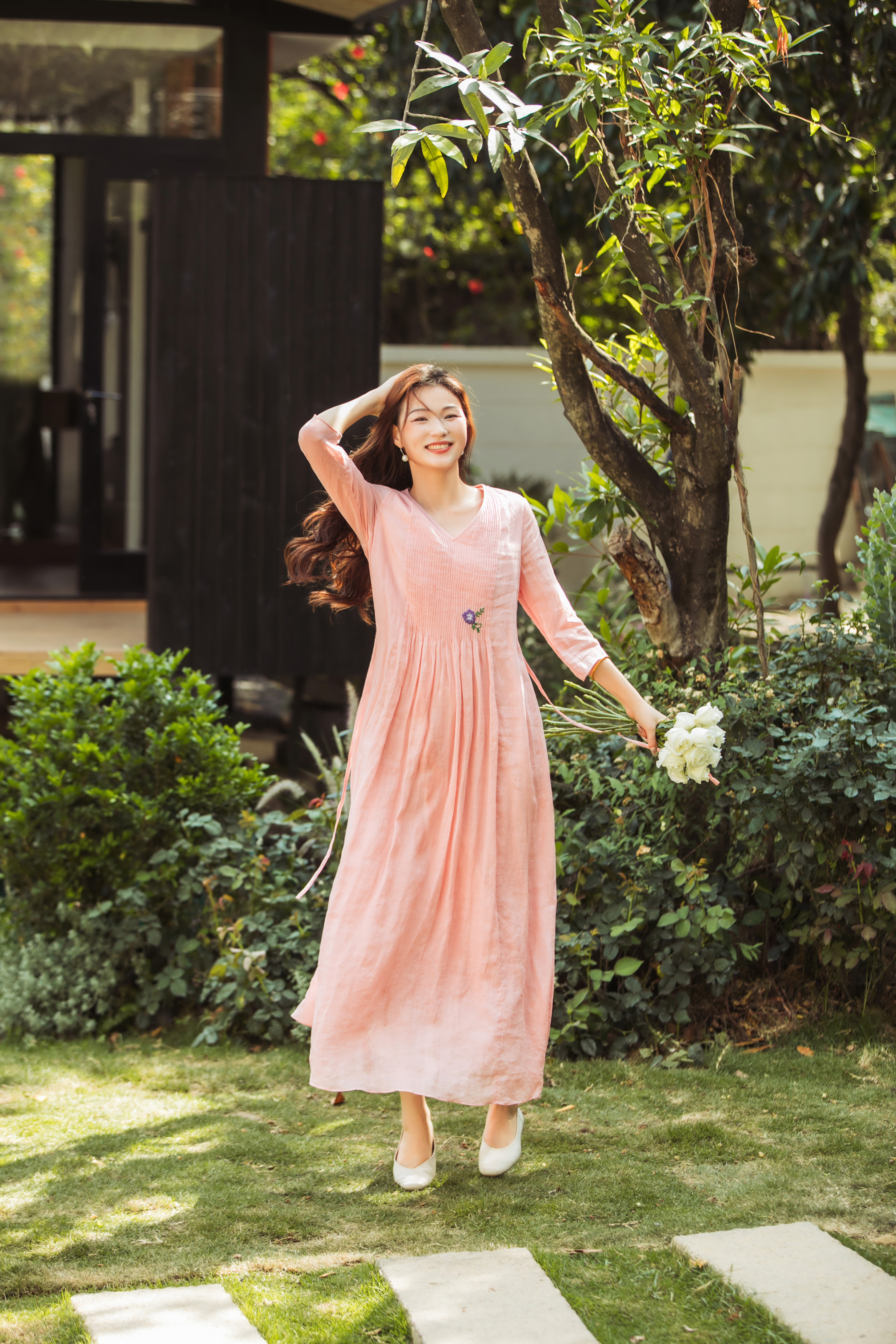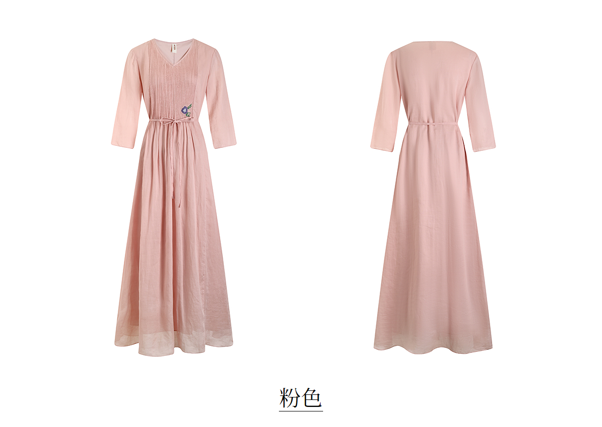 【林栖设计小店】(现货)苎麻连衣裙牙签褶优雅绣花修身2025夏季新品花仙子长裙女1952069