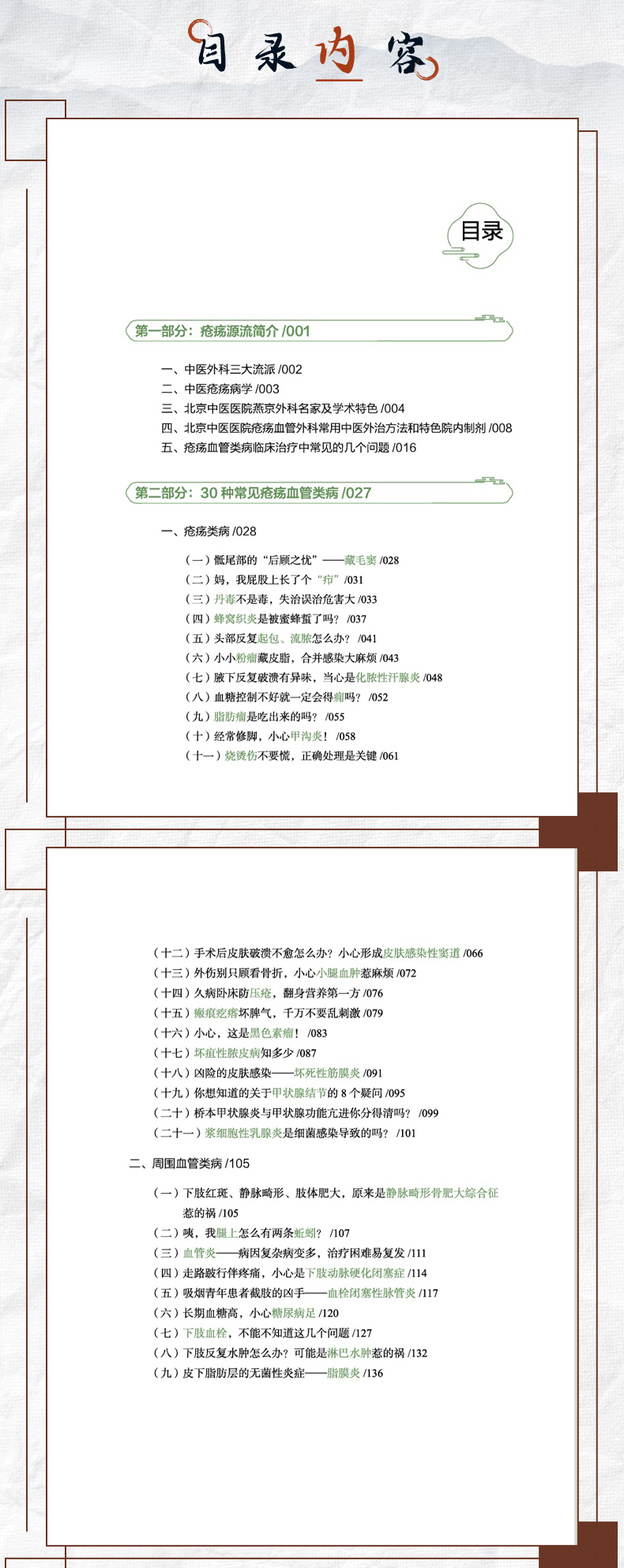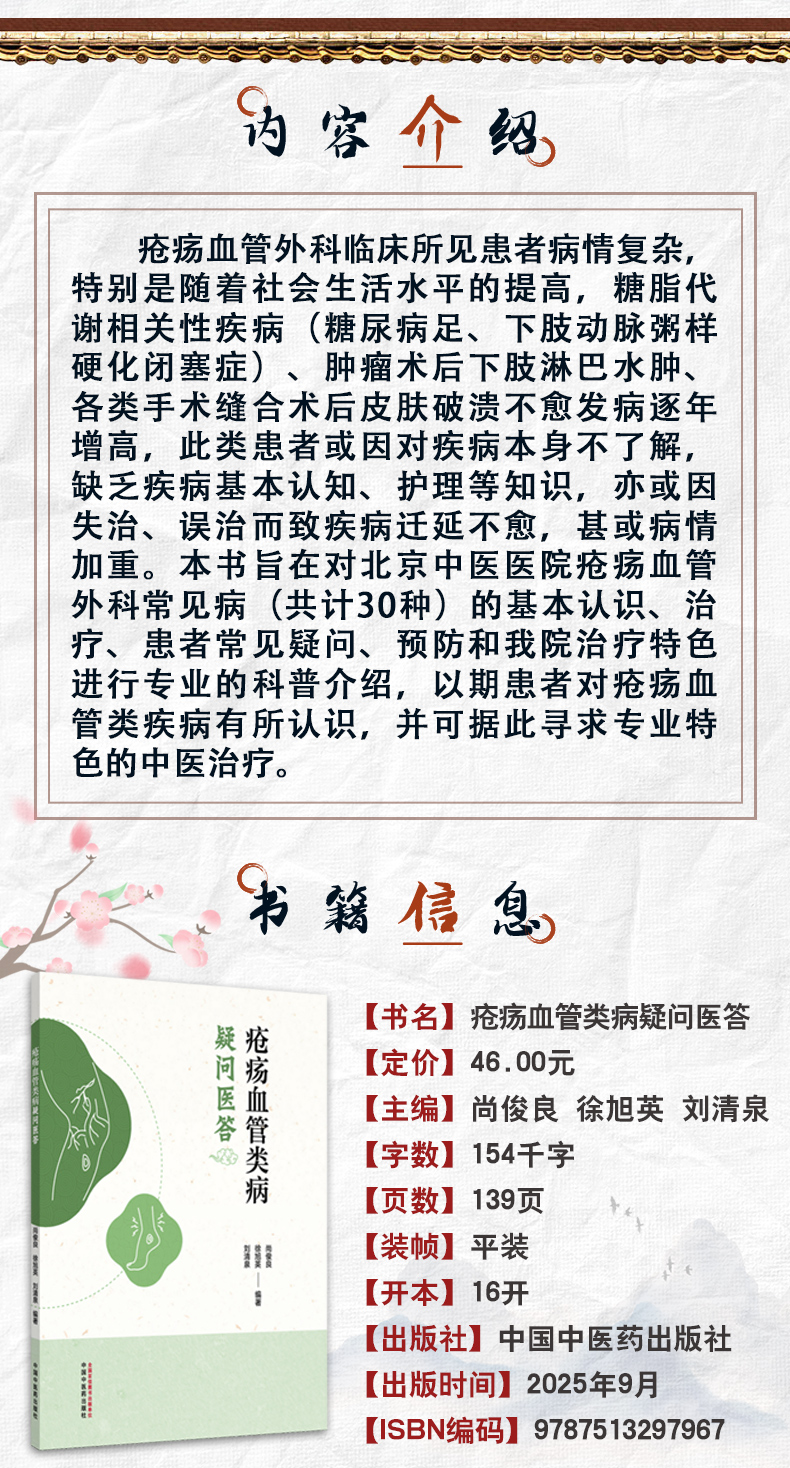 疮疡血管外科临床所见患者病情复杂,特别是随着社会生活水平的提高,糖脂代谢相关性疾病(糖尿病足、下肢动脉粥样硬化闭塞症)、肿瘤术后下肢淋巴水肿、各类手术缝合术后皮肤破溃不愈发病逐年增高,此类患者或因对疾病本身不了解,缺乏疾病基本认知、护理等知识,亦或因失治、误治而致疾病迁延不愈,甚或病情加重。本书旨在对北京中医医院疮疡血管外科常见病(共计30种)的基本认识、治疗、患者常见疑问、预防和我院治疗特色进行专业的科普介绍,以期患者对疮疡血管类疾病有所认识,并可据此寻求专业特色的中医治疗。
