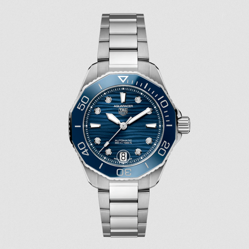 镜面 材质 | 蓝宝石水晶玻璃 | 表盘 | 精钢表壳 波浪纹蓝漆表盘 蓝色陶瓷单向旋转表圈 镶饰8颗VS级钻石(0.078克拉) 日期显示 |