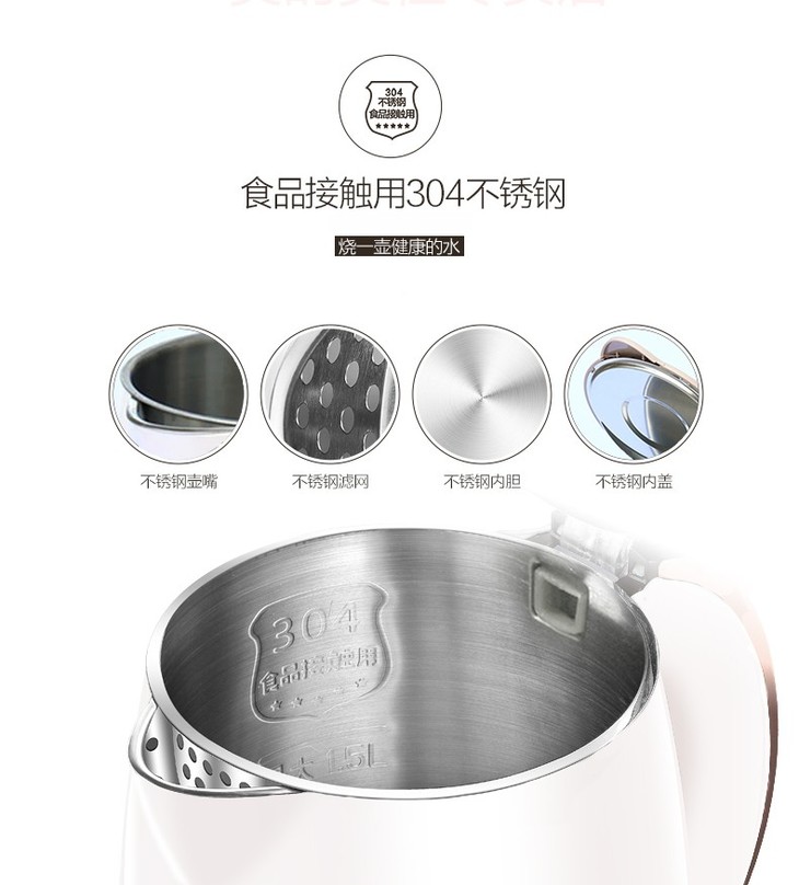 美的(Midea)(506596)电热水壶 H415E2j 1.5L大容量白色家用热水壶防烫防干烧 易清洗304不锈钢
