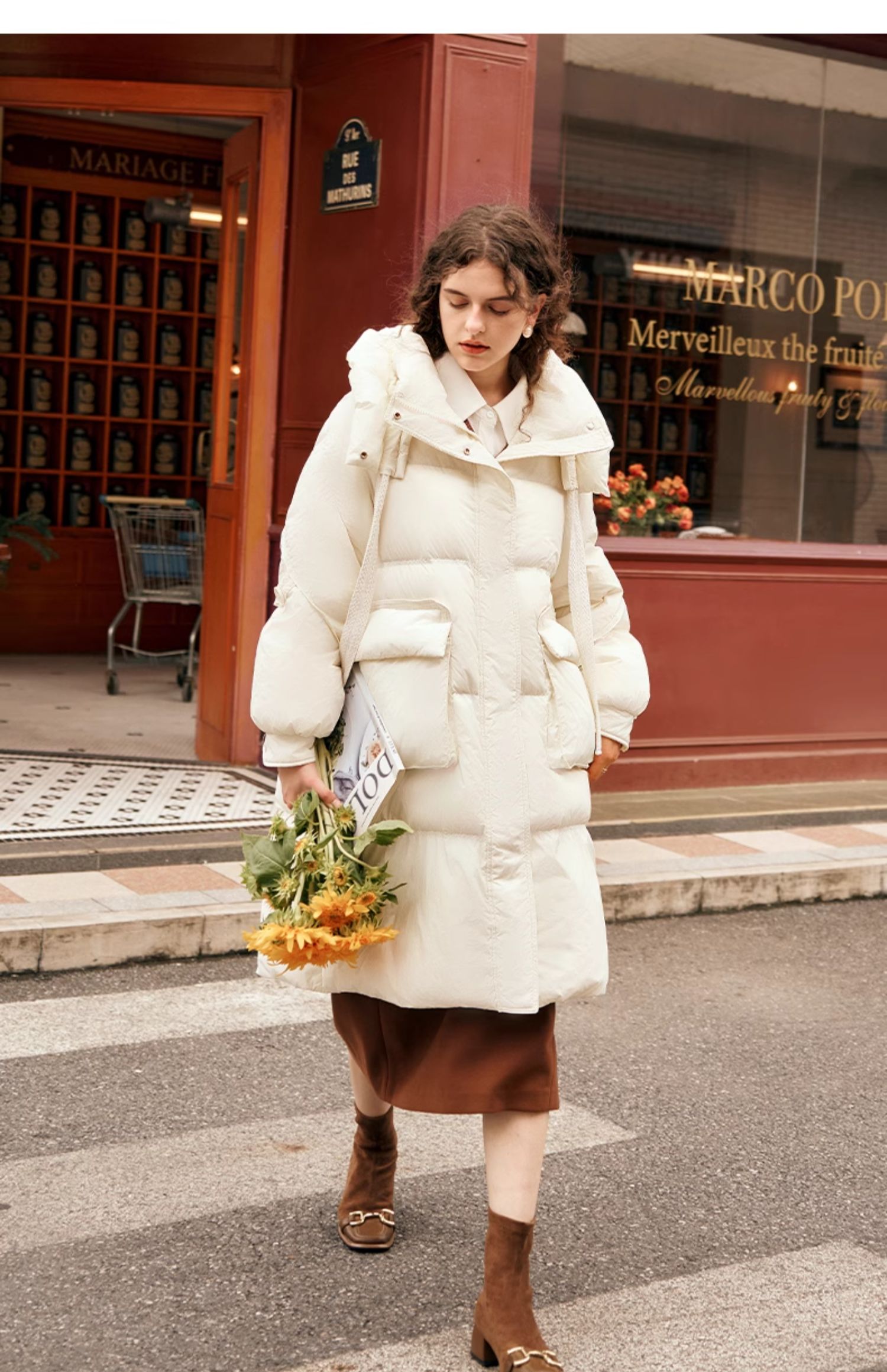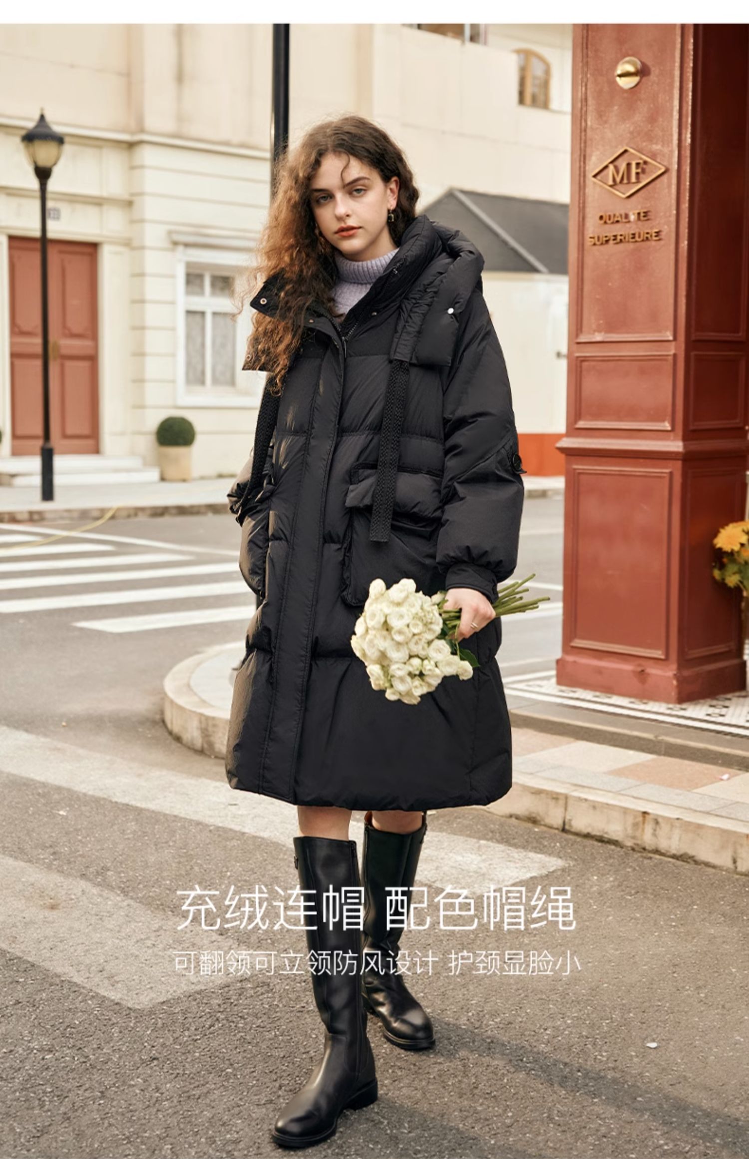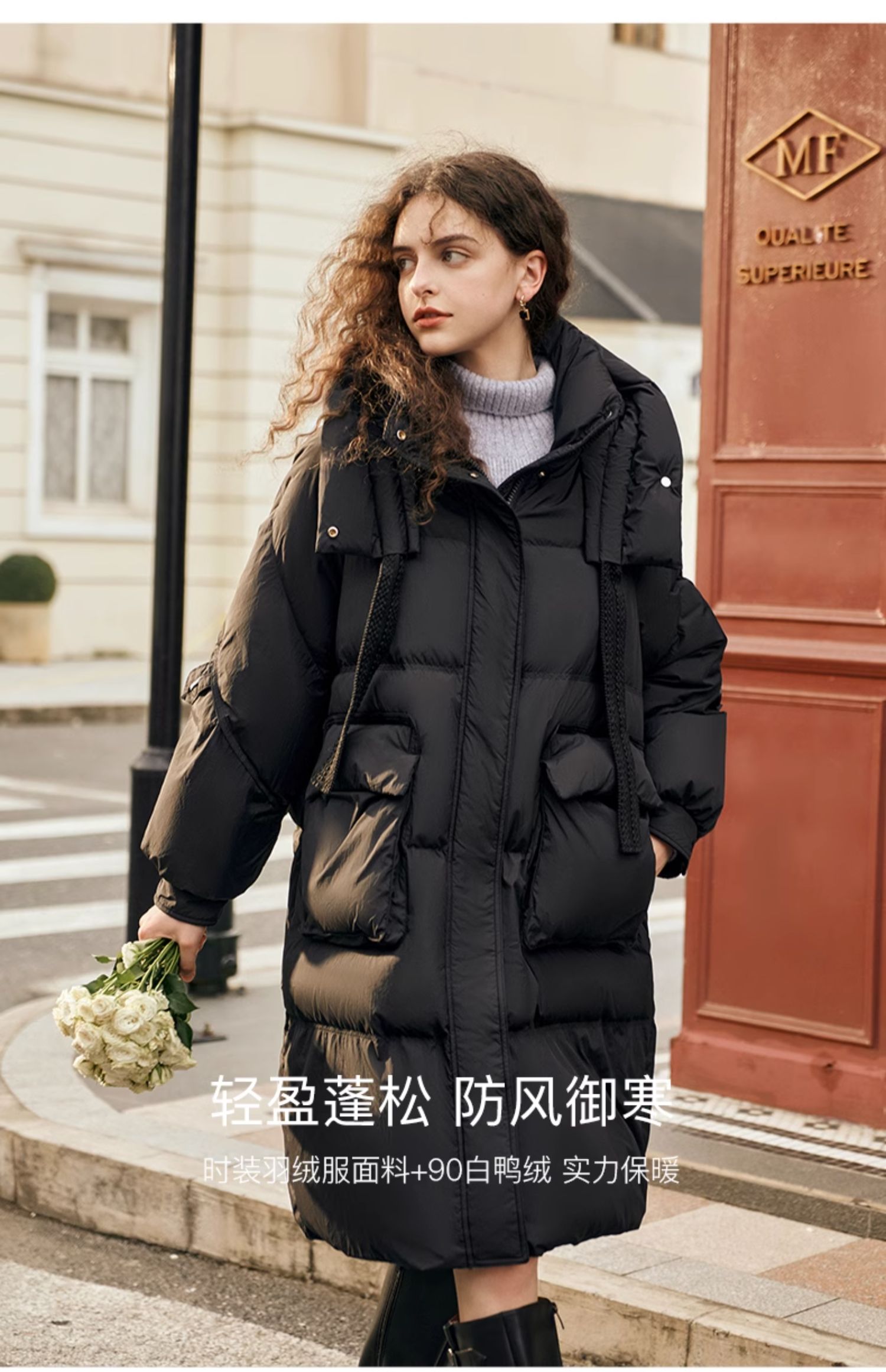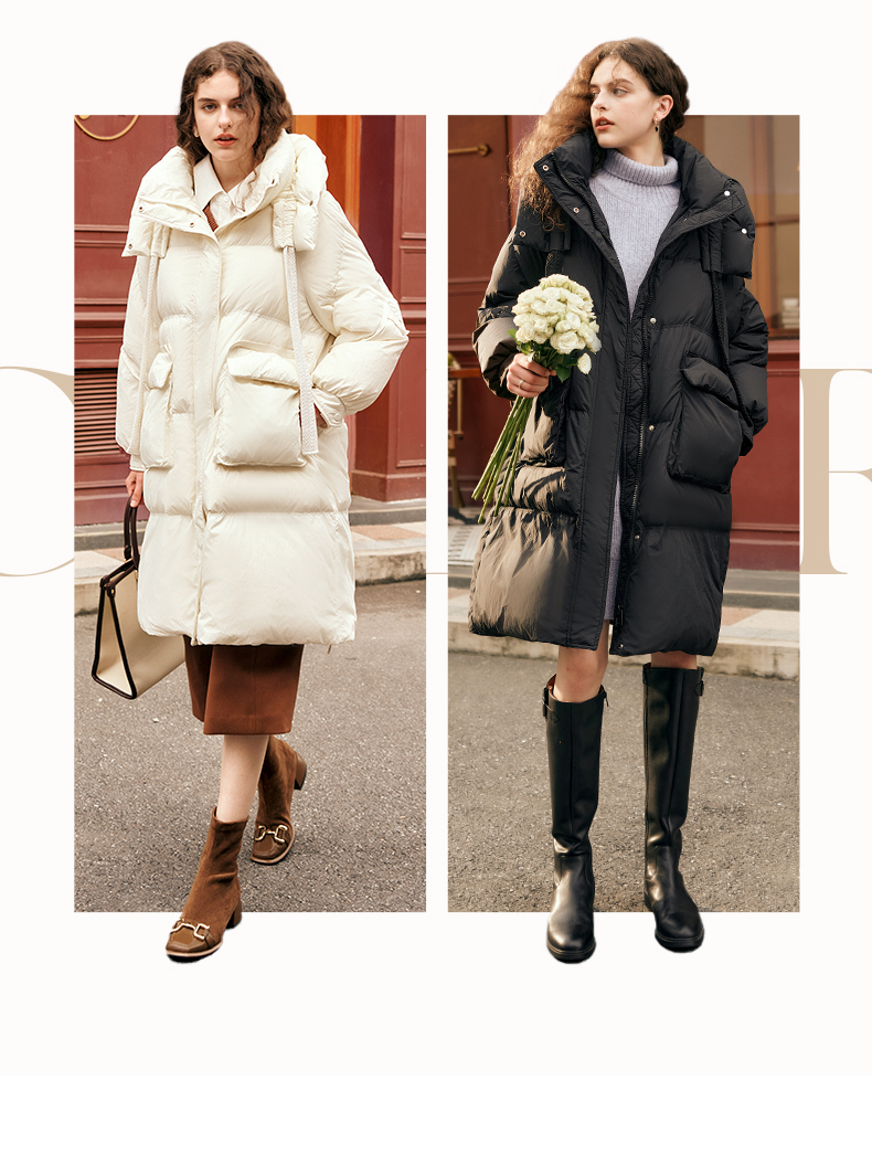 欧芮儿时尚宽松连帽系带长款羽绒服