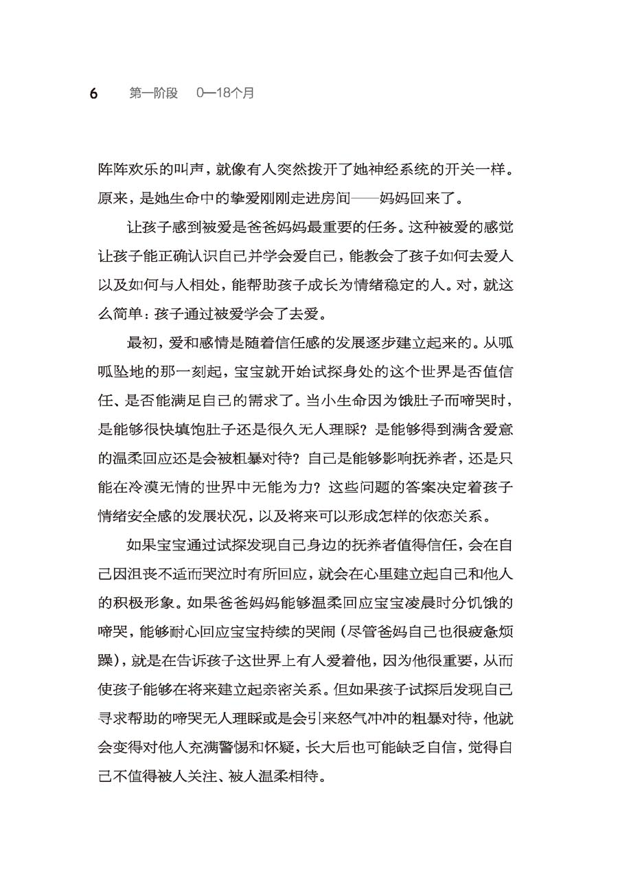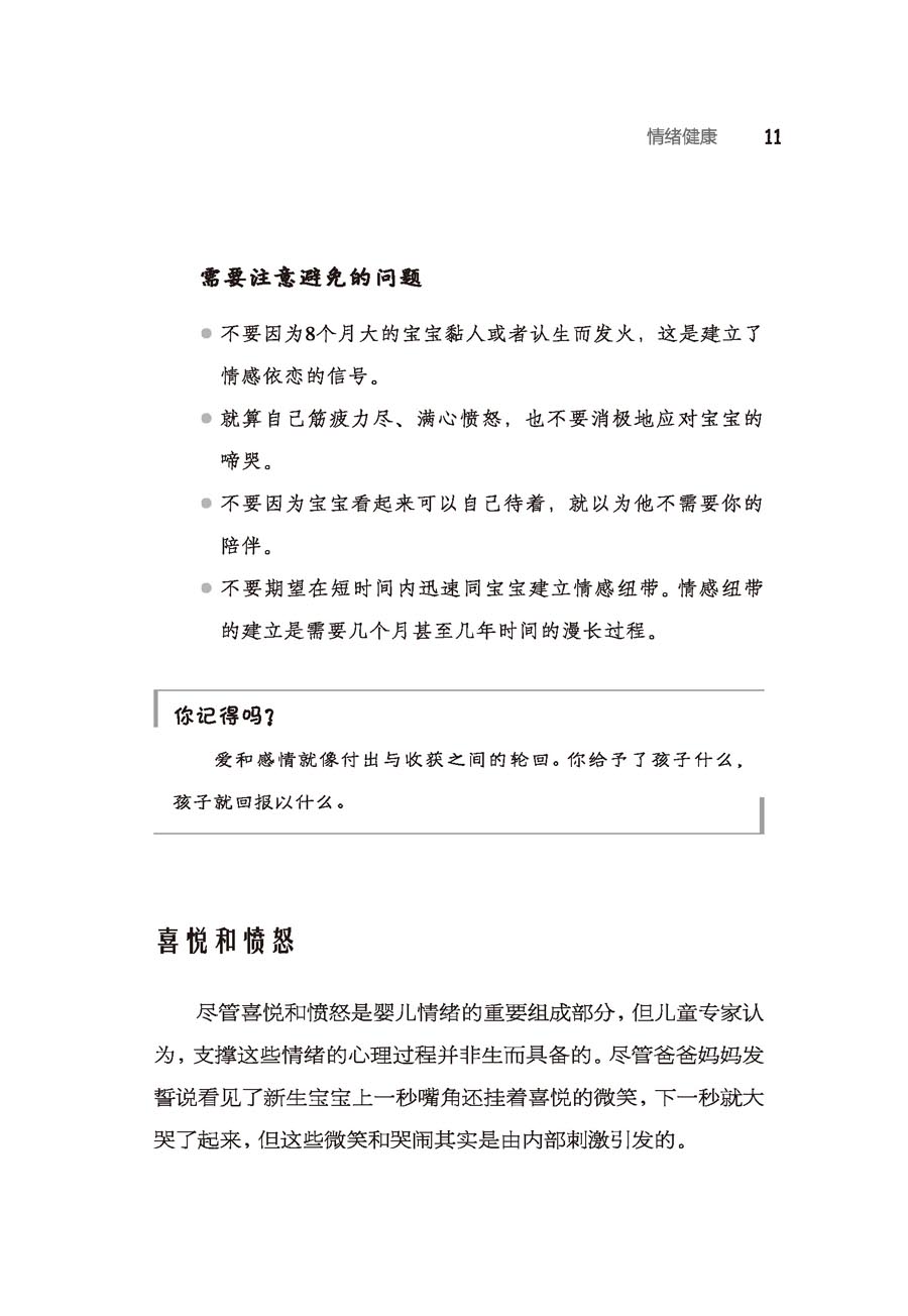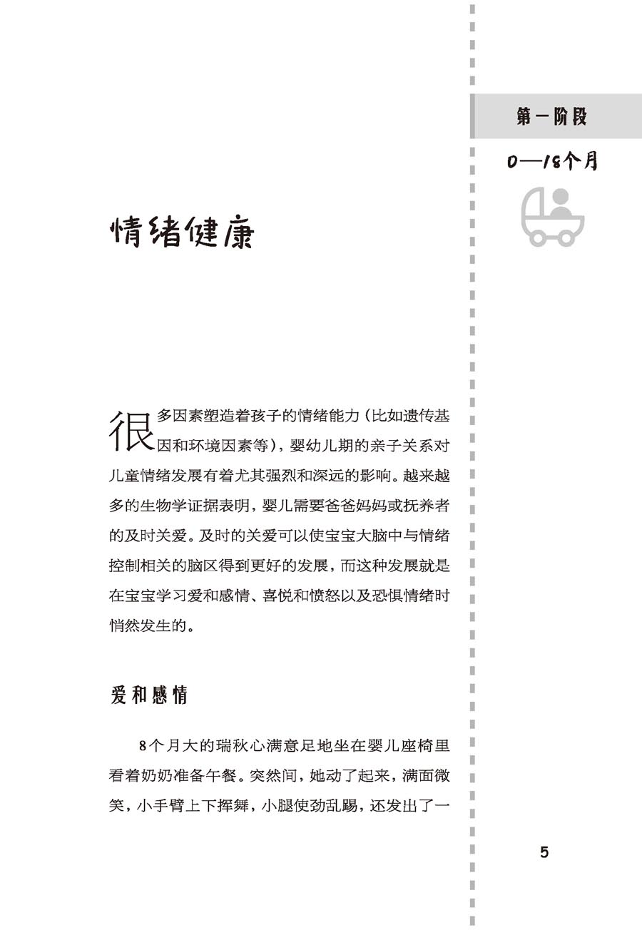 本书将儿童发展分成四个阶段:(1)0—18个月;(2)18—36个月;(3)36个月—6岁;(4)6—9岁。对于每个阶段,书中都介绍了与成长密切相关的五个方面:(1)情绪健康;(2)认知发展;(3)家庭和同伴关系;(4)个体成长;(5)性格形成。这种编排方式有助于父母看到孩子成长的连续性。比如,读到有关2岁幼儿想象力的内容之后,可以跳到后面继续了解4岁孩子的想象力会发生哪些变化。这种编排方式也有助于有多个宝宝的父母理解他们的情绪和心理为什么那么不同,比如为什么1岁的孩子与5岁的孩子表达愤怒的方式那么不同。这样的结构还可以告诉你应该如何随着孩子年龄的增长改变养育策略。比如,在帮助幼儿和9岁儿童应对同伴压力时分别需要采取什么样的策略。