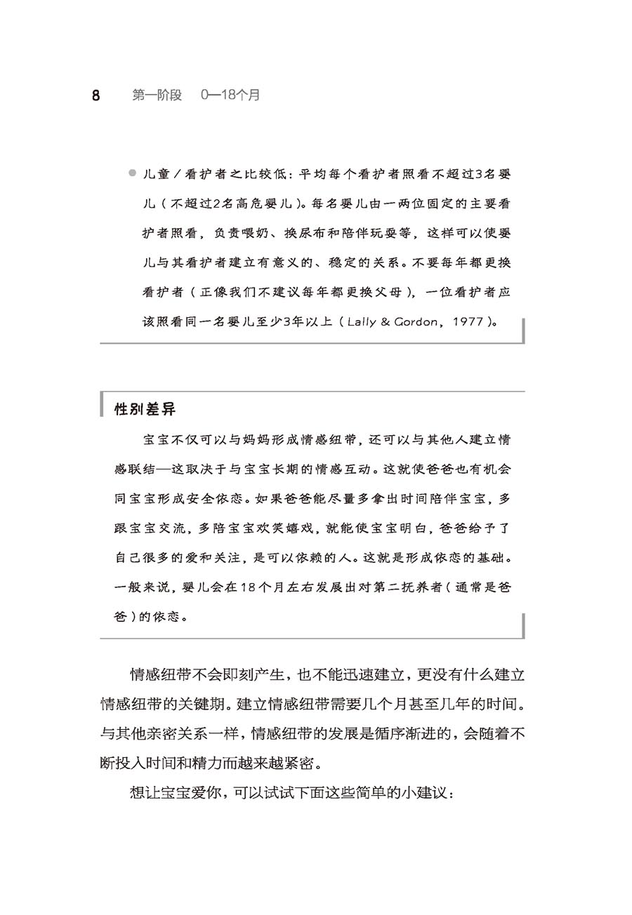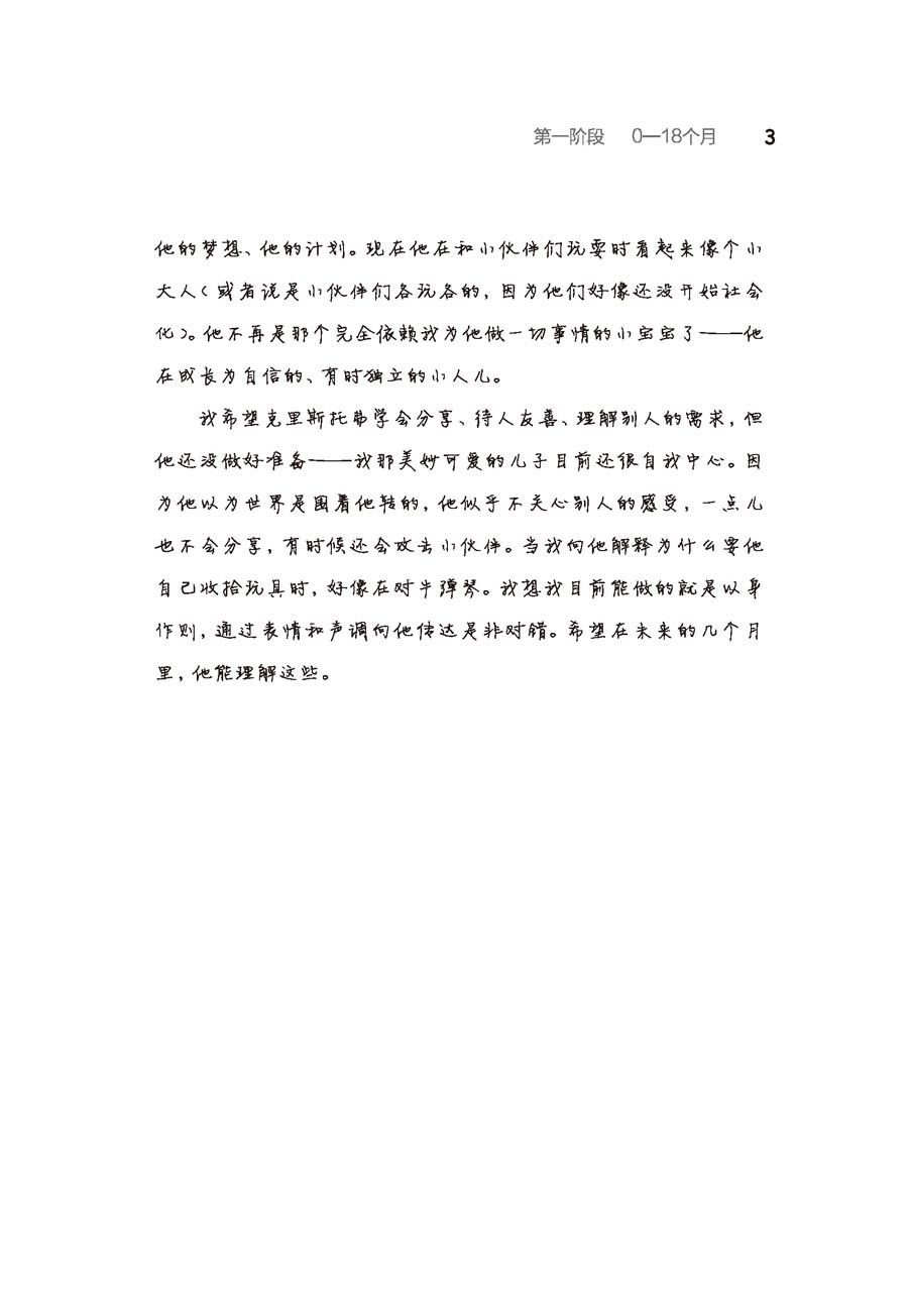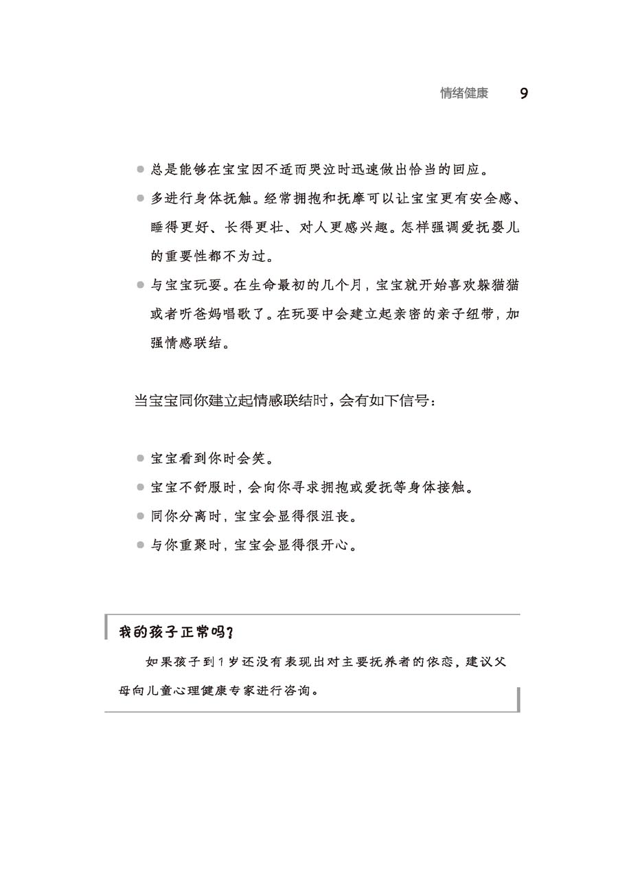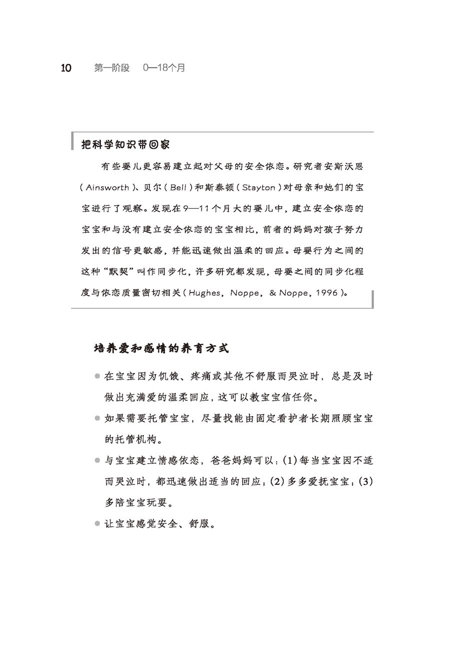 本书将儿童发展分成四个阶段:(1)0—18个月;(2)18—36个月;(3)36个月—6岁;(4)6—9岁。对于每个阶段,书中都介绍了与成长密切相关的五个方面:(1)情绪健康;(2)认知发展;(3)家庭和同伴关系;(4)个体成长;(5)性格形成。这种编排方式有助于父母看到孩子成长的连续性。比如,读到有关2岁幼儿想象力的内容之后,可以跳到后面继续了解4岁孩子的想象力会发生哪些变化。这种编排方式也有助于有多个宝宝的父母理解他们的情绪和心理为什么那么不同,比如为什么1岁的孩子与5岁的孩子表达愤怒的方式那么不同。这样的结构还可以告诉你应该如何随着孩子年龄的增长改变养育策略。比如,在帮助幼儿和9岁儿童应对同伴压力时分别需要采取什么样的策略。