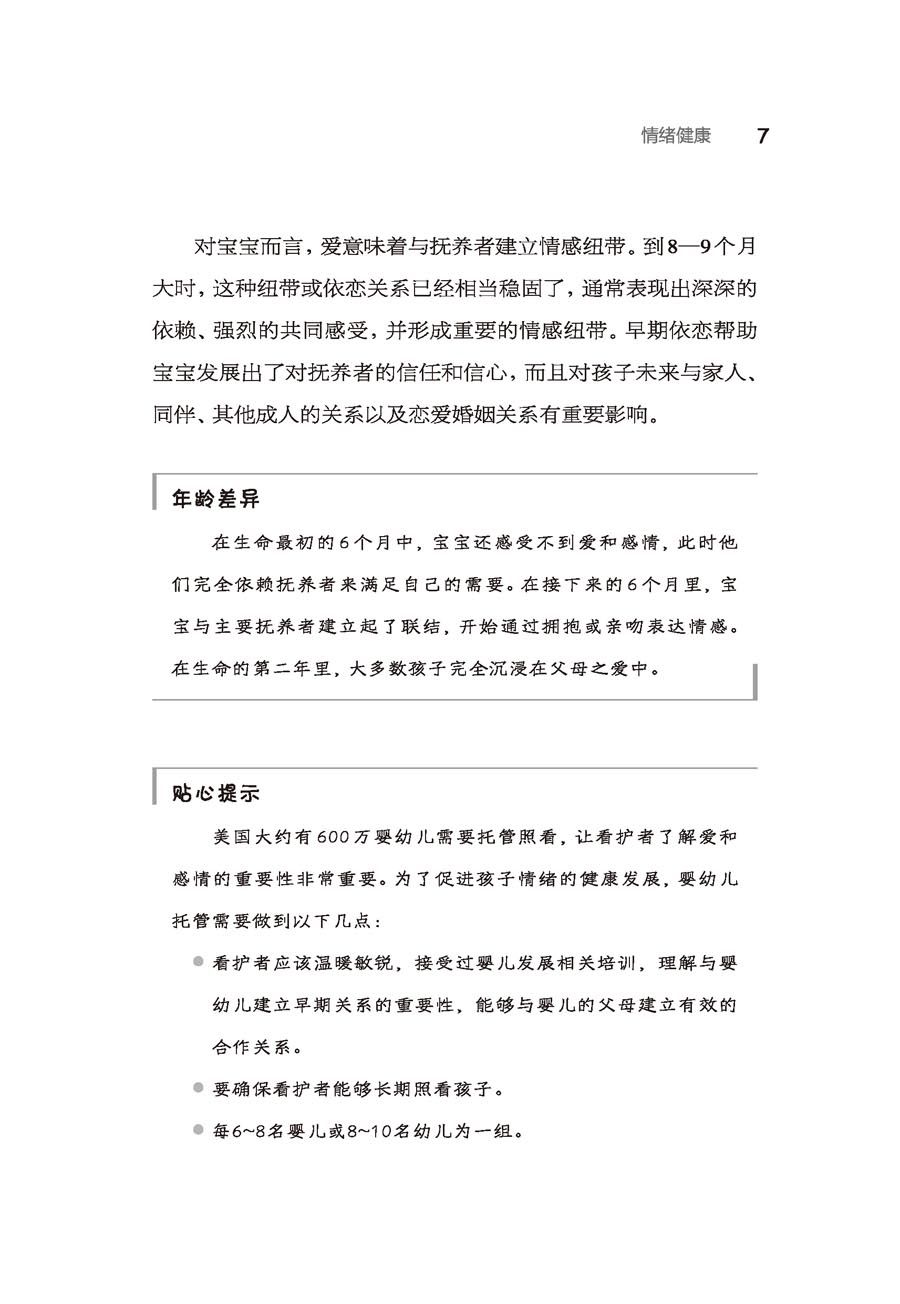 美国大约有600万婴幼儿需要托管照看,让看护者了解爱和感情的重要性非常重要。为了促进孩子情绪的健康发展,婴幼儿托管需要做到以下几点: