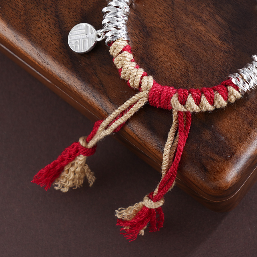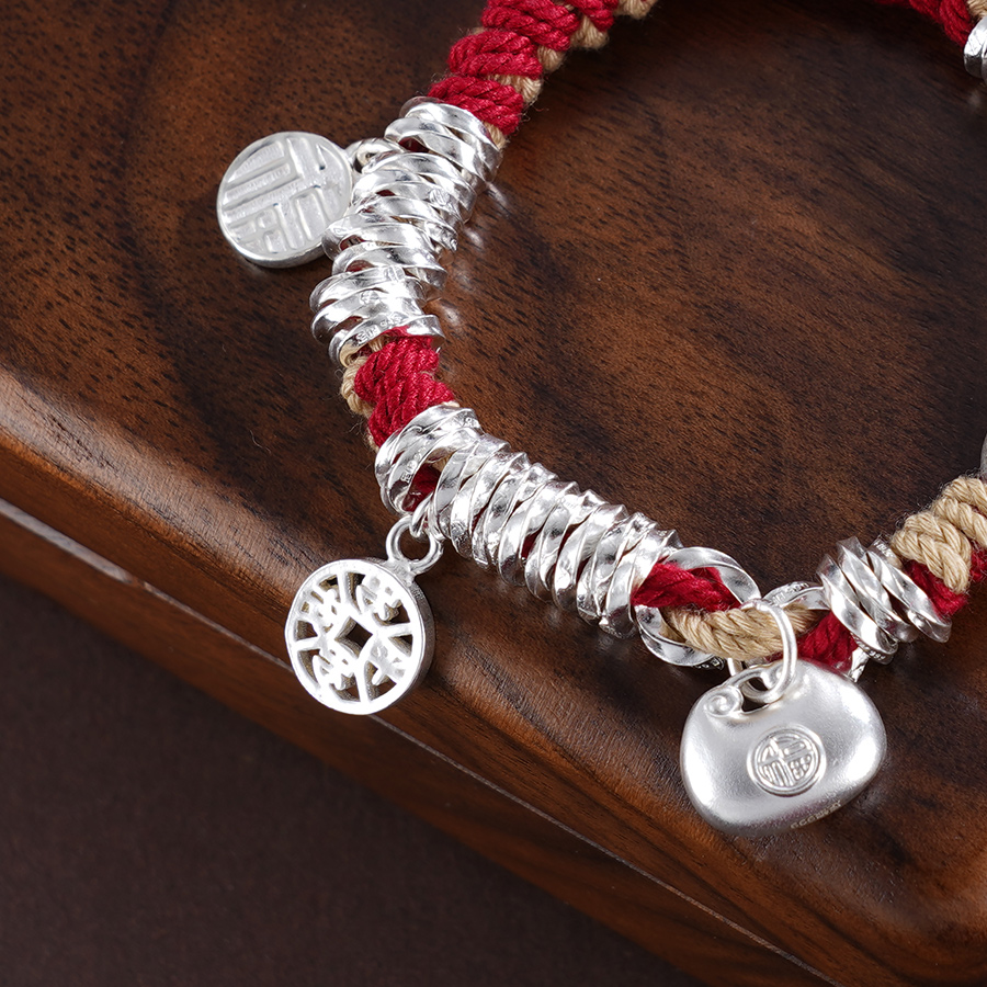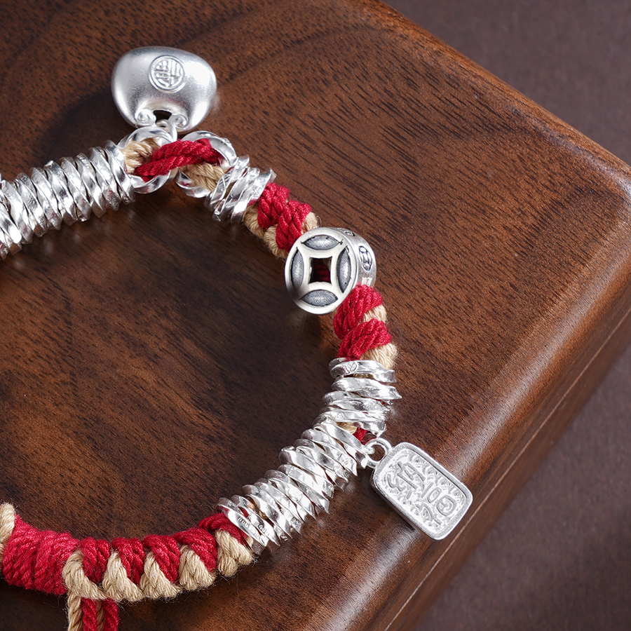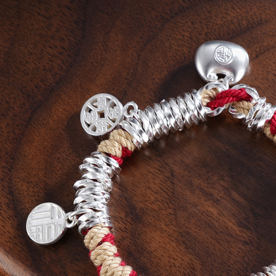 【寓意】:纯银盘缠手串,搭配流苏设计,灵动又飘逸。红色彩绳点缀,为穿搭增添亮点,还能为佩戴者增添好运。