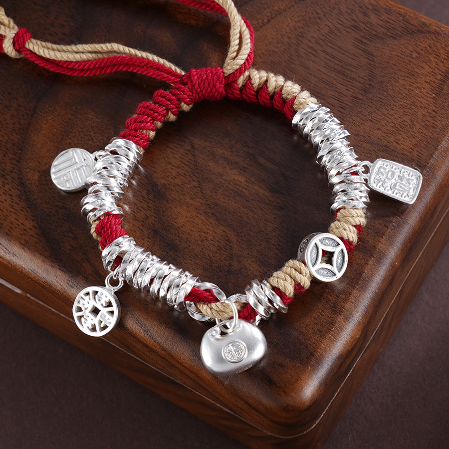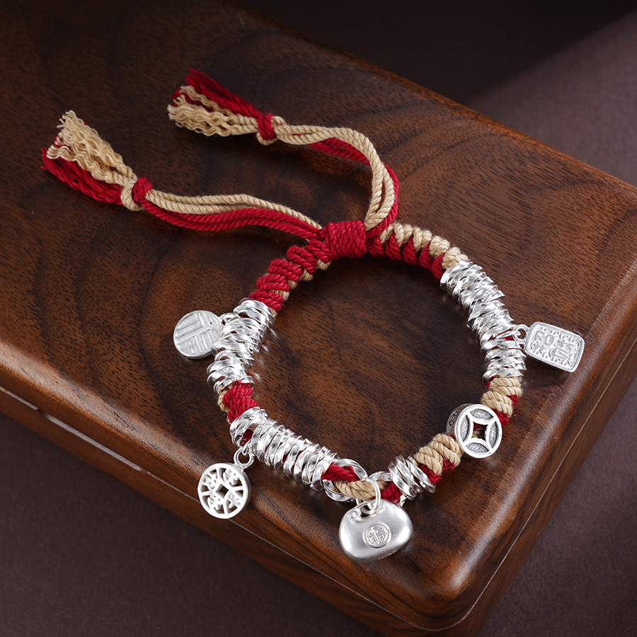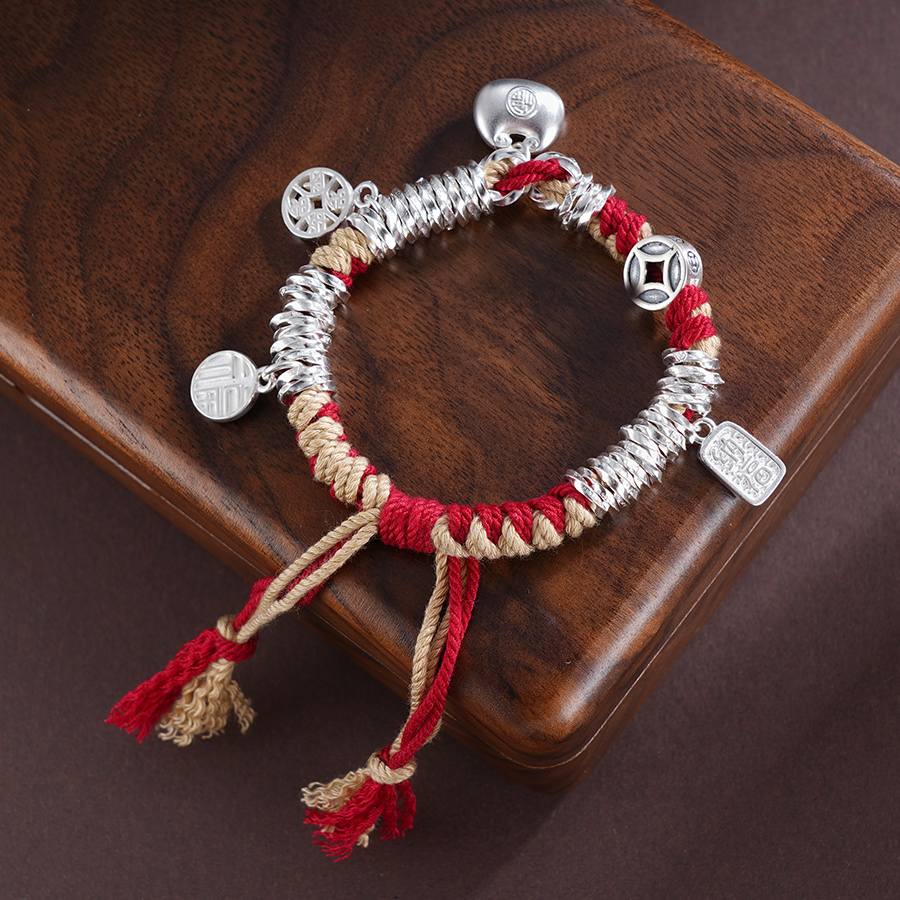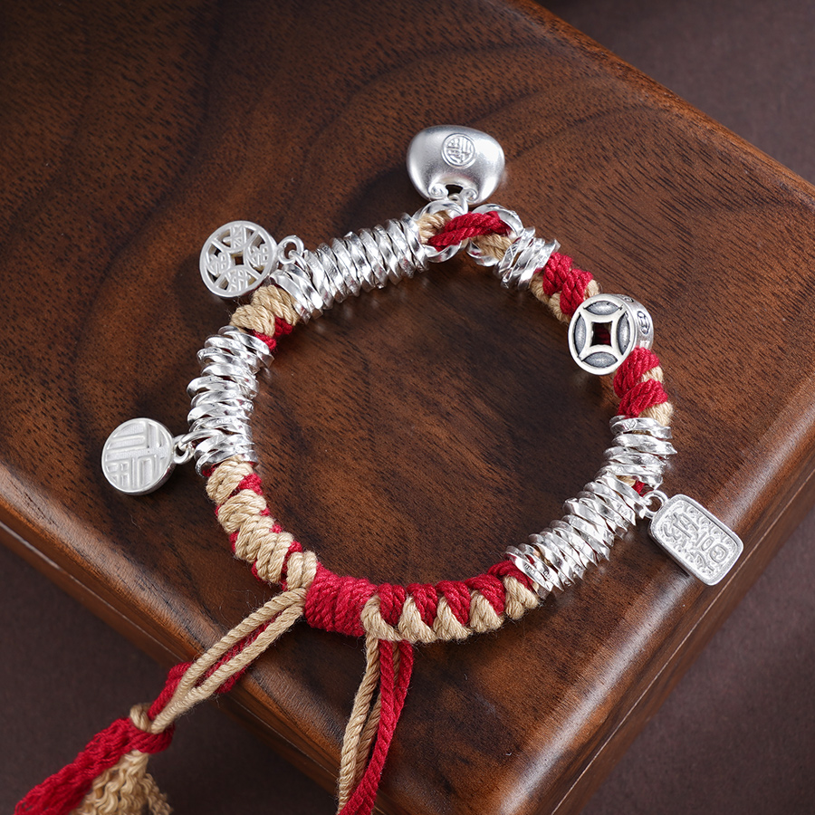 【寓意】:纯银盘缠手串,搭配流苏设计,灵动又飘逸。红色彩绳点缀,为穿搭增添亮点,还能为佩戴者增添好运。