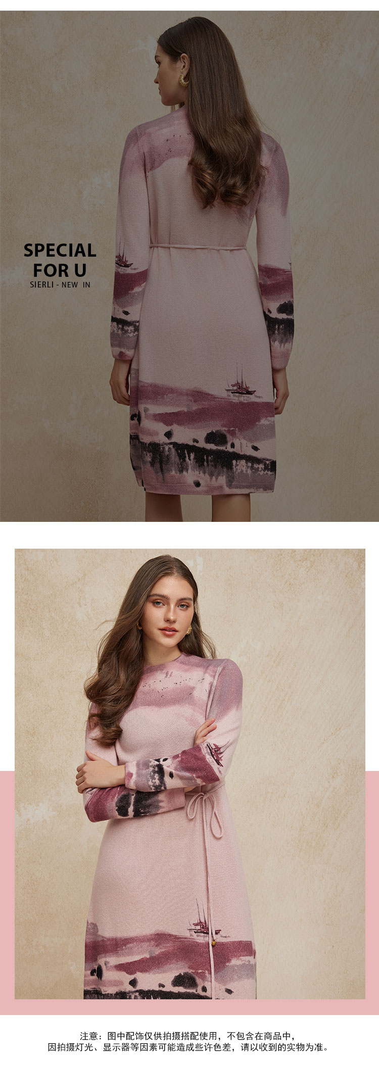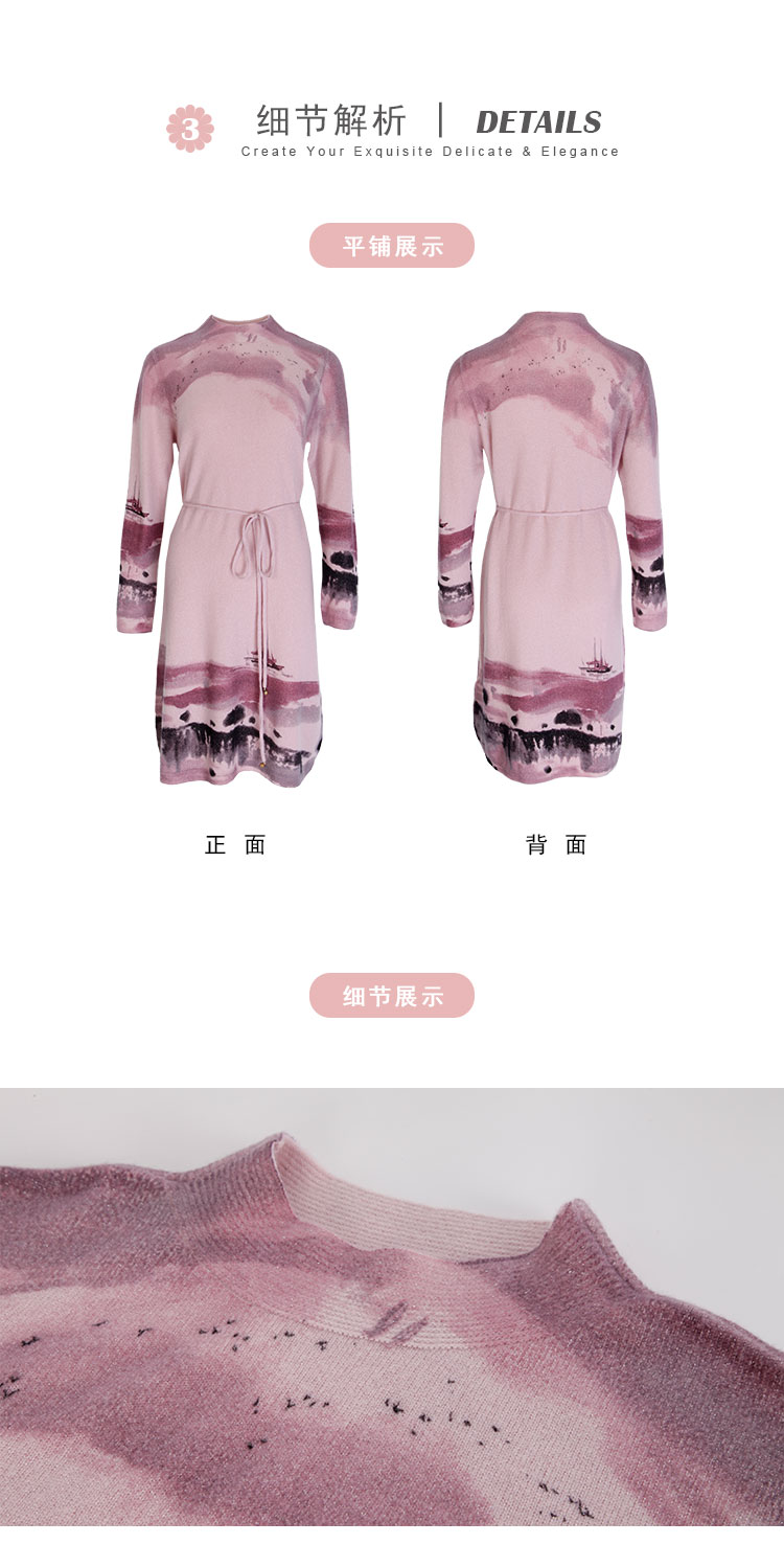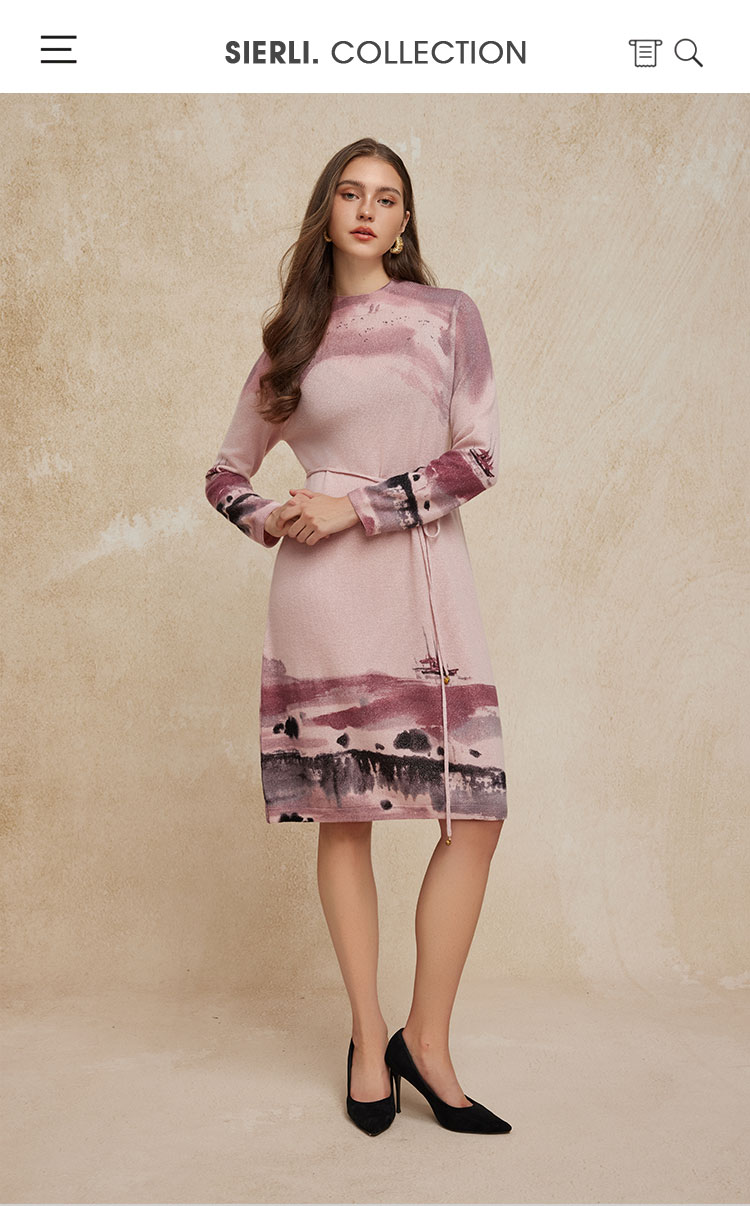 PH608斯尔丽24新款水墨印花国风半高领长袖柔软保暖针织连衣裙