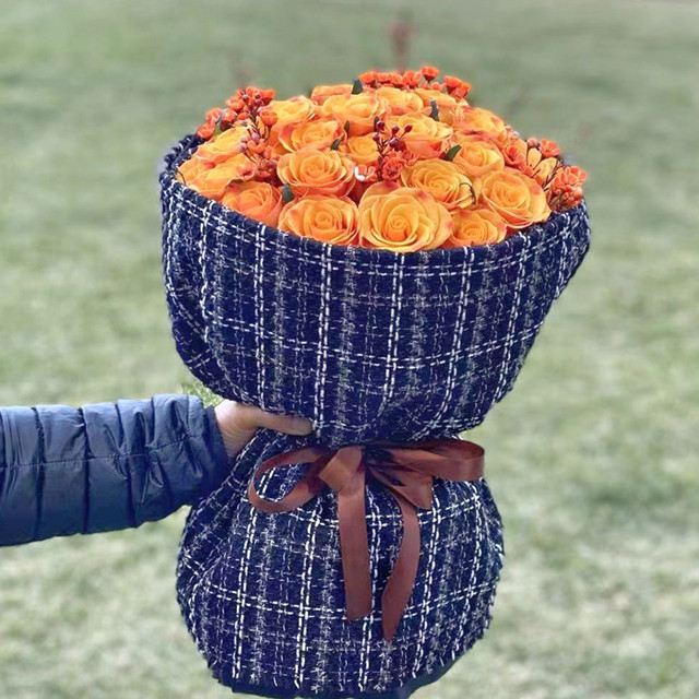 精选花材:33支精品辉煌玫瑰,配橘色澳洲腊梅,黑白小香风包装