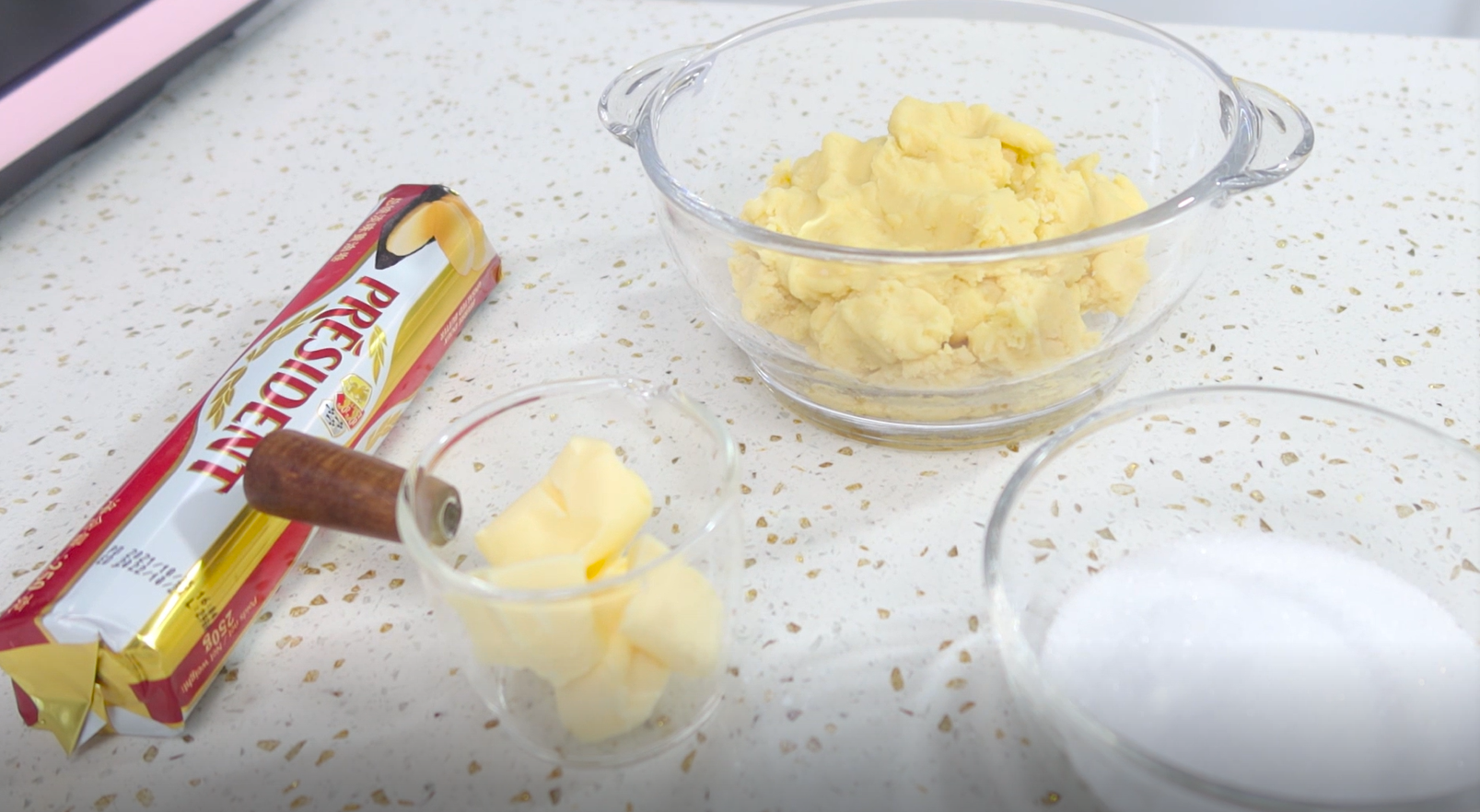 之后加入甜度仅为四分之一白砂糖的海藻糖,在比例上再直降一半,黄油选用总统牌黄油,是动物性黄油,不含反式脂肪酸,一般比较高端的烘焙糕点才用它。