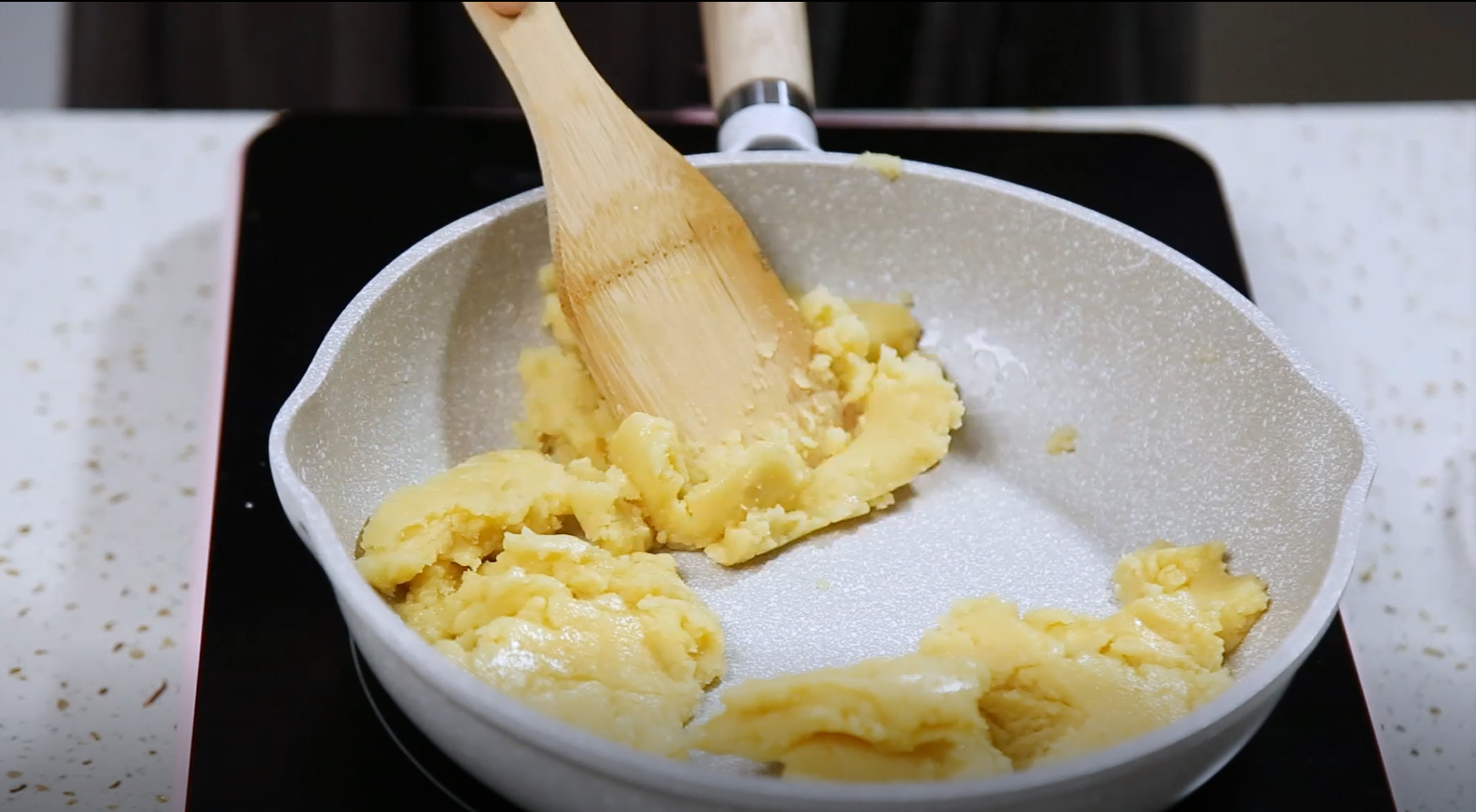 再进行小锅炒制,需要不停的翻炒,注意火候,很容易焦。翻炒至水份收缩,当所有食材融为一体,绿豆泥变得更加丝滑、细腻,还保留了绿豆清爽本味。