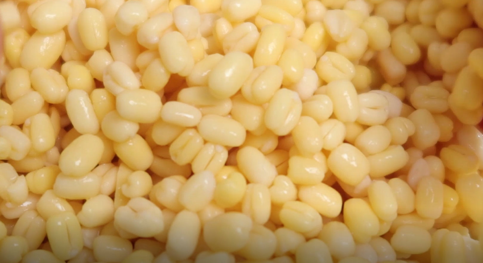 豆壳随着浸泡时间的推移会慢慢绽开淡黄色的内仁。褪去的绿色外衣,呈黄色内在,是制作绿豆糕的上好原料。