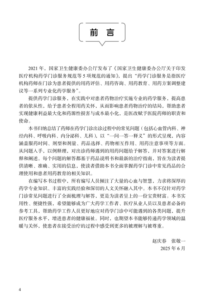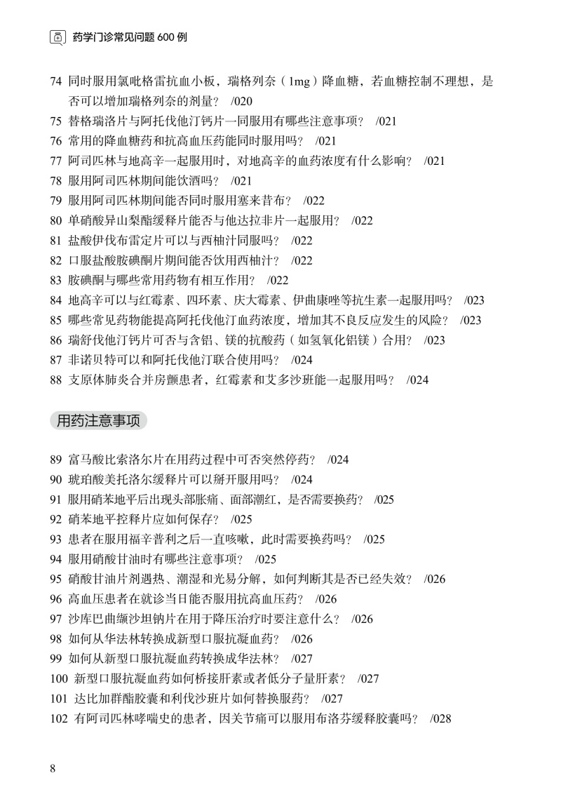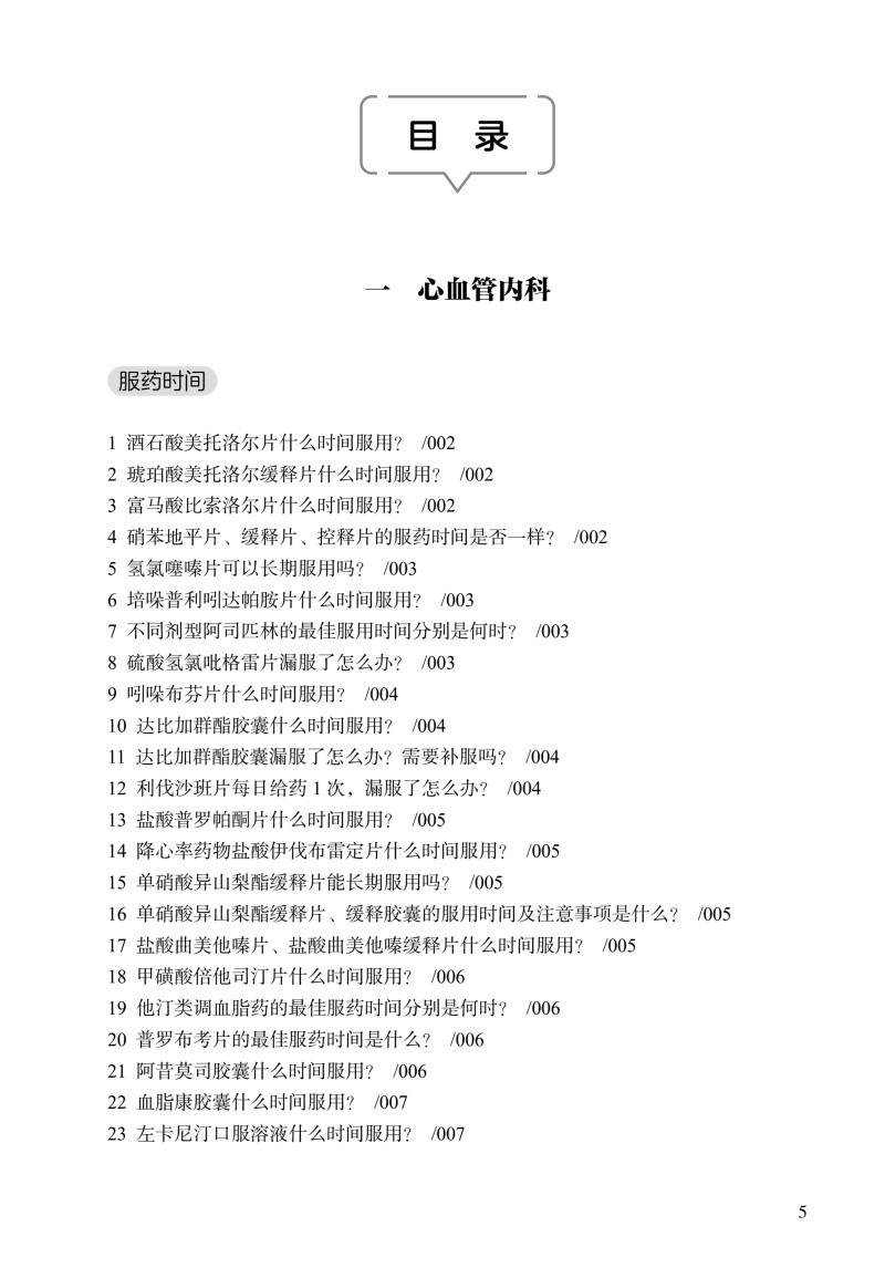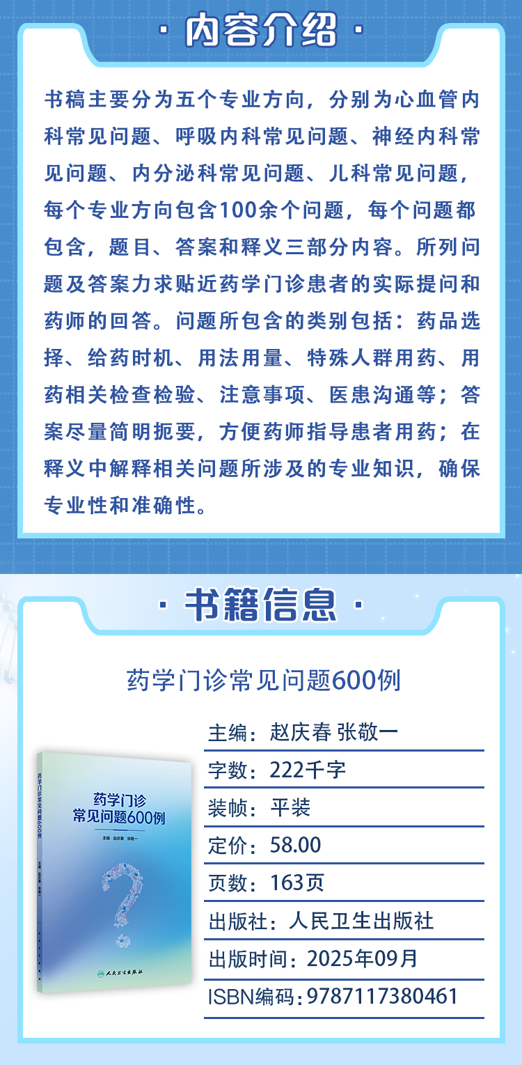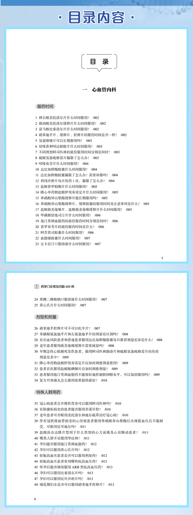 书稿主要分为五个专业方向,分别为心血管内科常见问题、呼吸内科常见问题、神经内科常见问题、内分泌科常见问题、儿科常见问题,每个专业方向包含100余个问题,每个问题都包含,题目、答案和释义三部分内容。所列问题及答案力求贴近药学门诊患者的实际提问和药师的回答。问题所包含的类别包括:药品选择、给药时机、用法用量、特殊人群用药、用药相关检查检验、注意事项、医患沟通等;答案尽量简明扼要,方便药师指导患者用药;在释义中解释相关问题所涉及的专业知识,确保专业性和准确性。