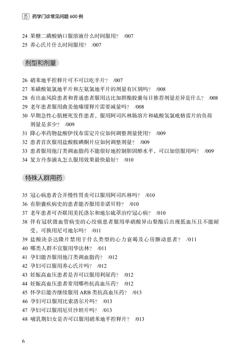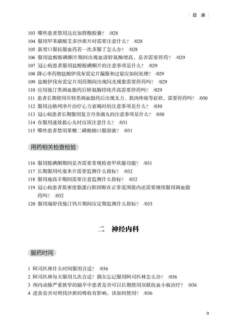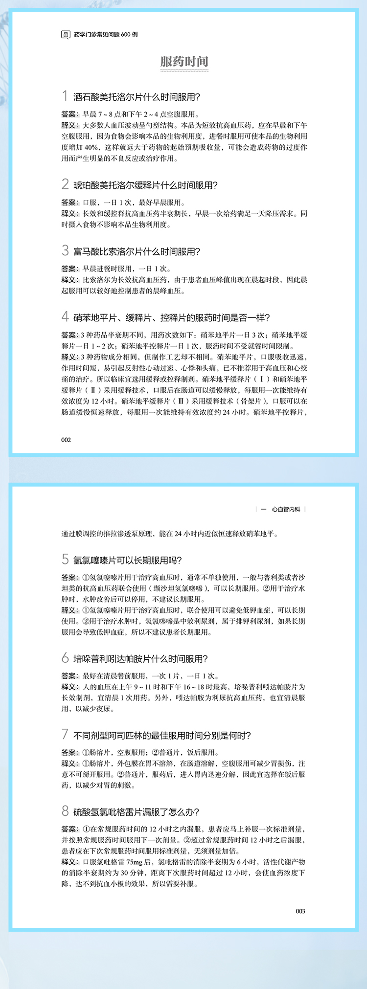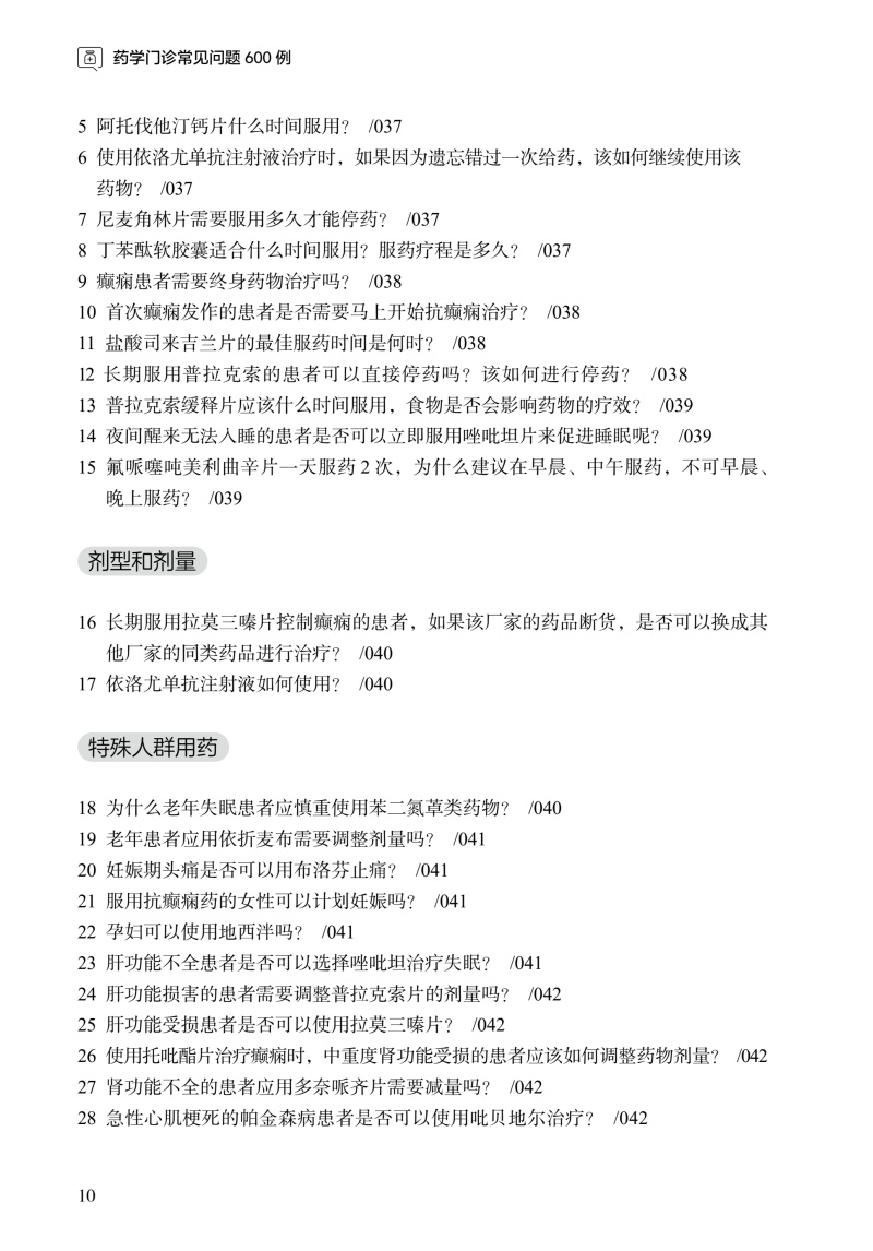 书稿主要分为五个专业方向,分别为心血管内科常见问题、呼吸内科常见问题、神经内科常见问题、内分泌科常见问题、儿科常见问题,每个专业方向包含100余个问题,每个问题都包含,题目、答案和释义三部分内容。所列问题及答案力求贴近药学门诊患者的实际提问和药师的回答。问题所包含的类别包括:药品选择、给药时机、用法用量、特殊人群用药、用药相关检查检验、注意事项、医患沟通等;答案尽量简明扼要,方便药师指导患者用药;在释义中解释相关问题所涉及的专业知识,确保专业性和准确性。