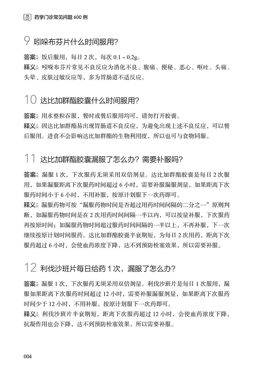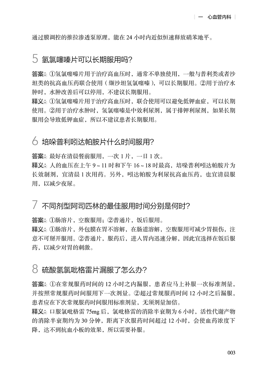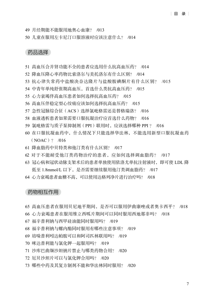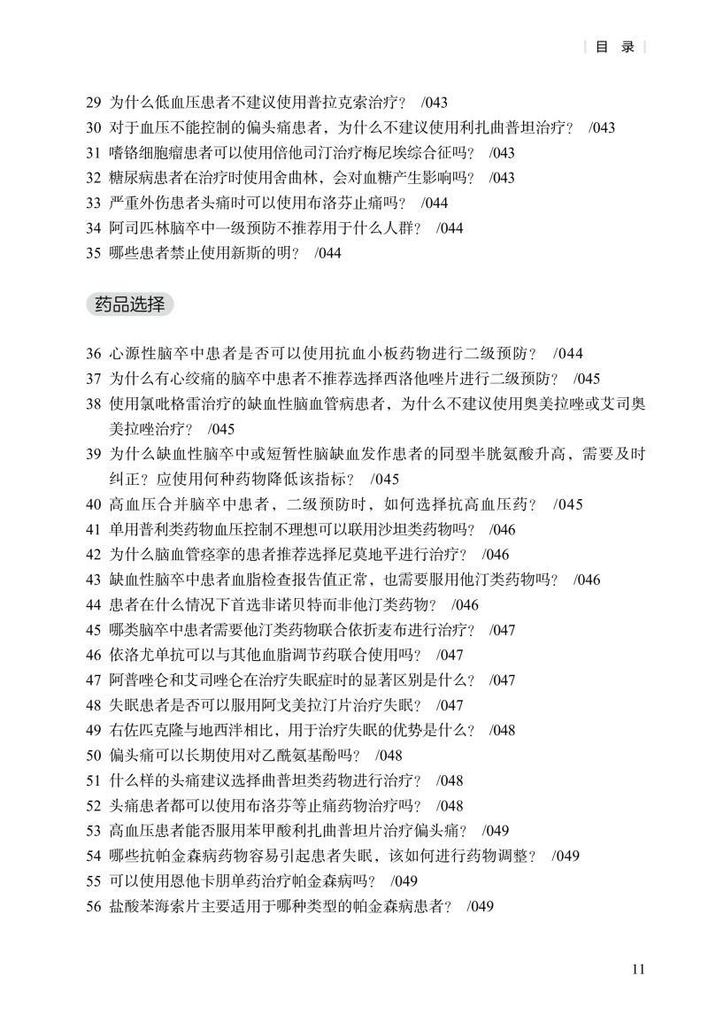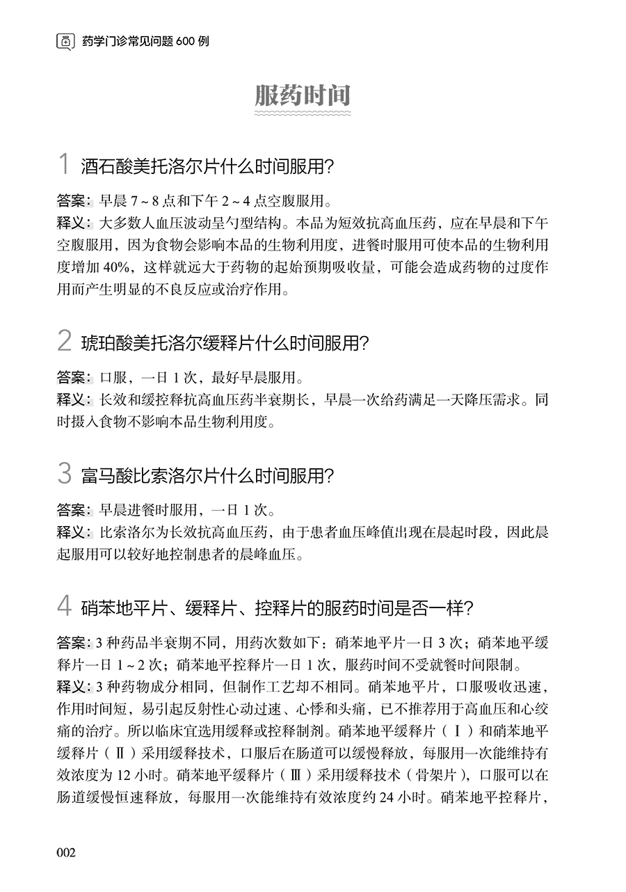 书稿主要分为五个专业方向,分别为心血管内科常见问题、呼吸内科常见问题、神经内科常见问题、内分泌科常见问题、儿科常见问题,每个专业方向包含100余个问题,每个问题都包含,题目、答案和释义三部分内容。所列问题及答案力求贴近药学门诊患者的实际提问和药师的回答。问题所包含的类别包括:药品选择、给药时机、用法用量、特殊人群用药、用药相关检查检验、注意事项、医患沟通等;答案尽量简明扼要,方便药师指导患者用药;在释义中解释相关问题所涉及的专业知识,确保专业性和准确性。