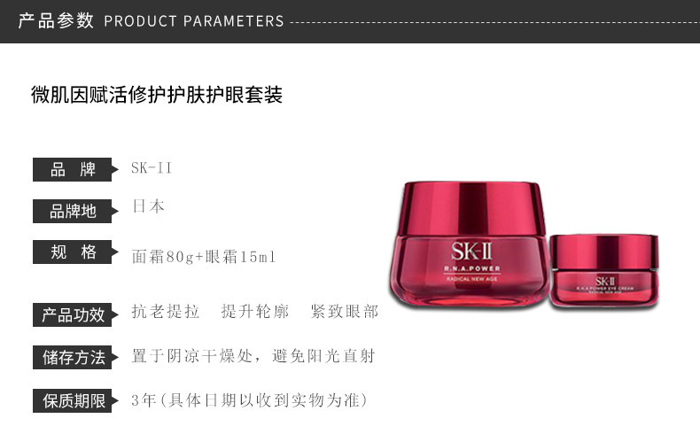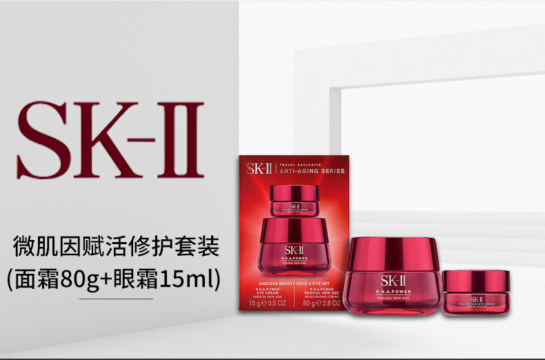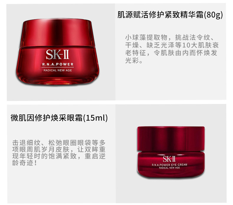 SK-II微肌因修护焕采护眼护肤套装【眼霜 15g+面霜80g】,眼霜富含RNArchitect Complex¹成分,并揉合棕榈酰五肽-4与小球藻萃取物的活力,为眼周肌肤注入源源不断的紧致能量,易于被肌肤吸收,让双眸感觉更年轻。 双眸变得更大更明亮,打造迷人大眼!面霜紧致毛孔,细致肤质,令肌肤饱满有弹性!