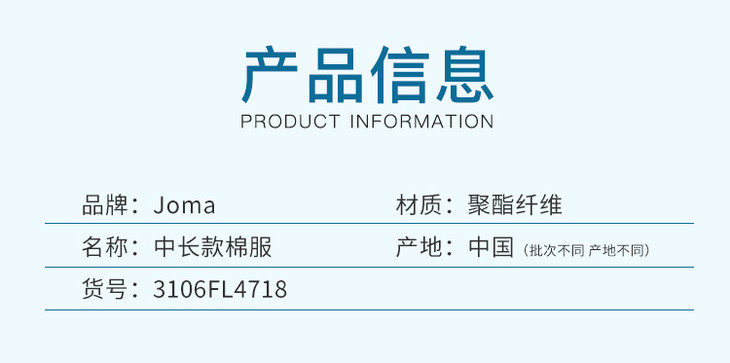 JOMA/霍马 冬季中长款保暖棉服3106FL4718