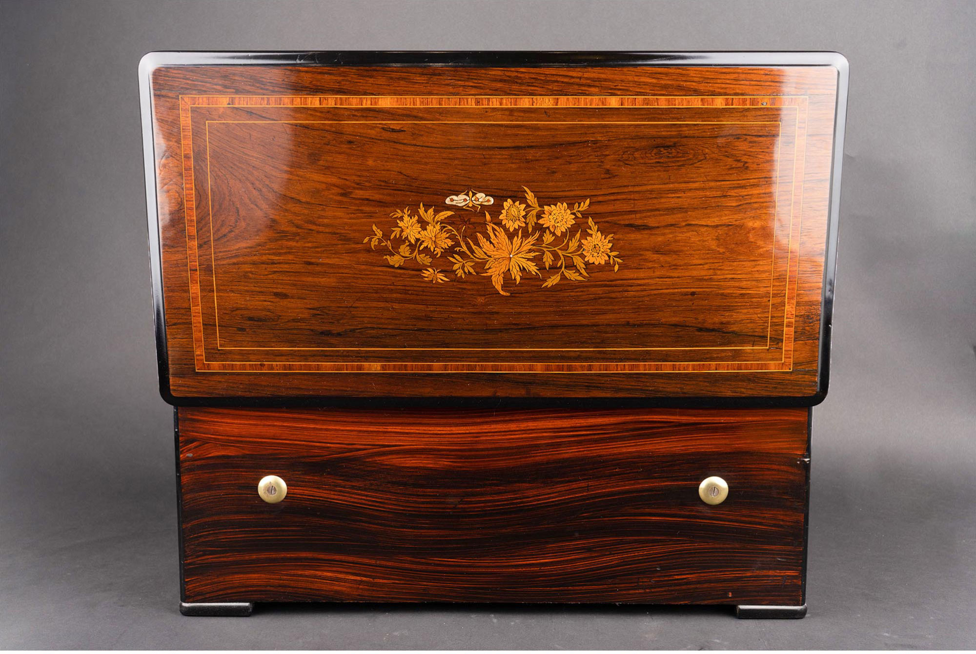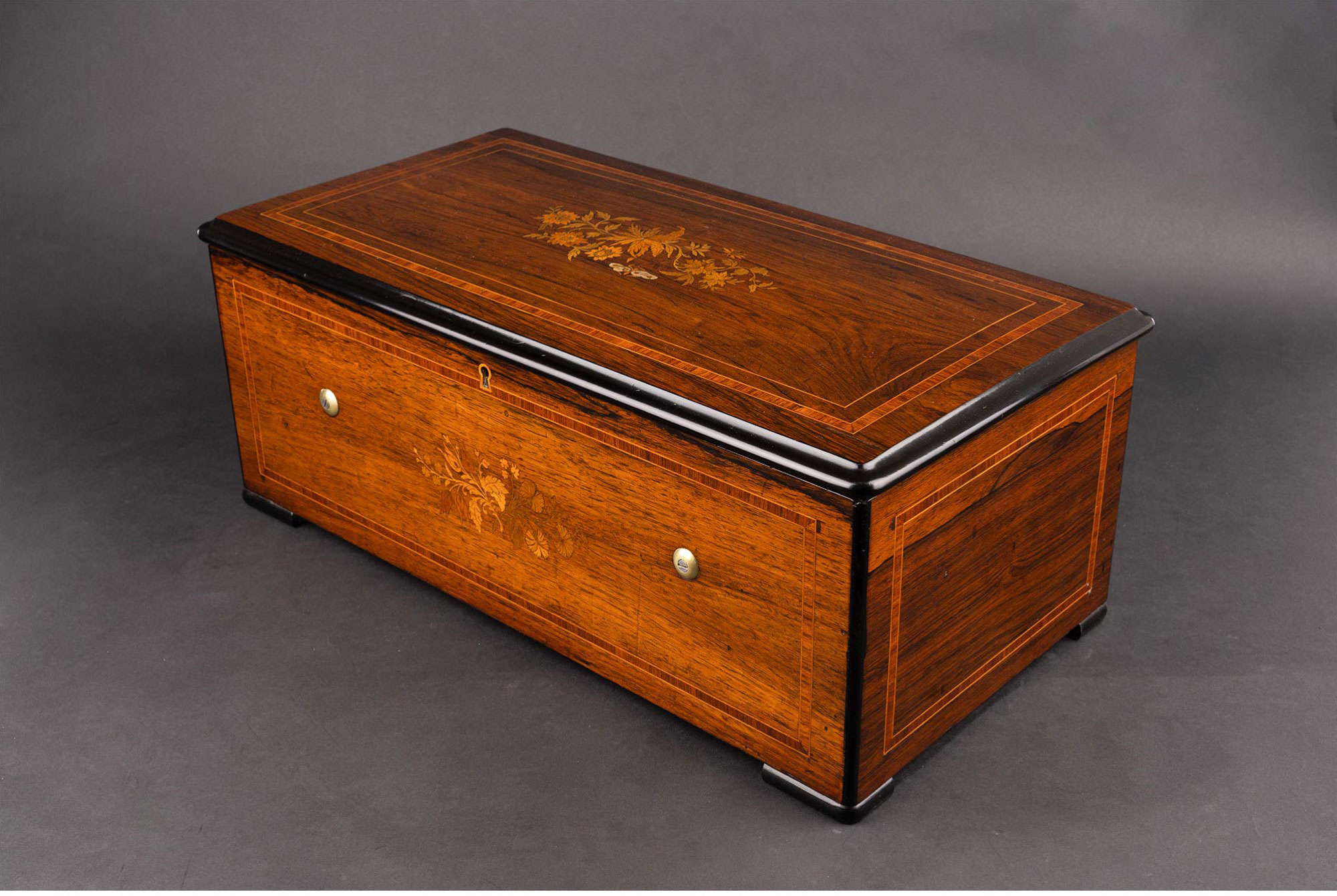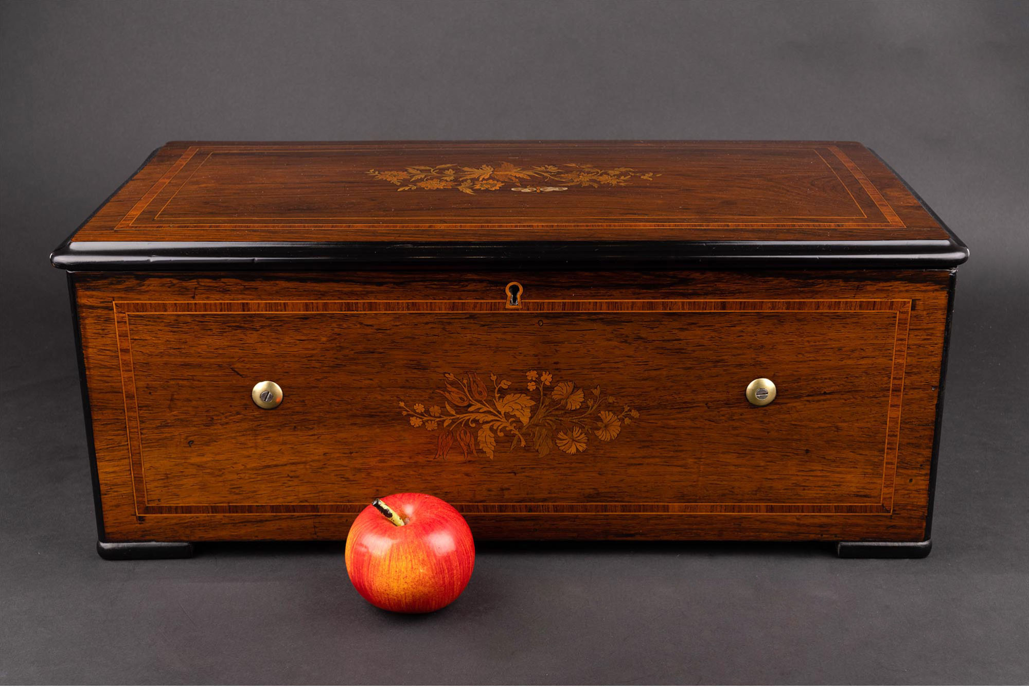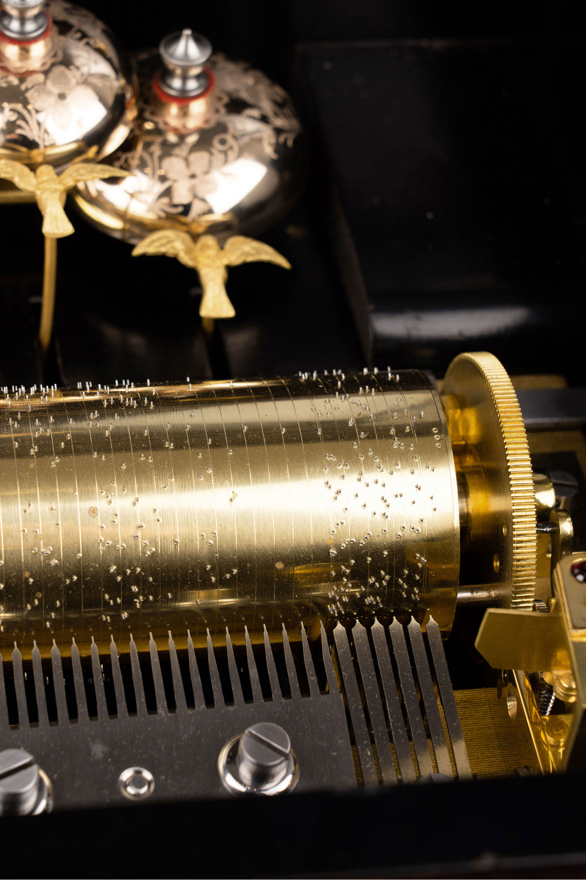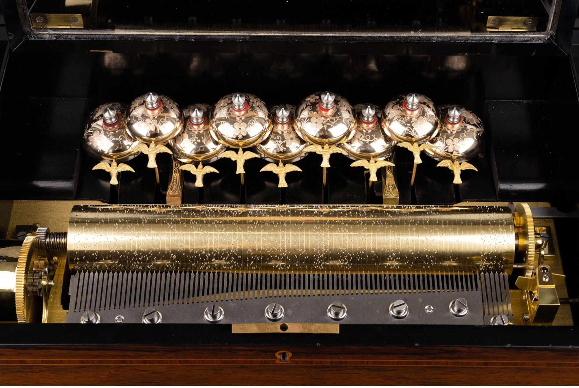 1870年代瑞士出品细木镶嵌外箱滚轴式美人鱼铃铛音乐盒